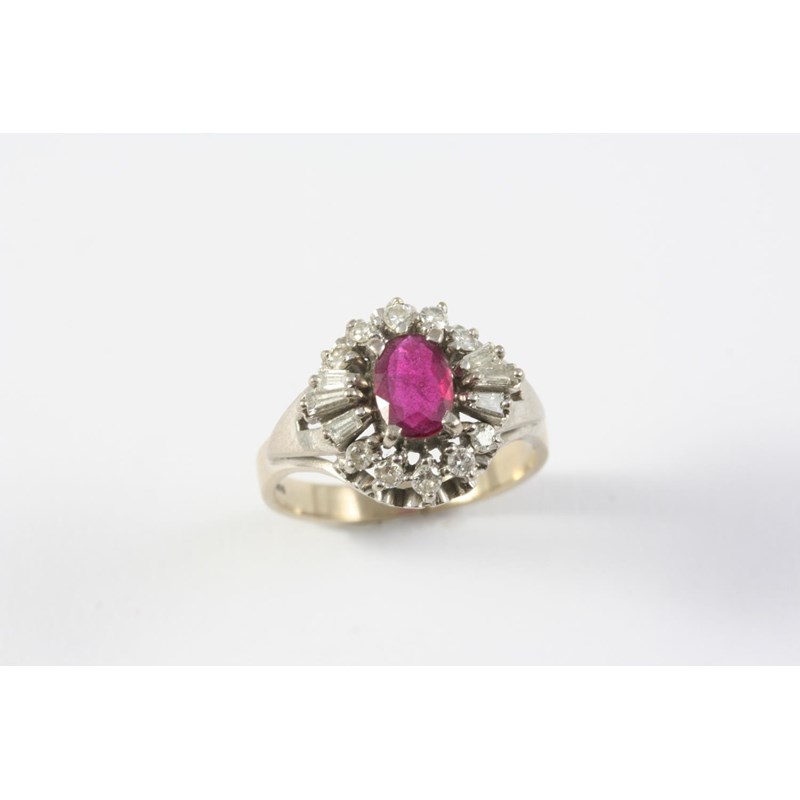 the oval-shaped ruby is set within a surround of circular-cut and tapered baguette-cut diamonds, in 18ct gold. Size P 1/2