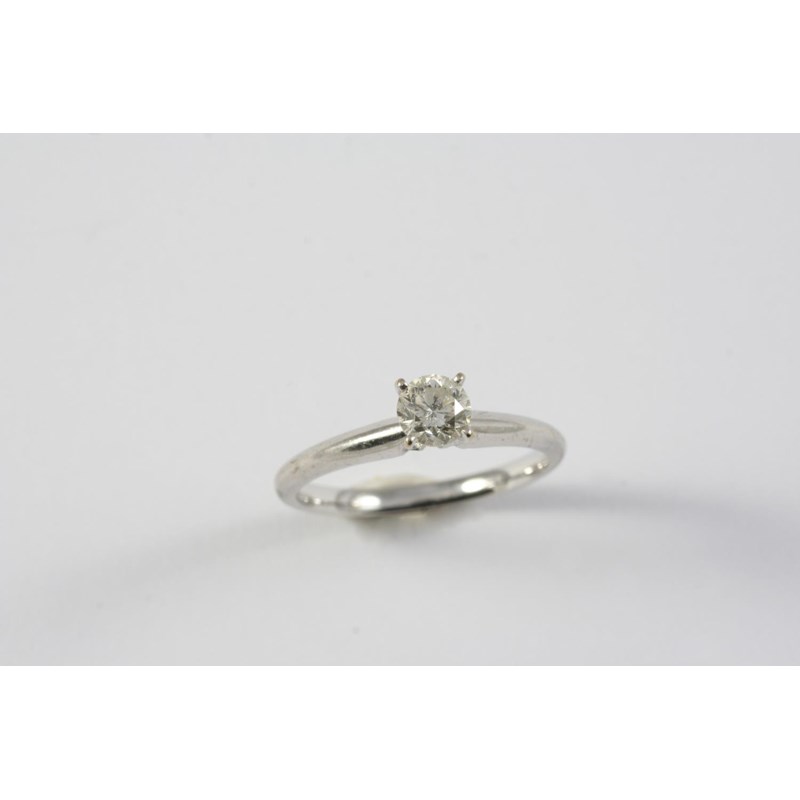 A DIAMOND SOLITAIRE RING set with a circular brilliant-cut diamond, in white gold. Size N