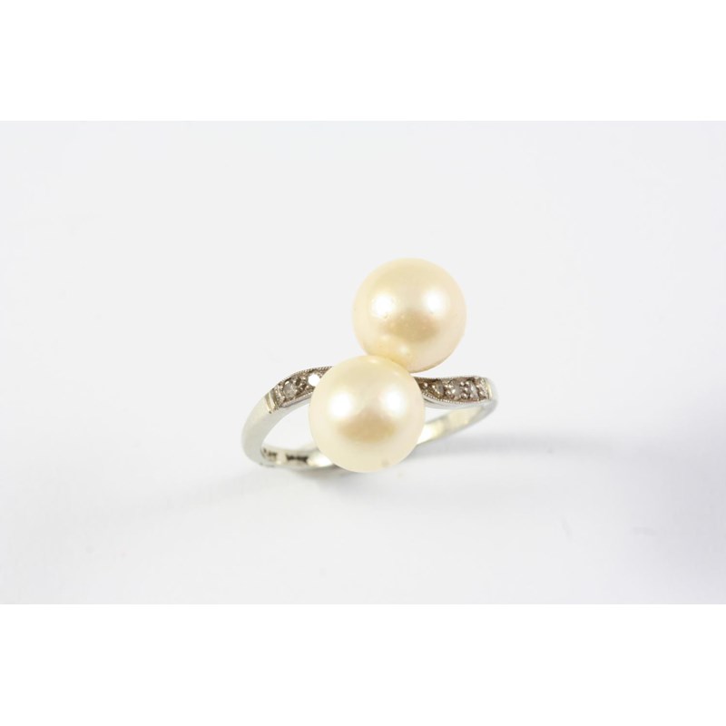 set with two cultured pearls, with small diamonds to each shoulder, in platinum and 18ct white gold. Size N