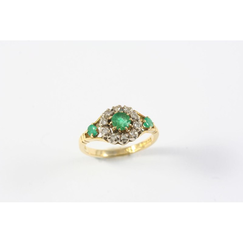 the circular-cut emerald is set within a surround of circular-cut diamonds, with a circular-cut emerald set to each shoulder, in 18ct gold. Size J