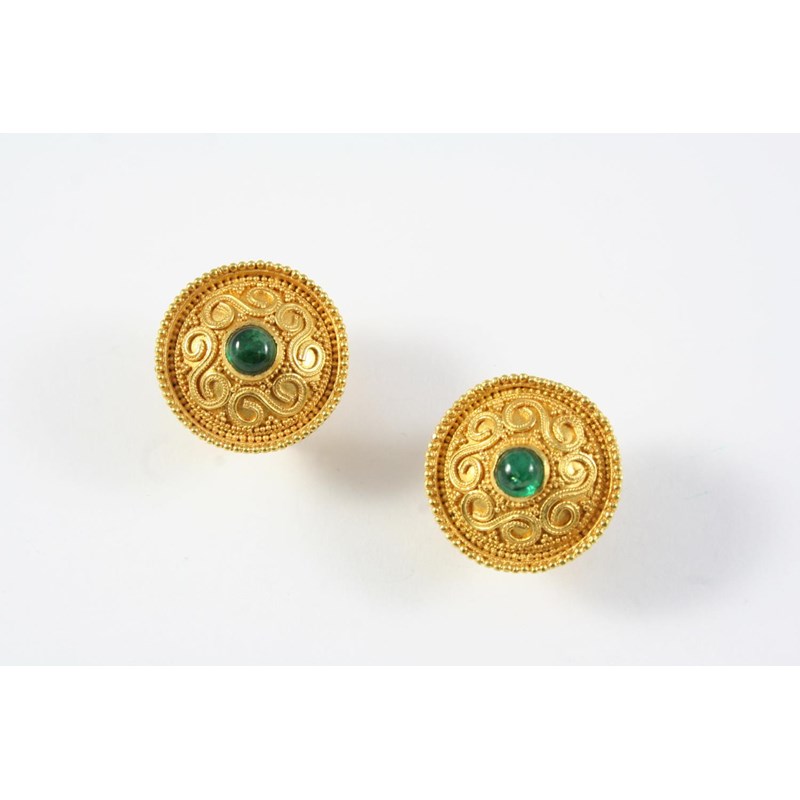 each earring centred with a cabochon emerald within a 22ct gold mount with embossed rope and ball decoration, maker's mark to the reverse, 2.2cm dia