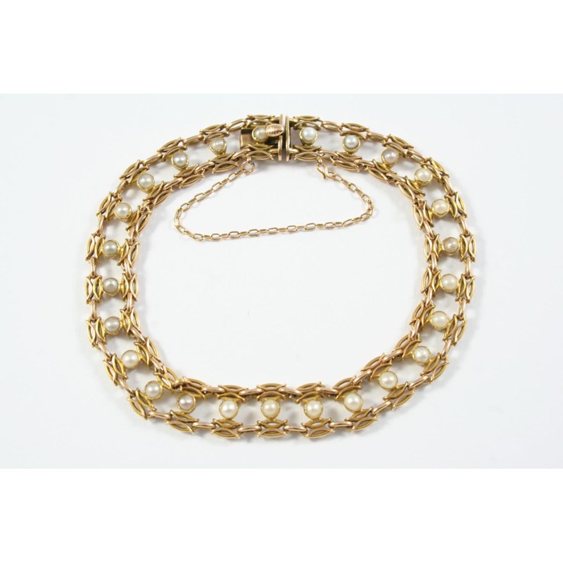 A GOLD AND PEARL SET FANCY LINK BRACELET mounted with small half pearls, with concealed clasp, 20cm long, 14 grams