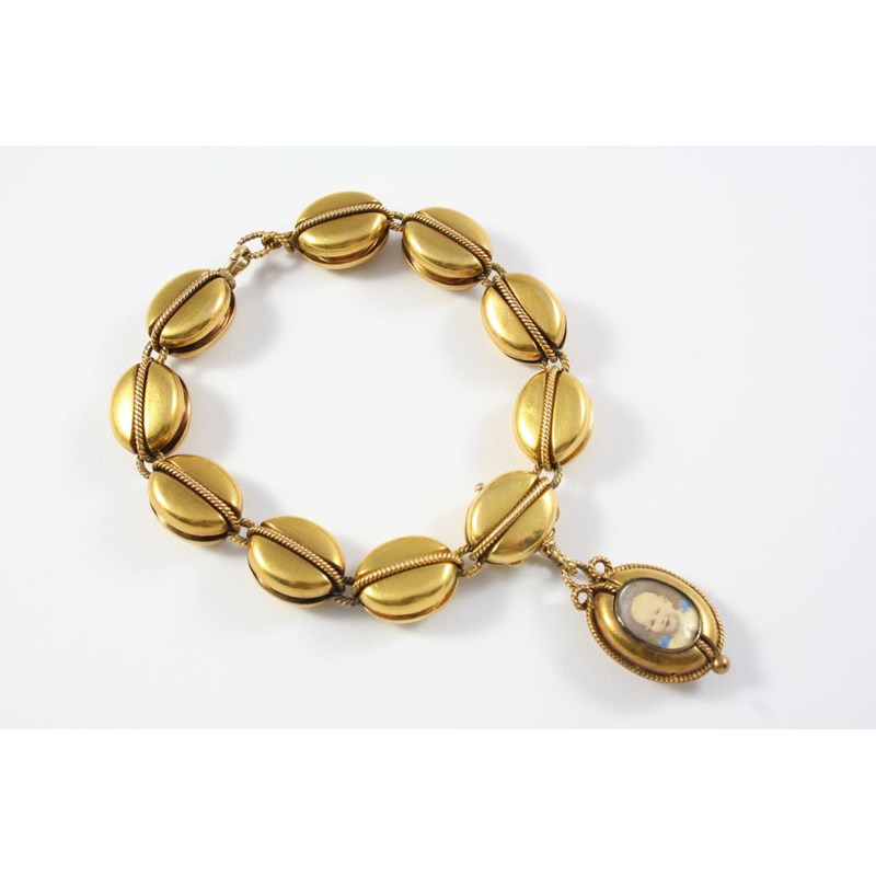 A VICTORIAN GOLD BRACELET formed with oval links with reeded decoration, suspending a locket pendant, 20cm long, 33 grams. With fitted box