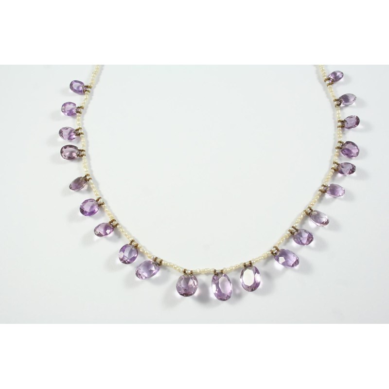 AN AMETHYST AND PEARL NECKLET the graduated oval-shaped amethyst drops are suspended from a row of small pearls, 35.5cm long