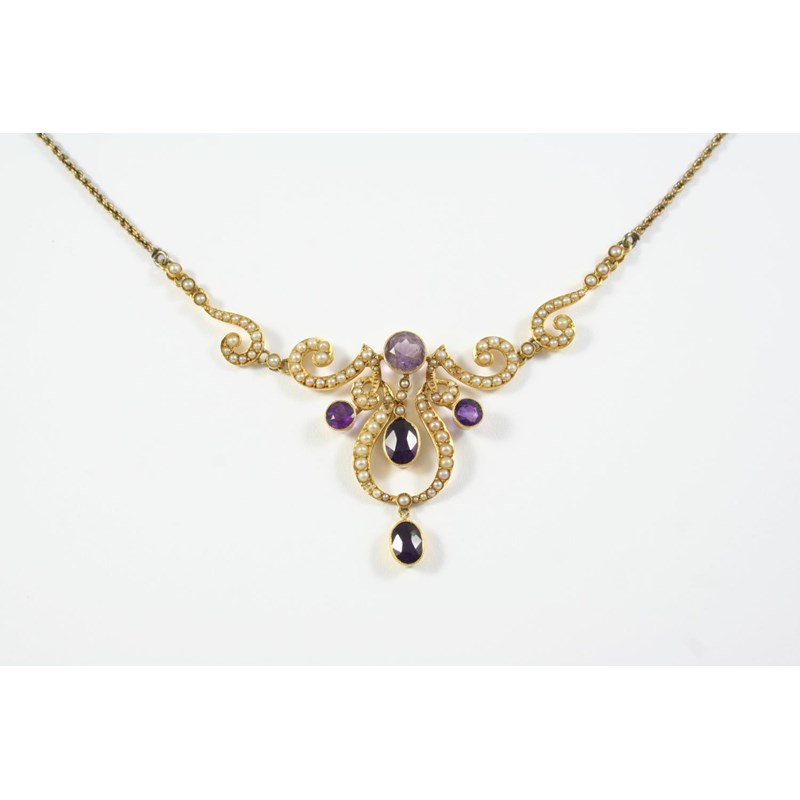 AN EDWARDIAN AMETHYST AND PEARL SET NECKLACE