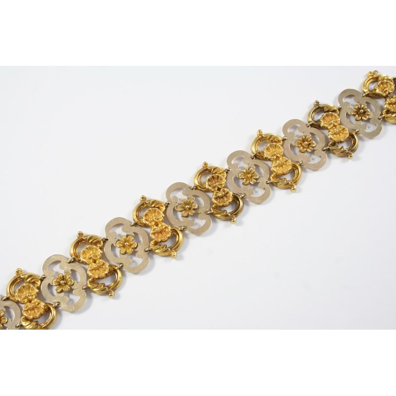 formed alternately with gold panels mounted with foliate and shell decoration, with concealed clasp, 18cm long, 16.7 grams. In fitted case