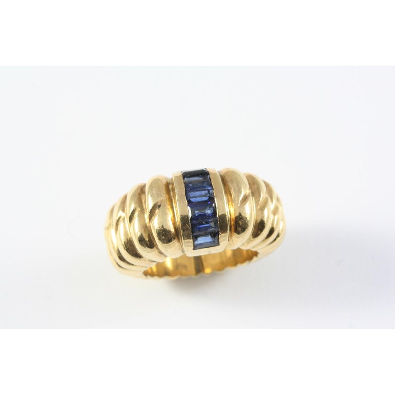 A SAPPHIRE AND GOLD RING the 18ct gold graduated ridged mount is set with six calibre-cut sapphires. Size K 1/2