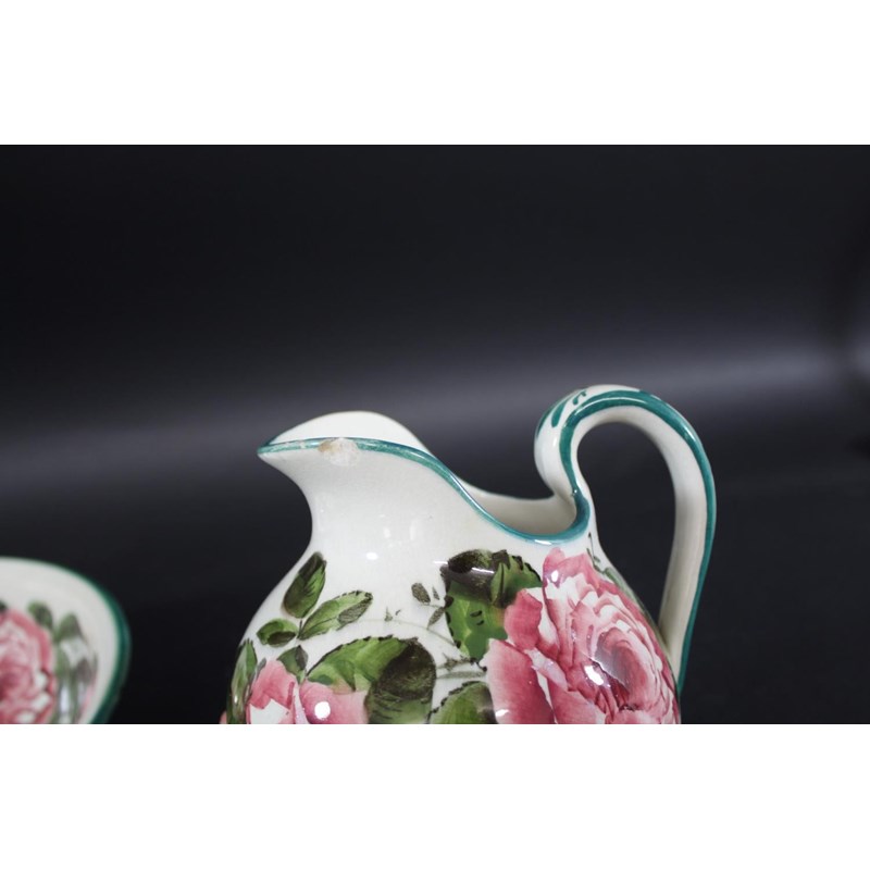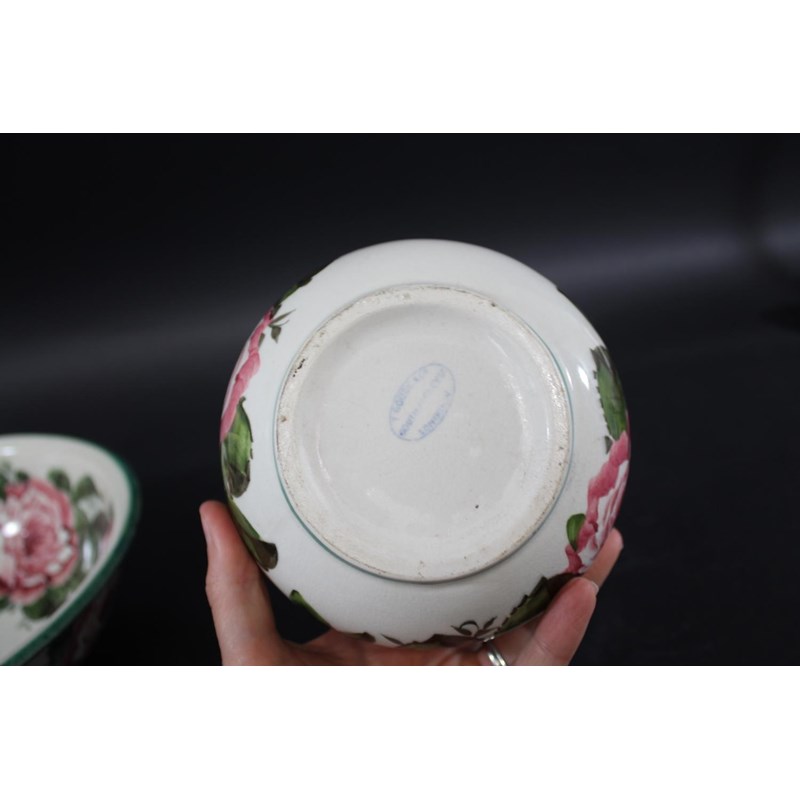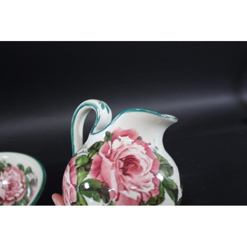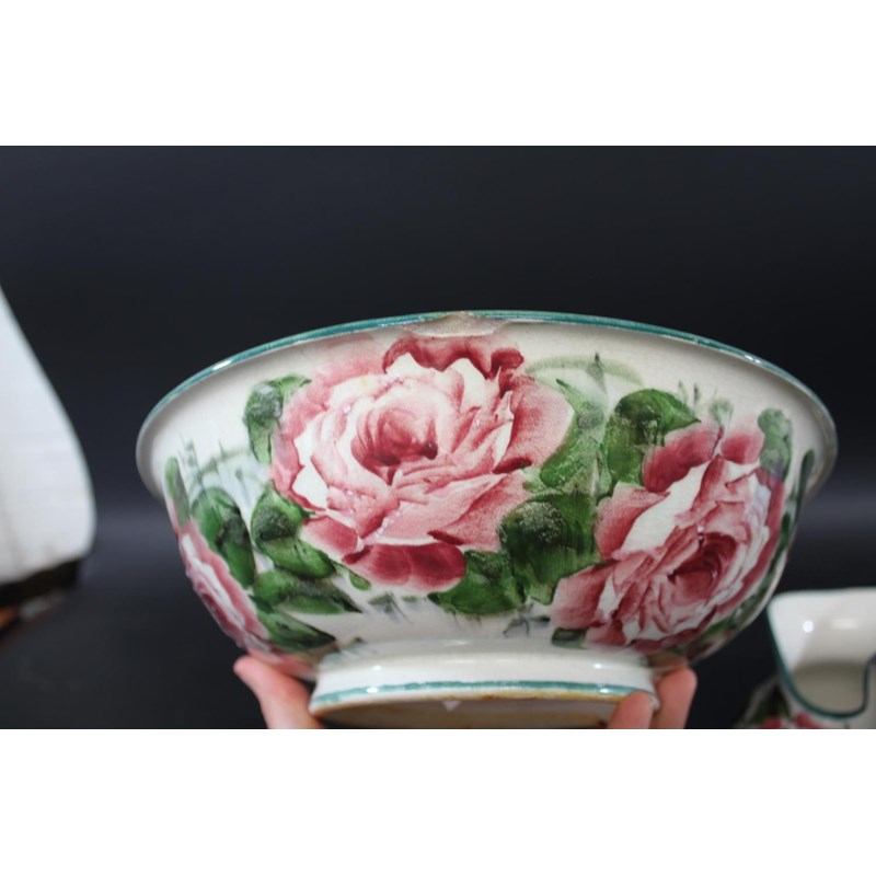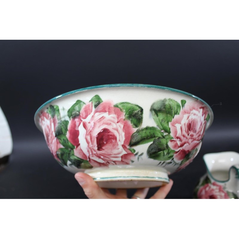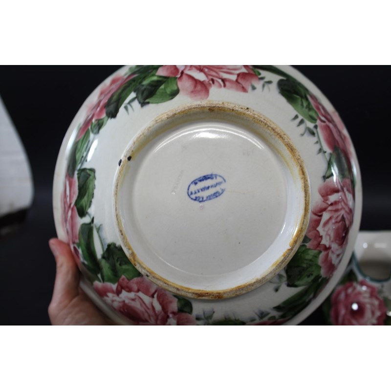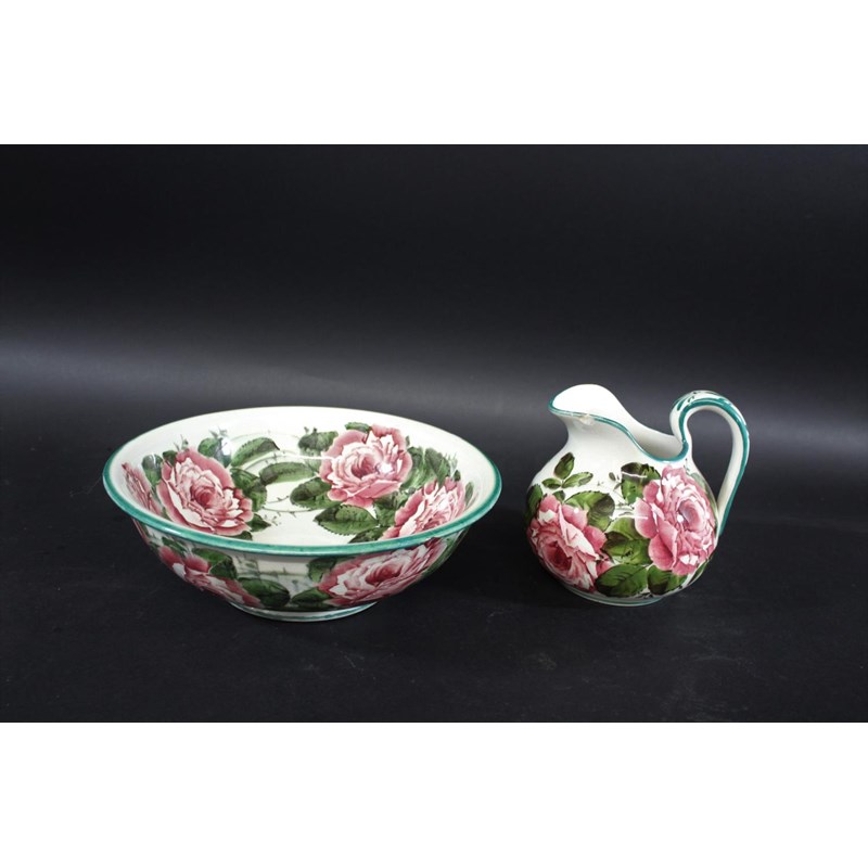 a circular washstand bowl painted with cabbage roses and leaves, and with a green painted rim. Also with a matching washstand jug, both with damages. Bowl 28cms diameter, jug 16cms high. Impressed marks Wemyss, and mark for T Goode & Co. (2)