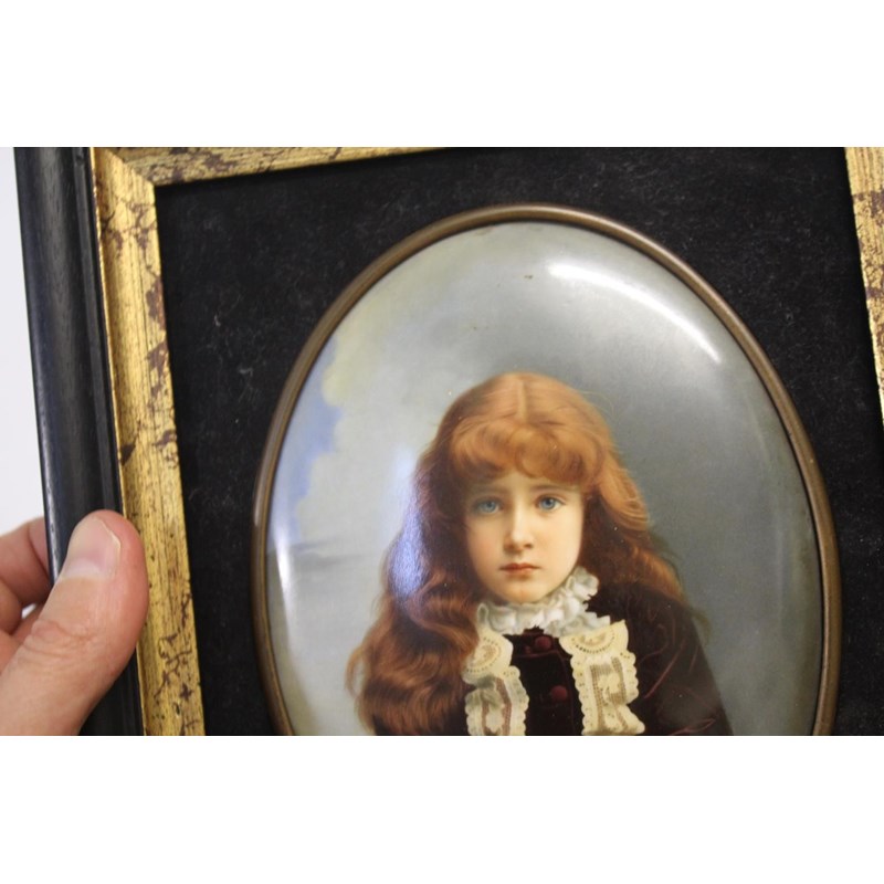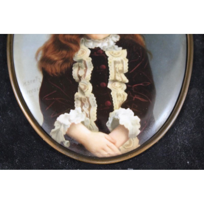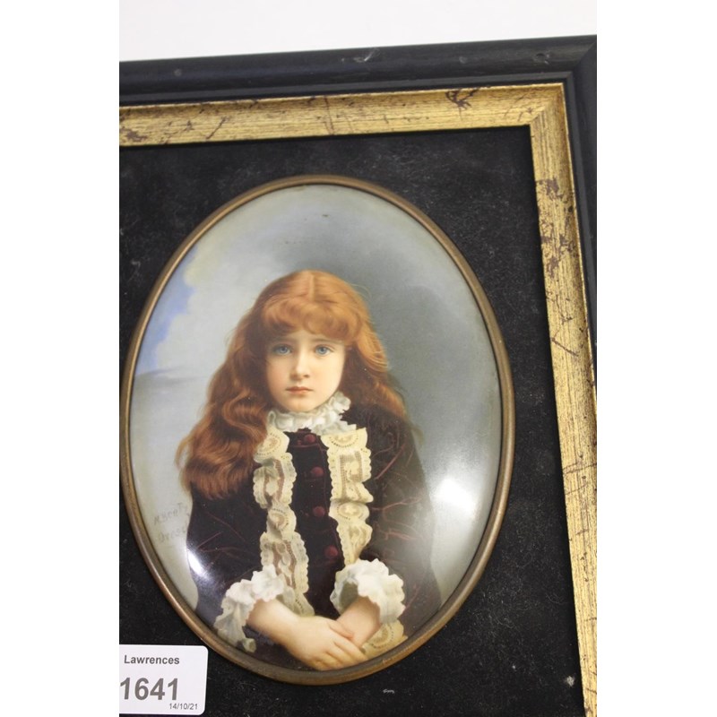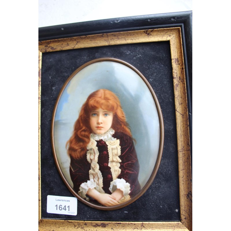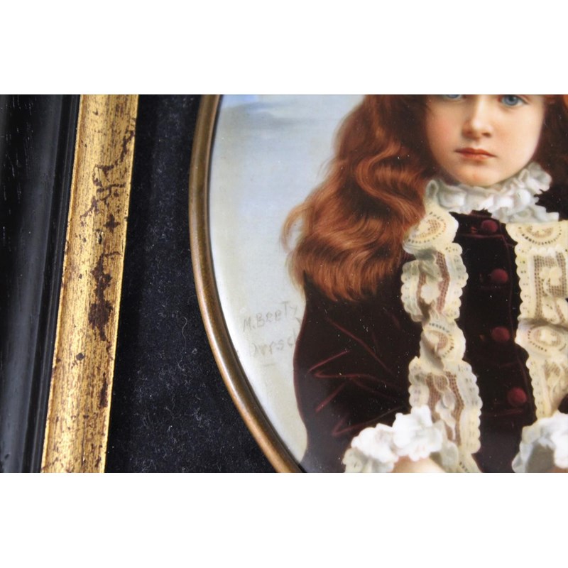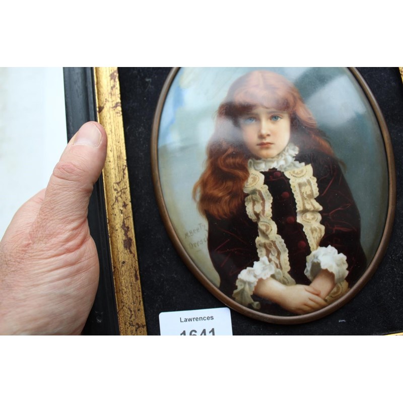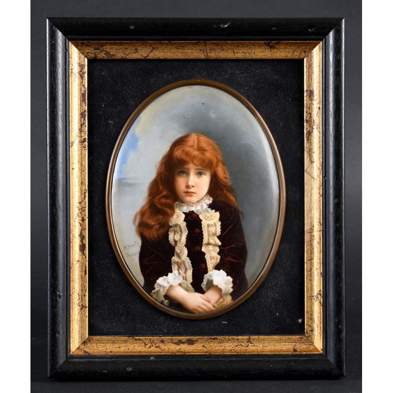 an oval plaque painted with a 3/4 length portrait of a girl with red hair, wearing velvet clothing and with her arms crossed. Signed, M Beetz, Dresden (only part visible). In a modern frame, plaque 17cms by 12.5cms