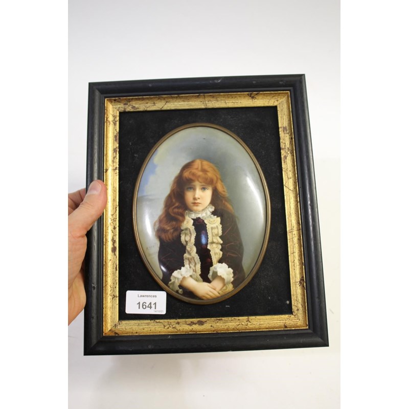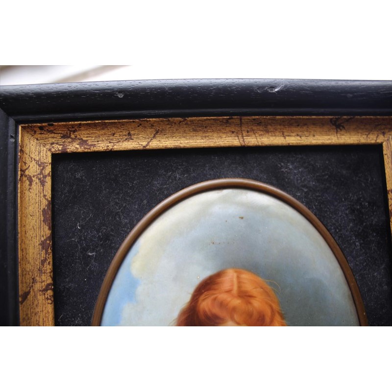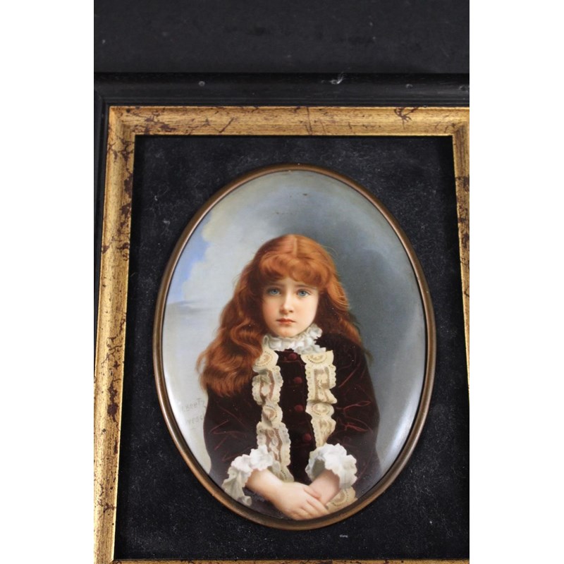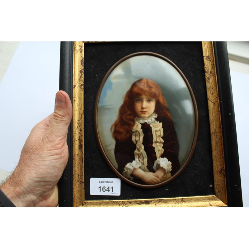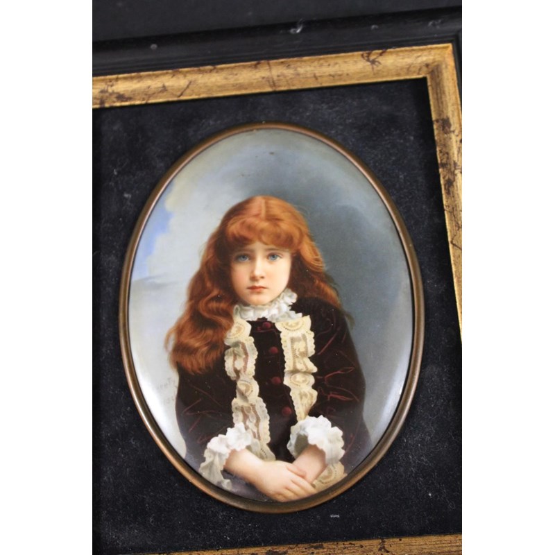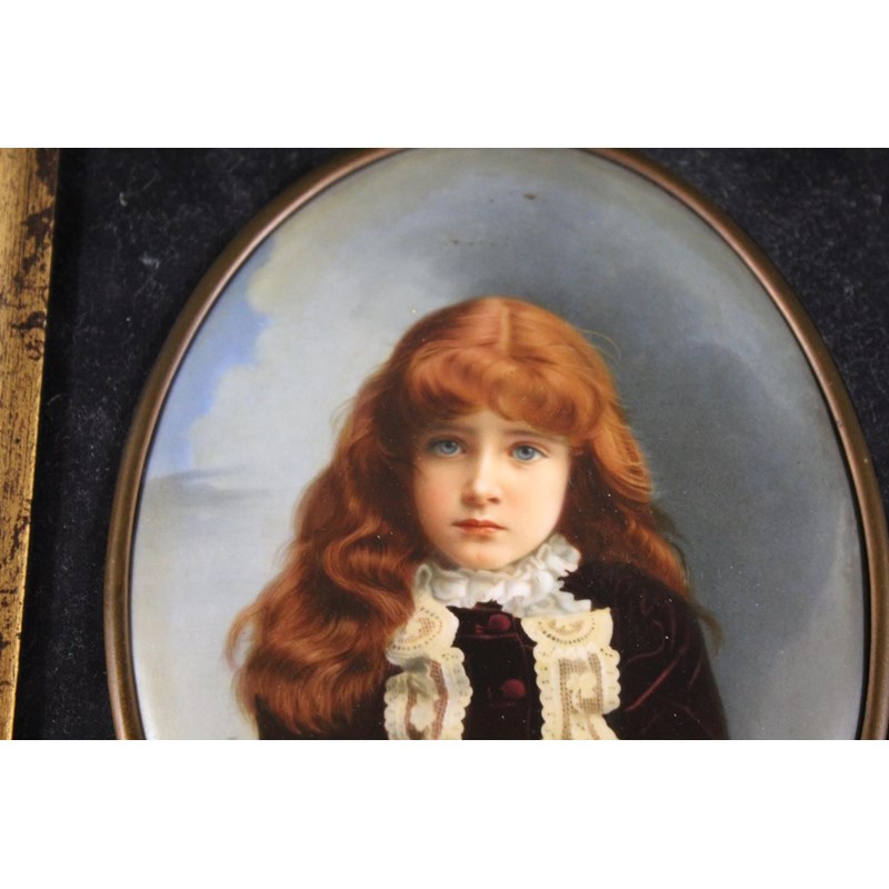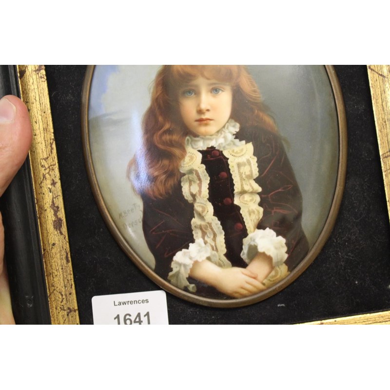an oval plaque painted with a 3/4 length portrait of a girl with red hair, wearing velvet clothing and with her arms crossed. Signed, M Beetz, Dresden (only part visible). In a modern frame, plaque 17cms by 12.5cms