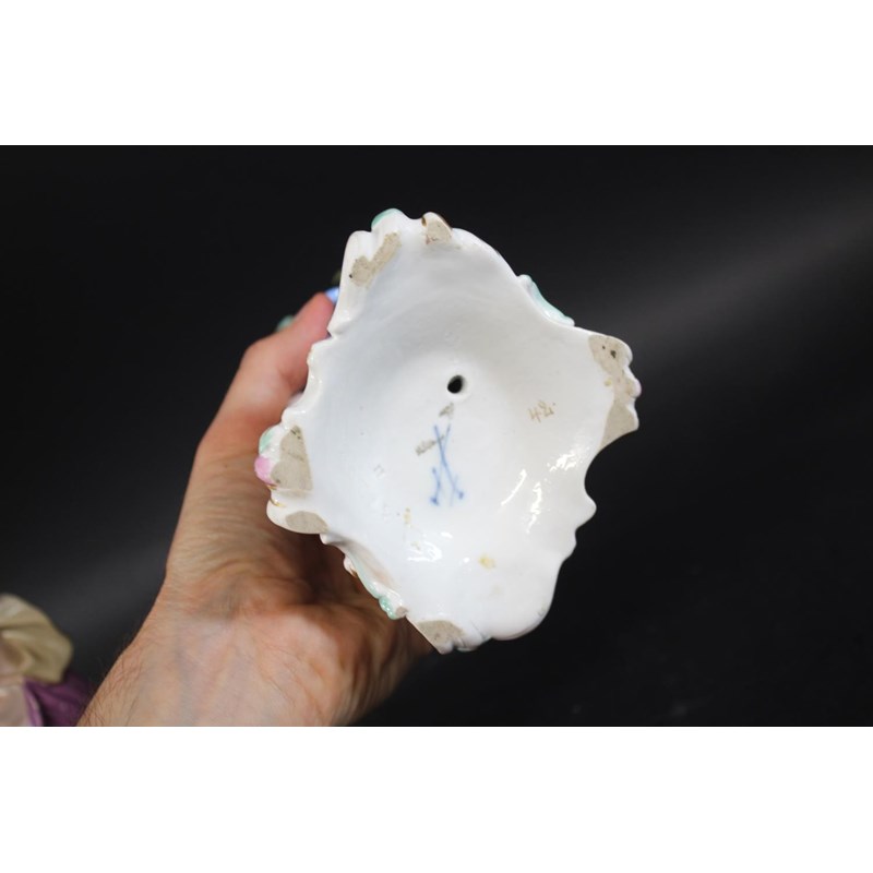 a pair of classical figures each resting against a tree branch with vines and berries on one and flowers on the other. With leaf form candle holders and scrolling rococo style bases, some damages. Crossed swords mark, 42 in gold, and impressed numbers 2732 and 3730. 29cms high. (2)