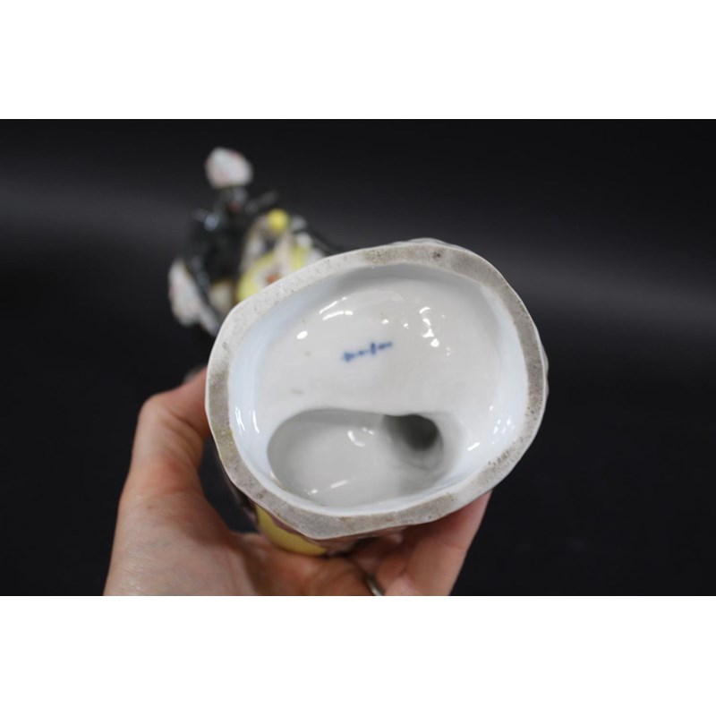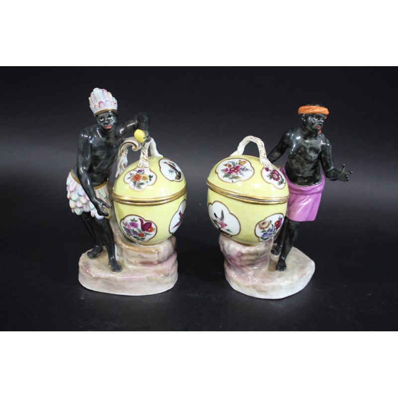 a pair of porcelain figures one with a headdress, each next to a lidded dish painted with panels of flowers and with an oval shaped base. Each with a Berlin sceptre mark in underglaze blue. 18cms high. (2)