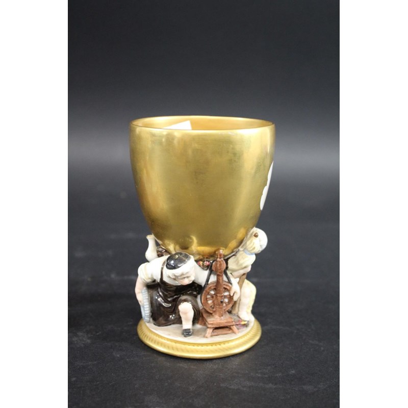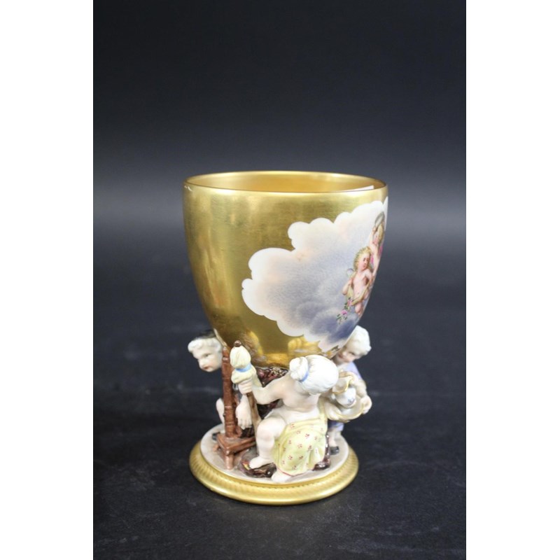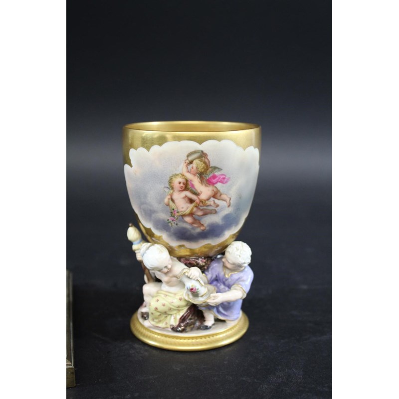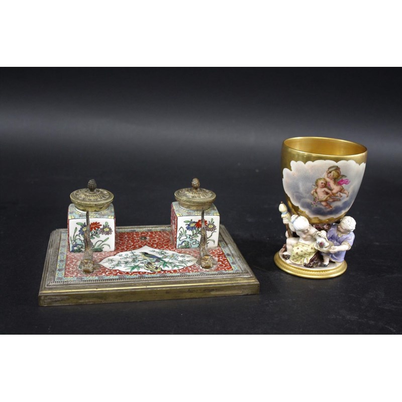 the porcelain painted with a bird and flowers within a panel, with further painted flowers to the inkwells and mounted with a metal pen holder in the form of dolphins, 20cms across. Also with an unusual continental porcelain goblet, the bowl painted with cherubs and with a gilded interior, the goblet supported by various figures around the base (hairline crack, 13cms high). (2)
