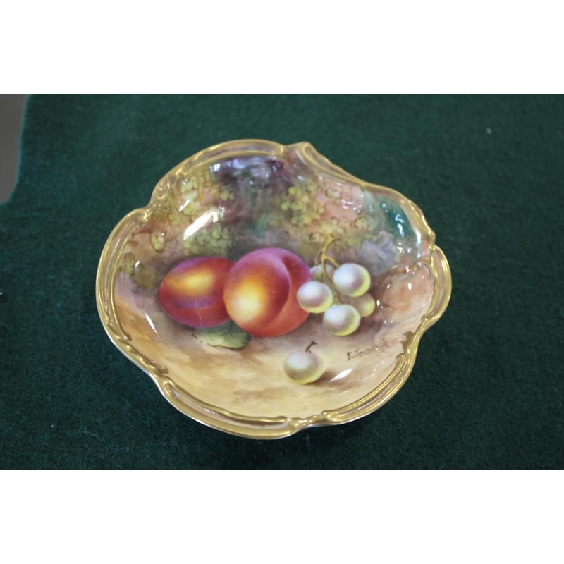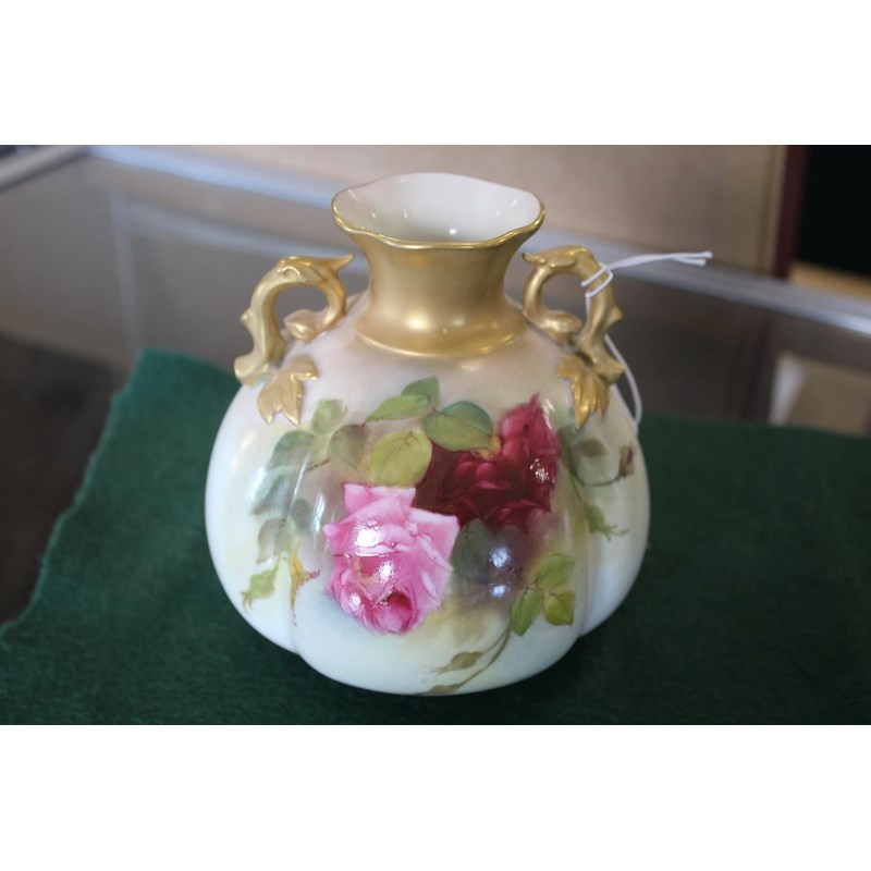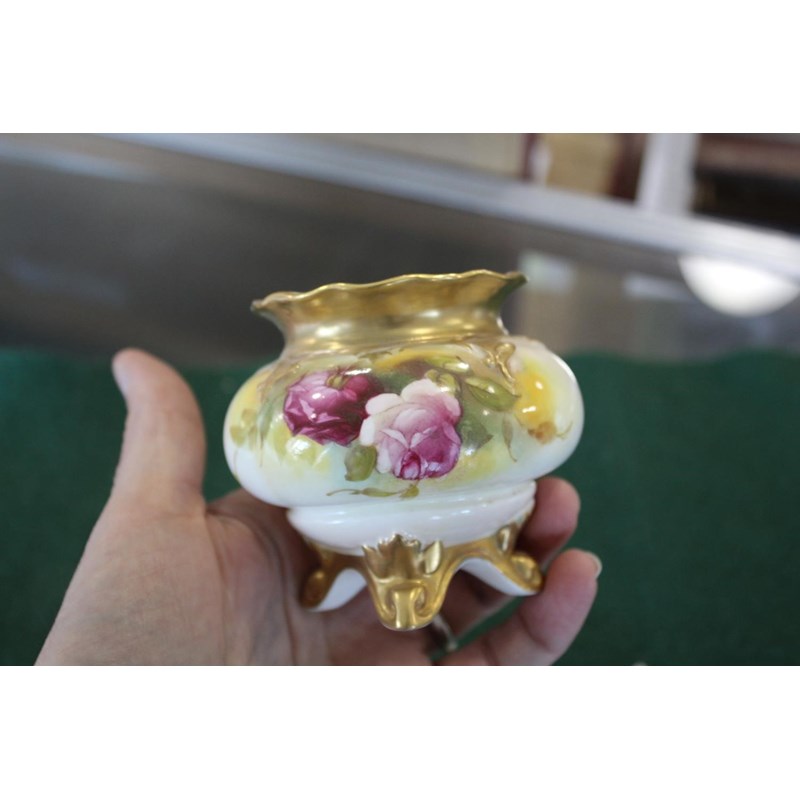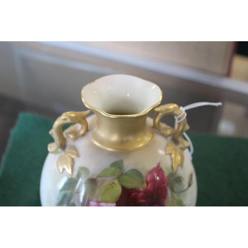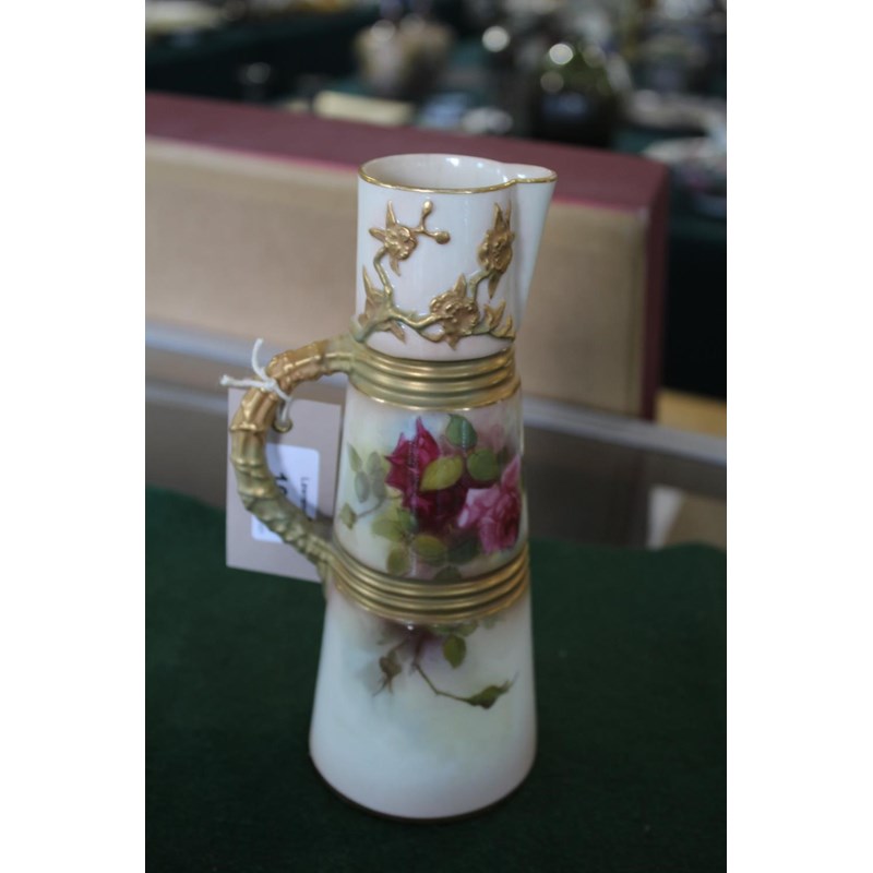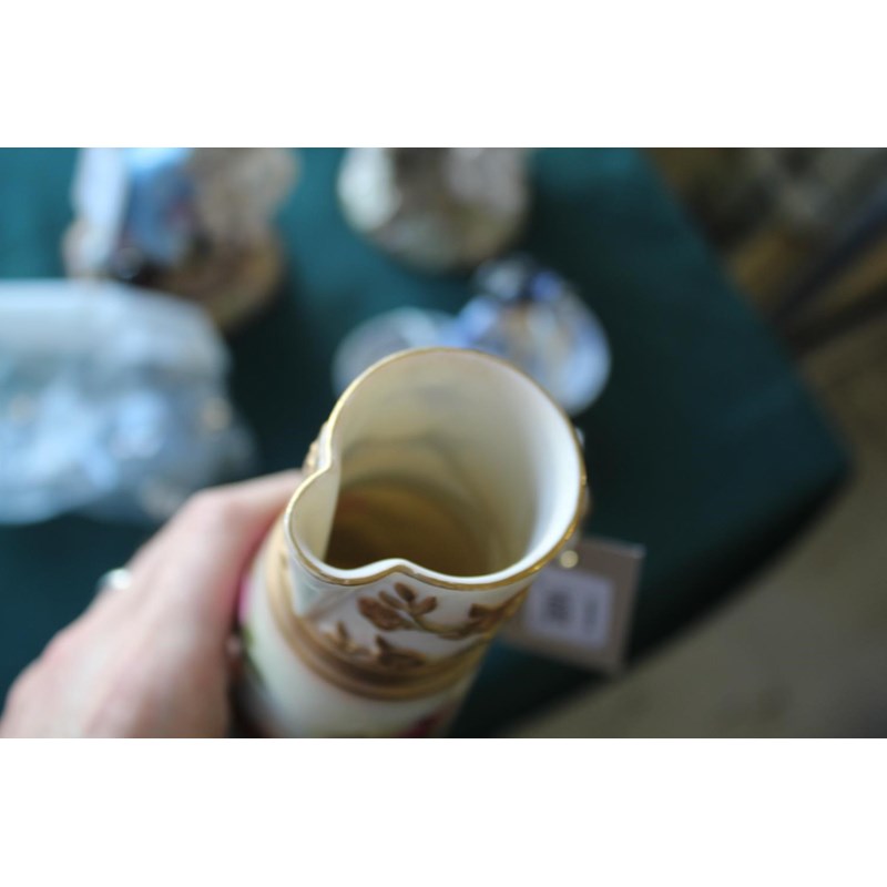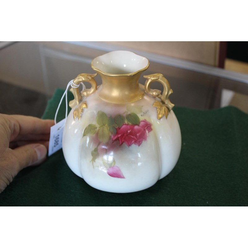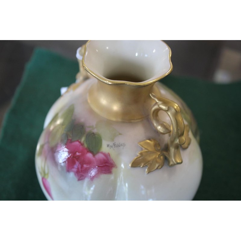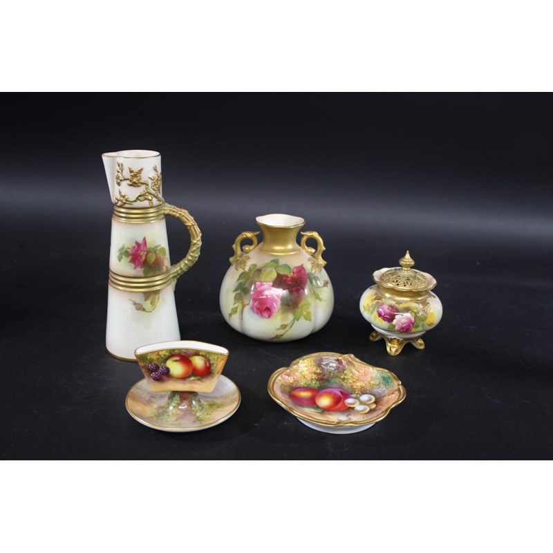 five various items including a two handled globular vase painted with roses signed E M Fildes (13cms high), and a jug of tapering form by the same artist (20.5cms high). Also with a small pot pourri signed M Hunt (11cms high), and a small dish and menu holder signed by E Townsend. (5)