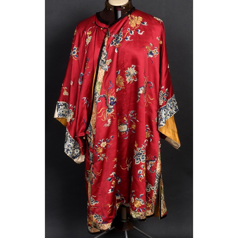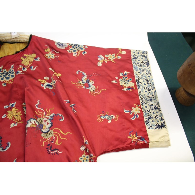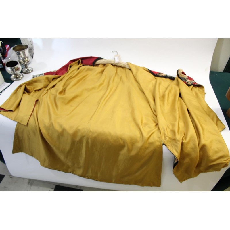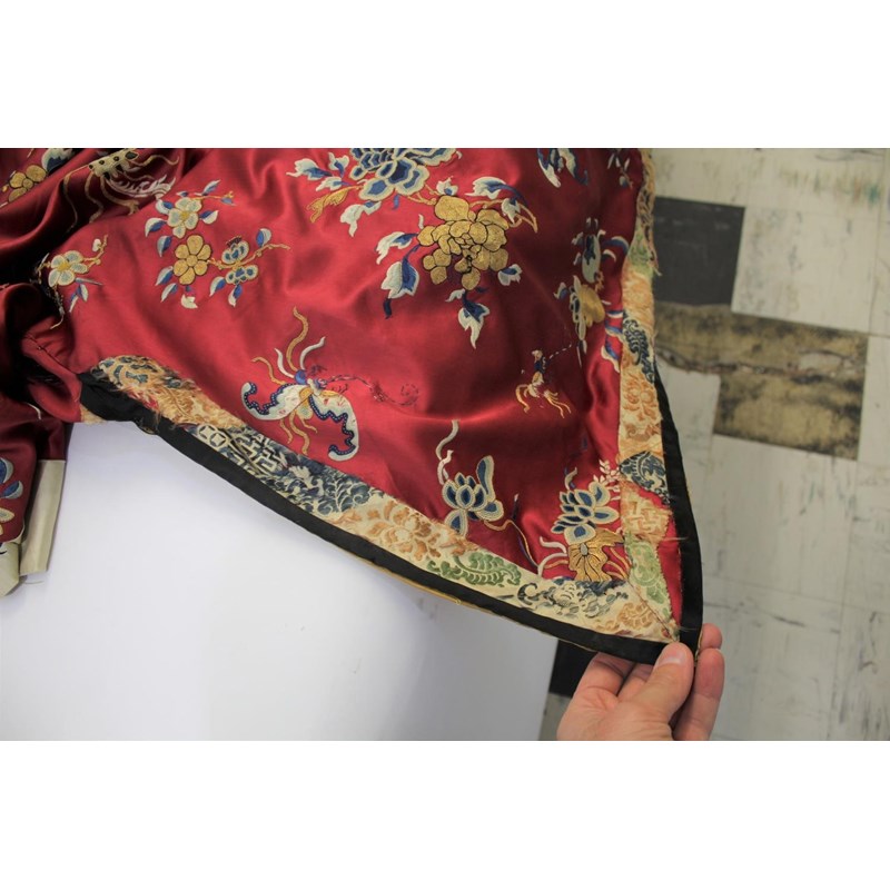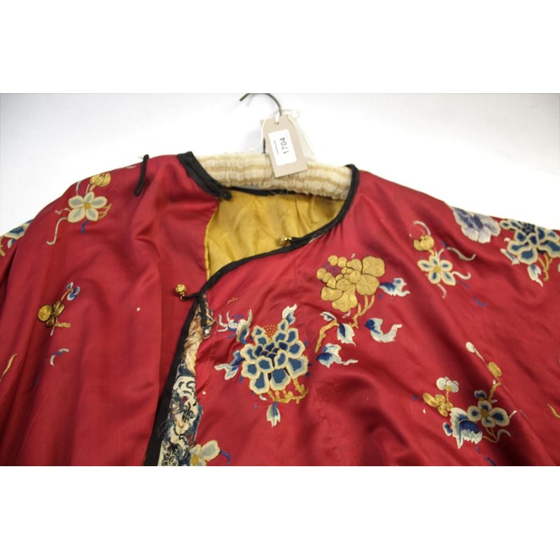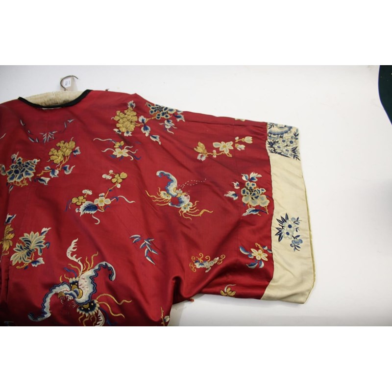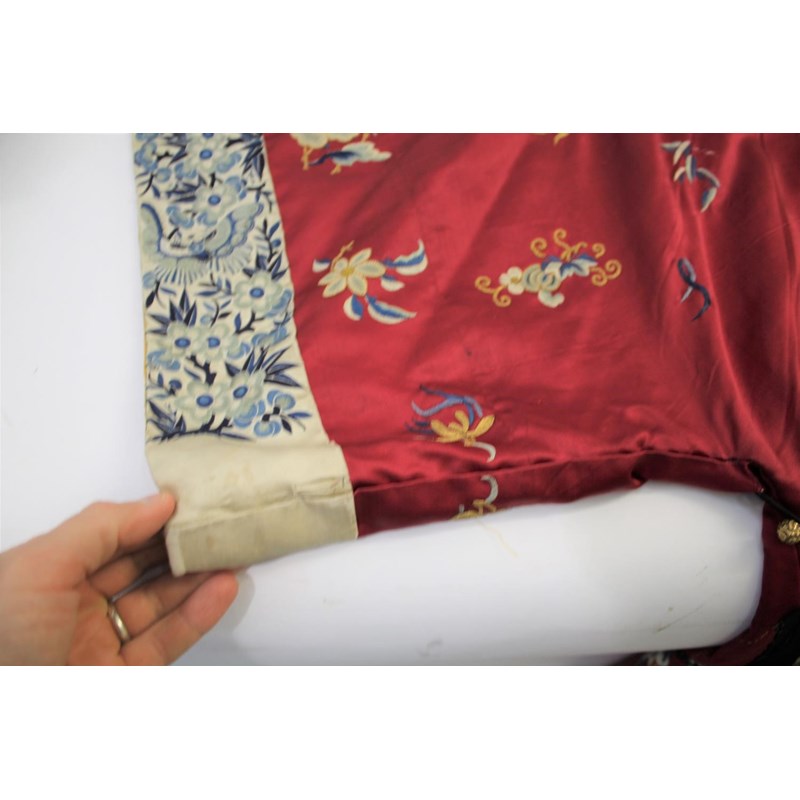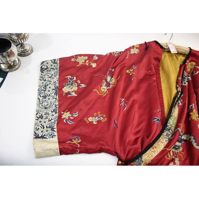 of red silk, decorated with silk and couched metallic thread embroidered images, cross over fastening and blue embroidered sleeve bands. Decorated with mythical beasts, flowers and chinese symbols, with possible alterations. 110cms high