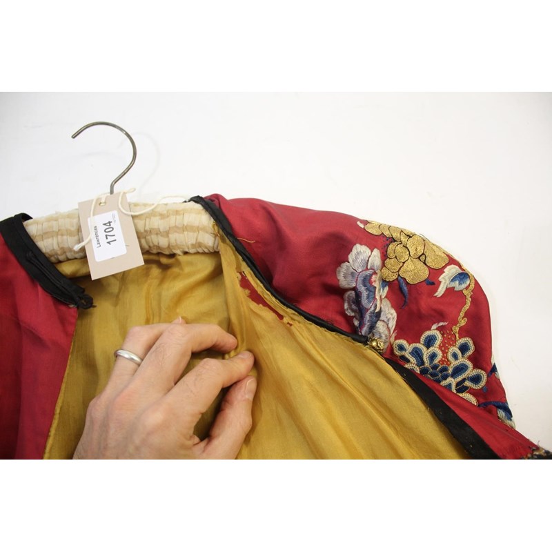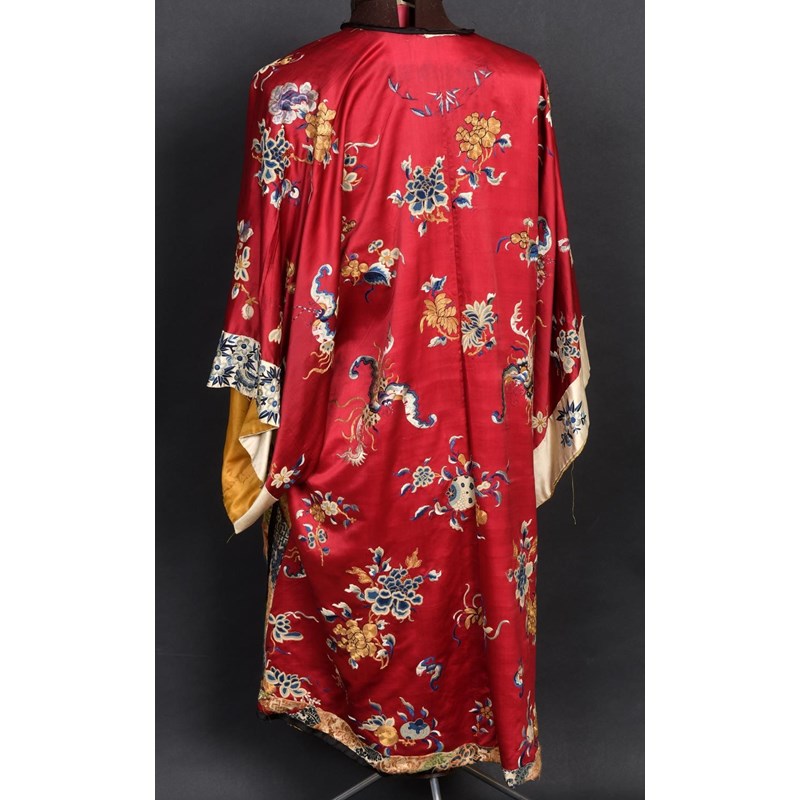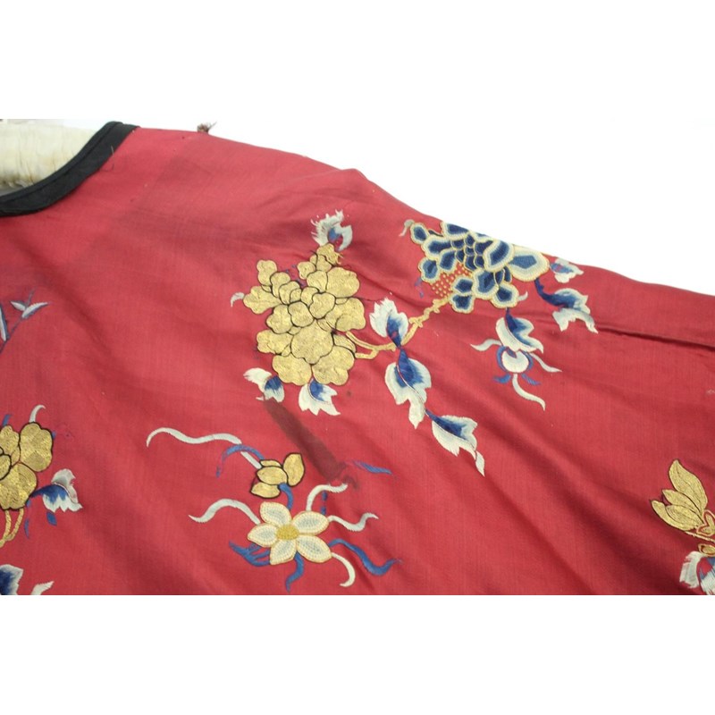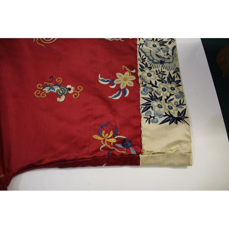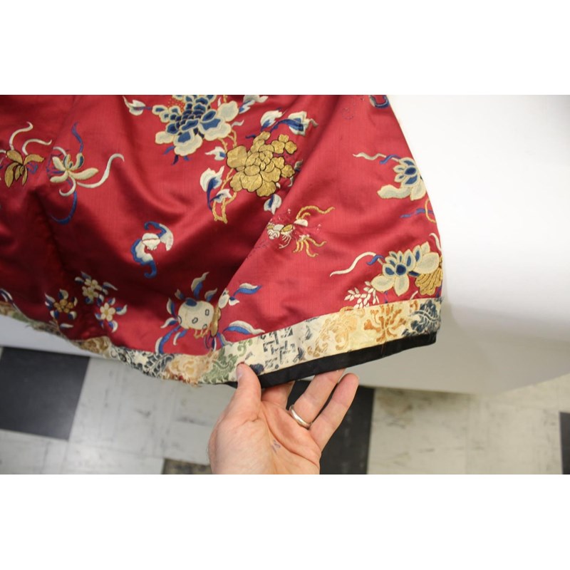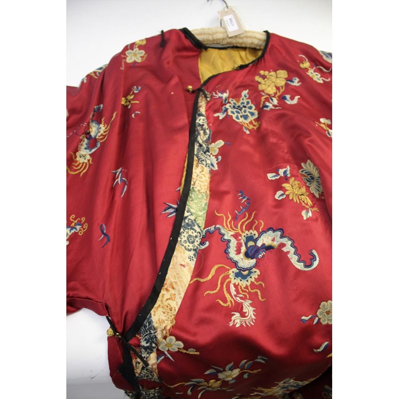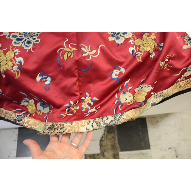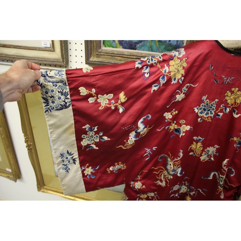 of red silk, decorated with silk and couched metallic thread embroidered images, cross over fastening and blue embroidered sleeve bands. Decorated with mythical beasts, flowers and chinese symbols, with possible alterations. 110cms high