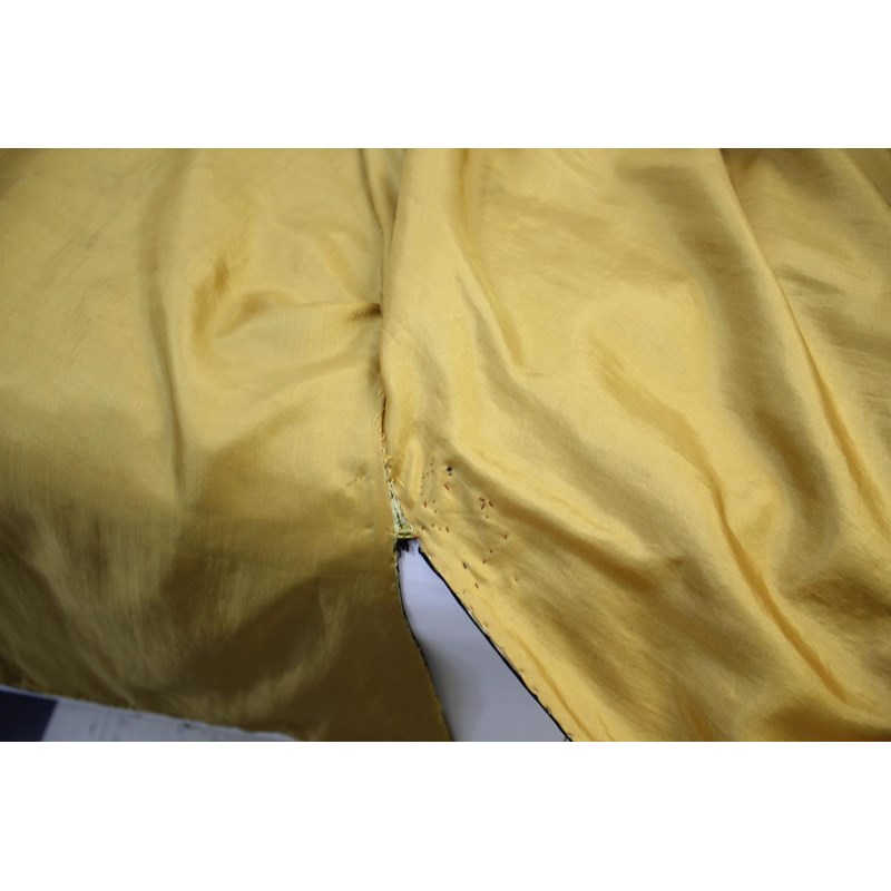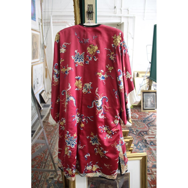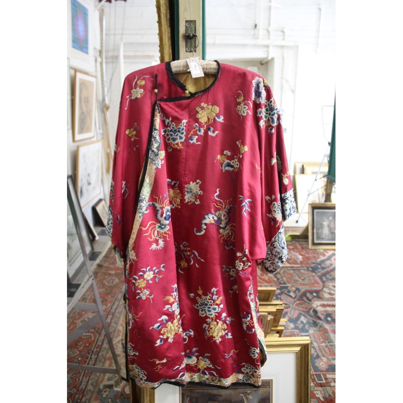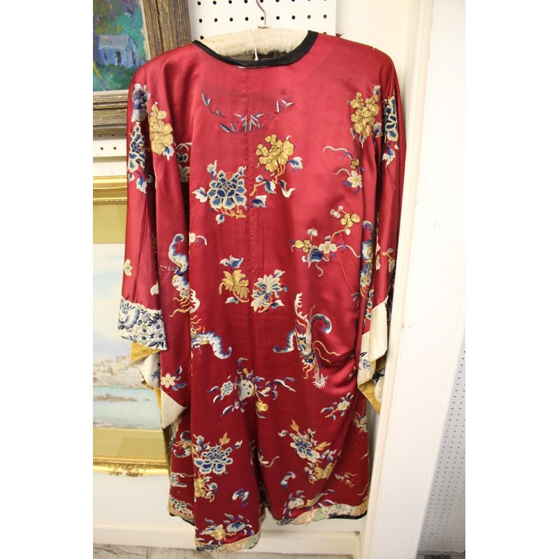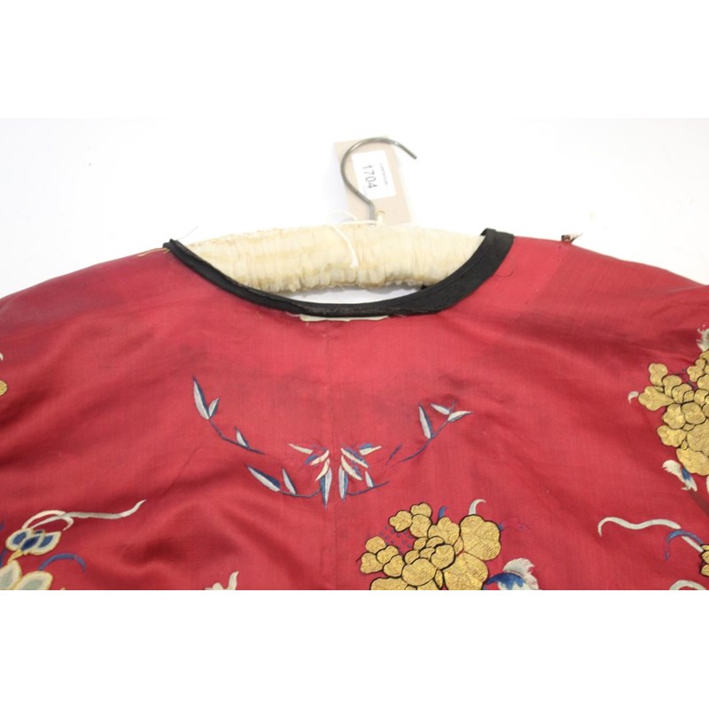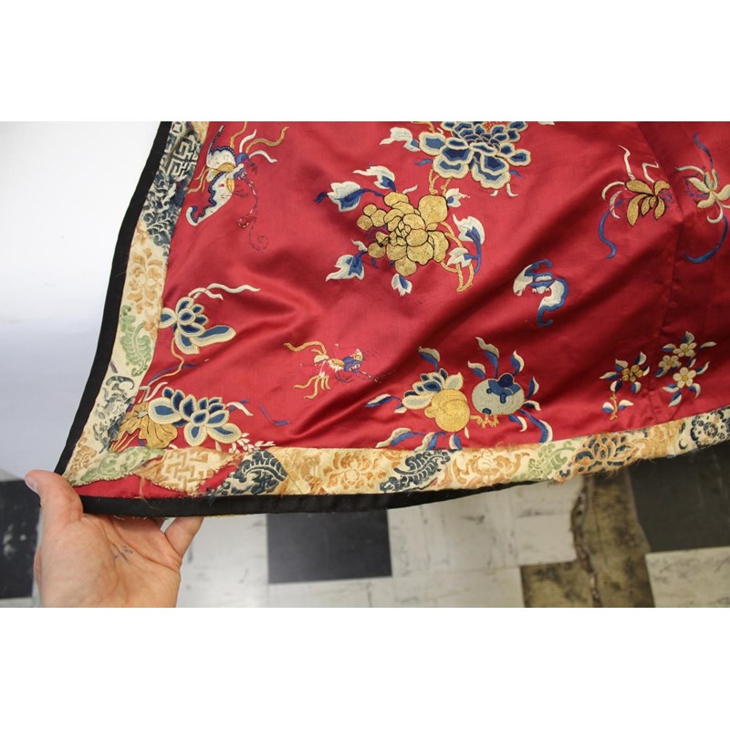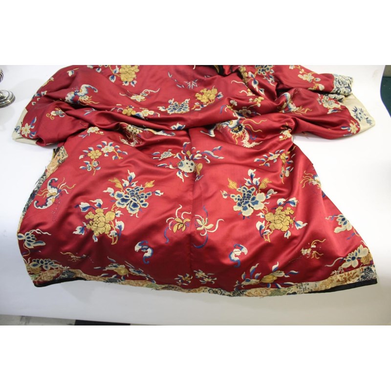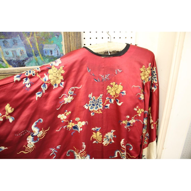 of red silk, decorated with silk and couched metallic thread embroidered images, cross over fastening and blue embroidered sleeve bands. Decorated with mythical beasts, flowers and chinese symbols, with possible alterations. 110cms high