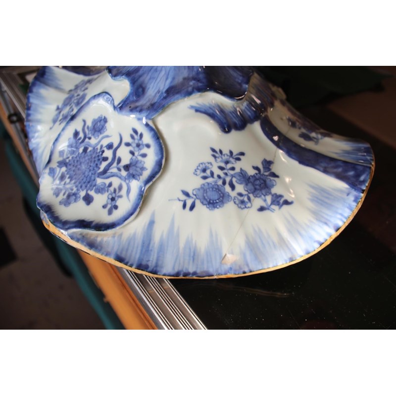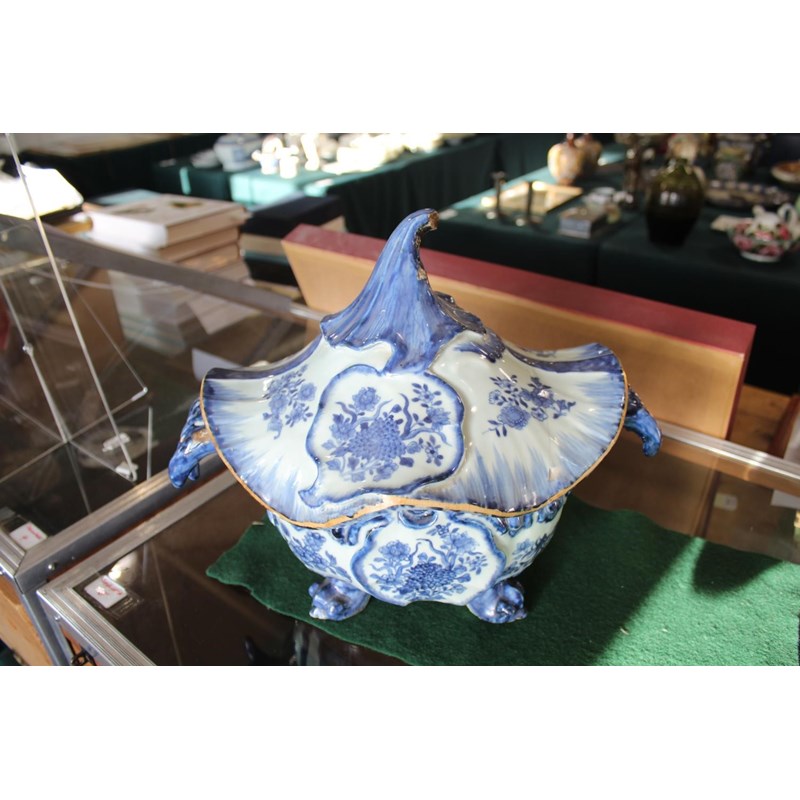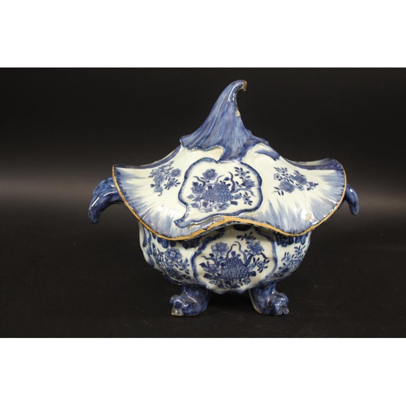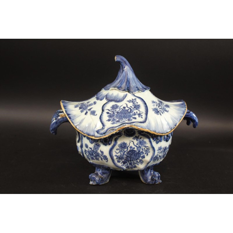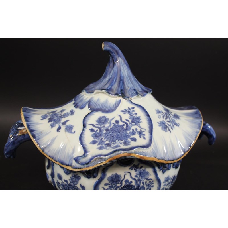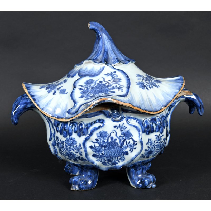a rare Chinese export blue and white rococo style tureen and cover, circa 1760 and made for the French market. Modelled after a silver or faience shape with frond handles and rococo foliage, and standing on four leaf scroll feet, painted with panels of flower blooms. Damages and repairs to the lid, 31cms high
