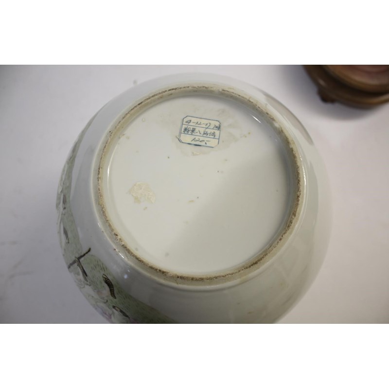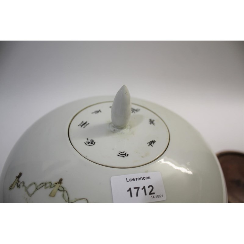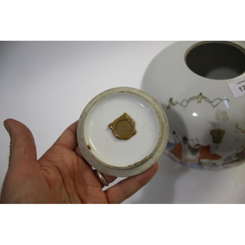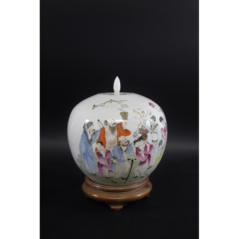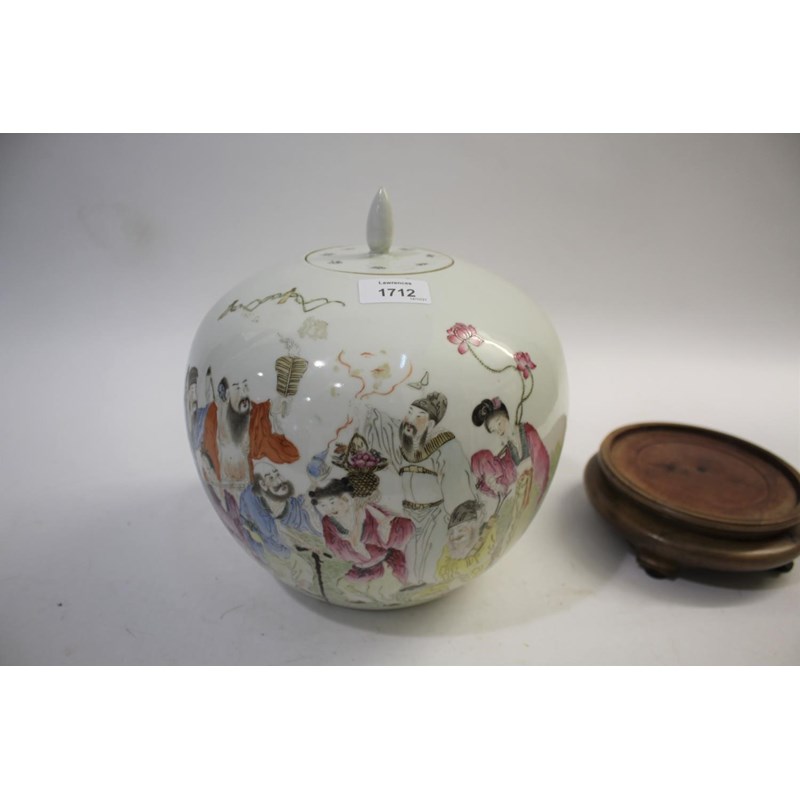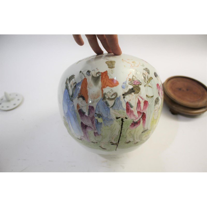 probably early 20thc, the large globular jar painted on one side with a variety of figures. The reverse with various character marks, and further character marks to the lid. Finial repaired and with a label to the base and marked 4-12-17, and with a wooden stand. 26.5cms high
