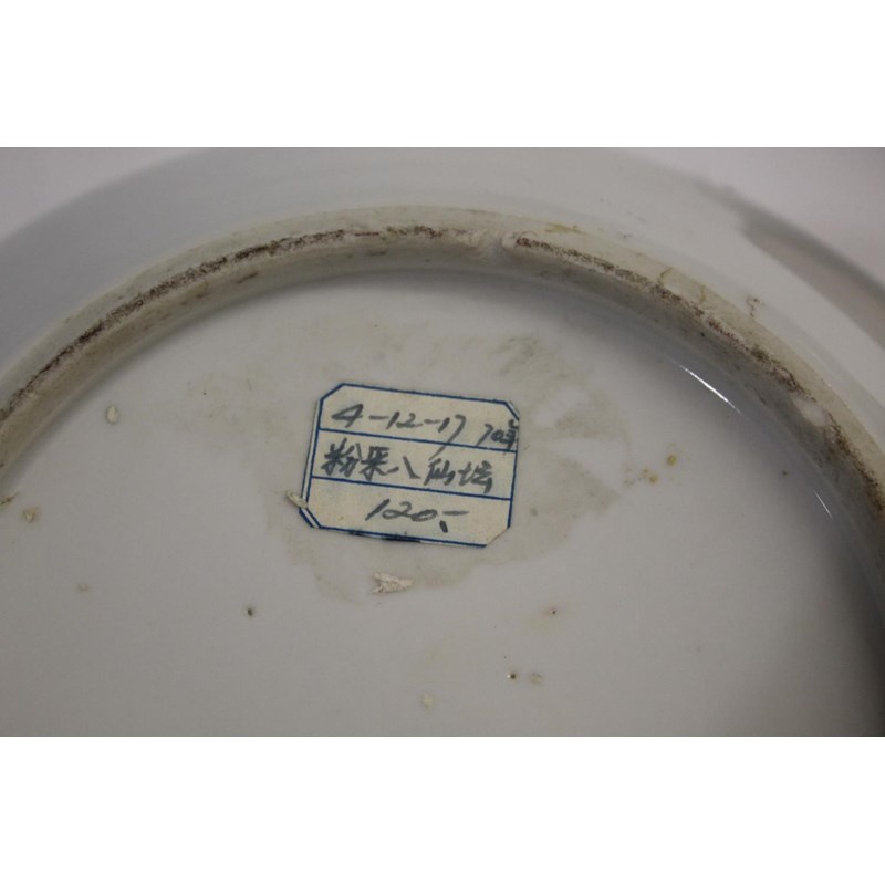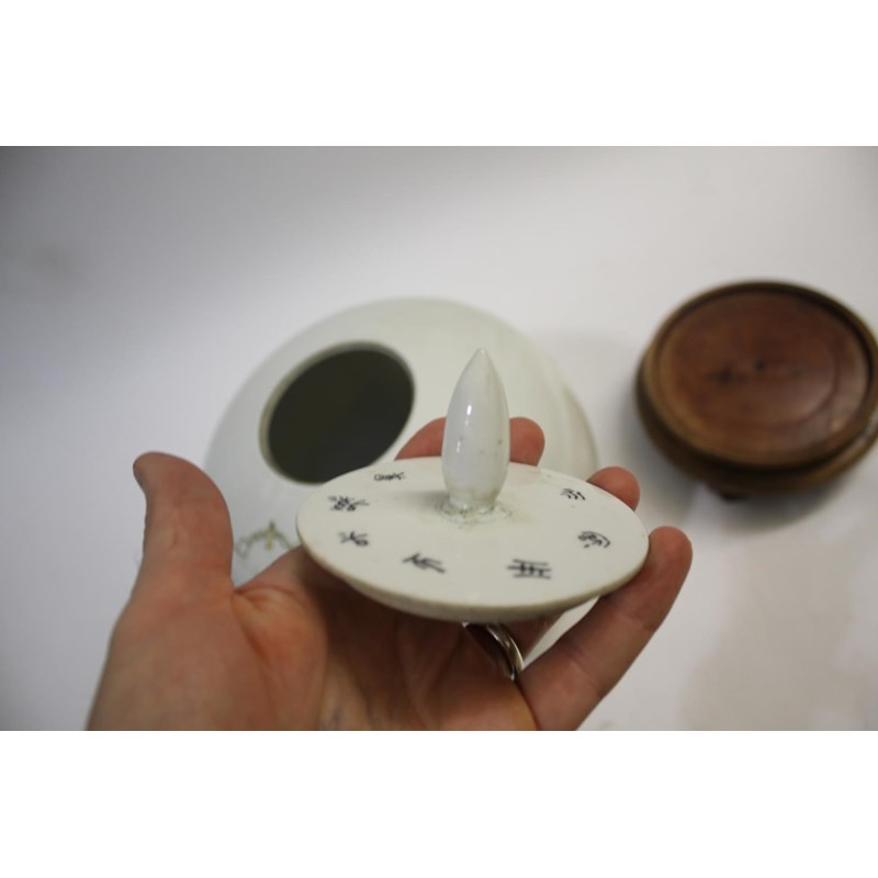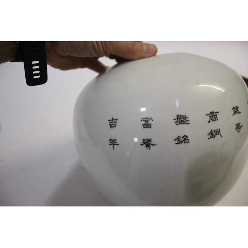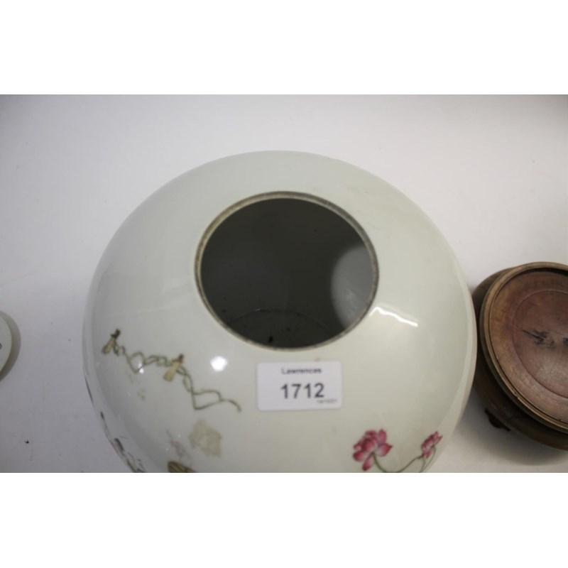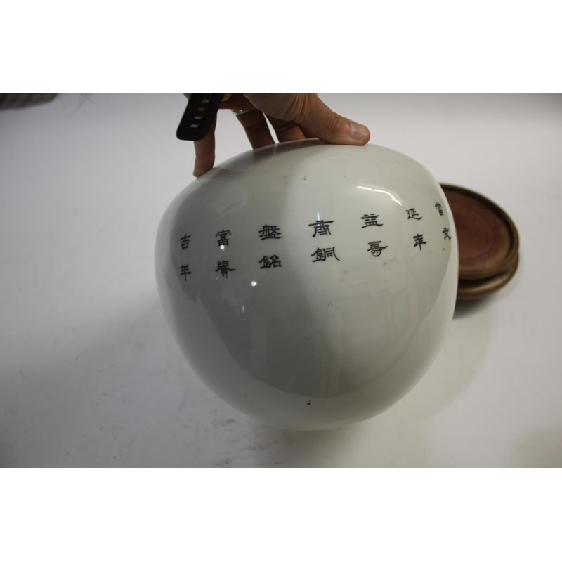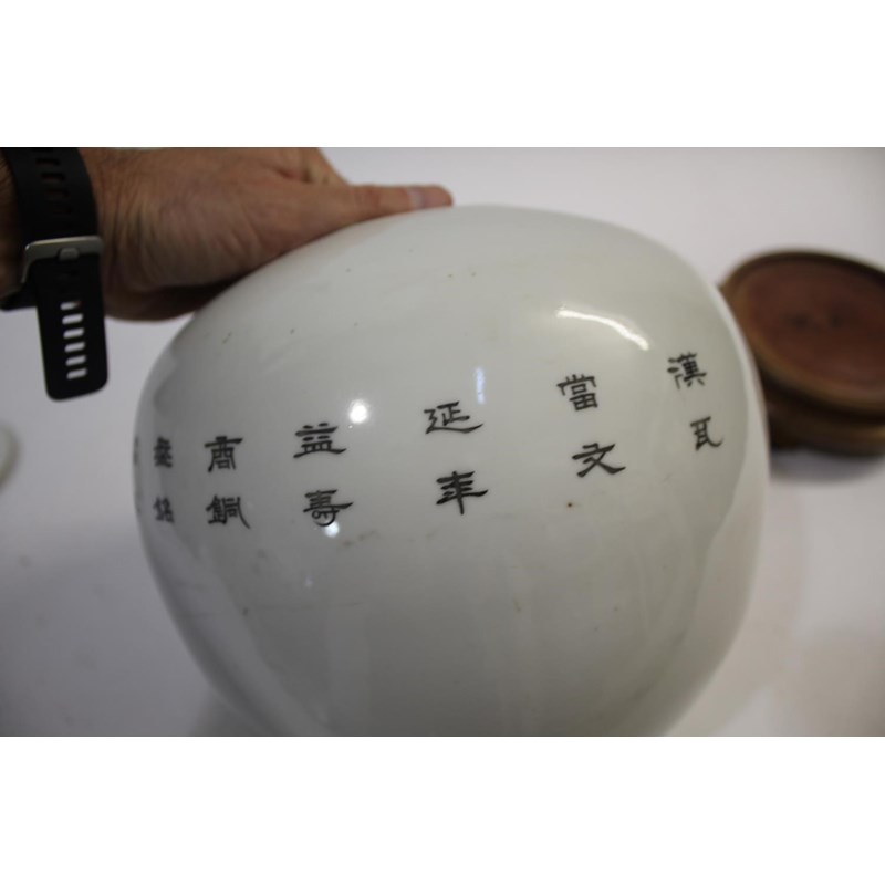 probably early 20thc, the large globular jar painted on one side with a variety of figures. The reverse with various character marks, and further character marks to the lid. Finial repaired and with a label to the base and marked 4-12-17, and with a wooden stand. 26.5cms high