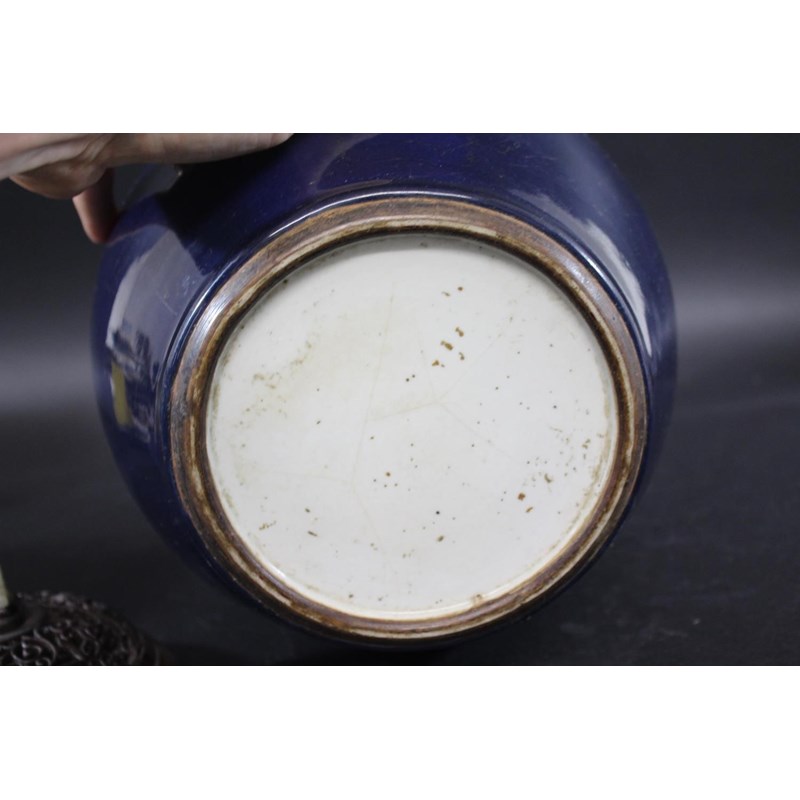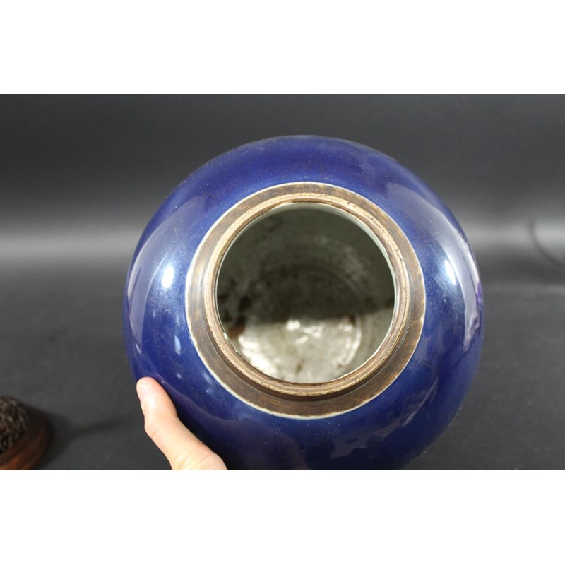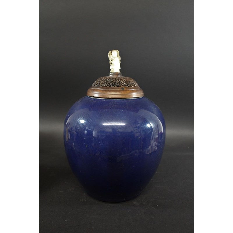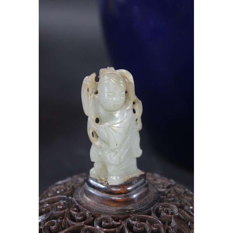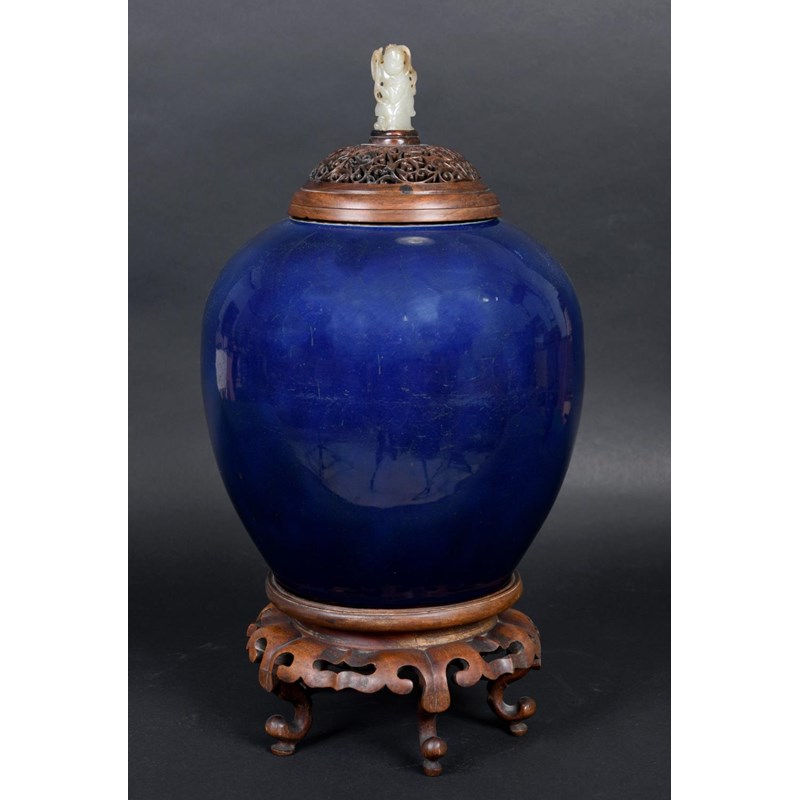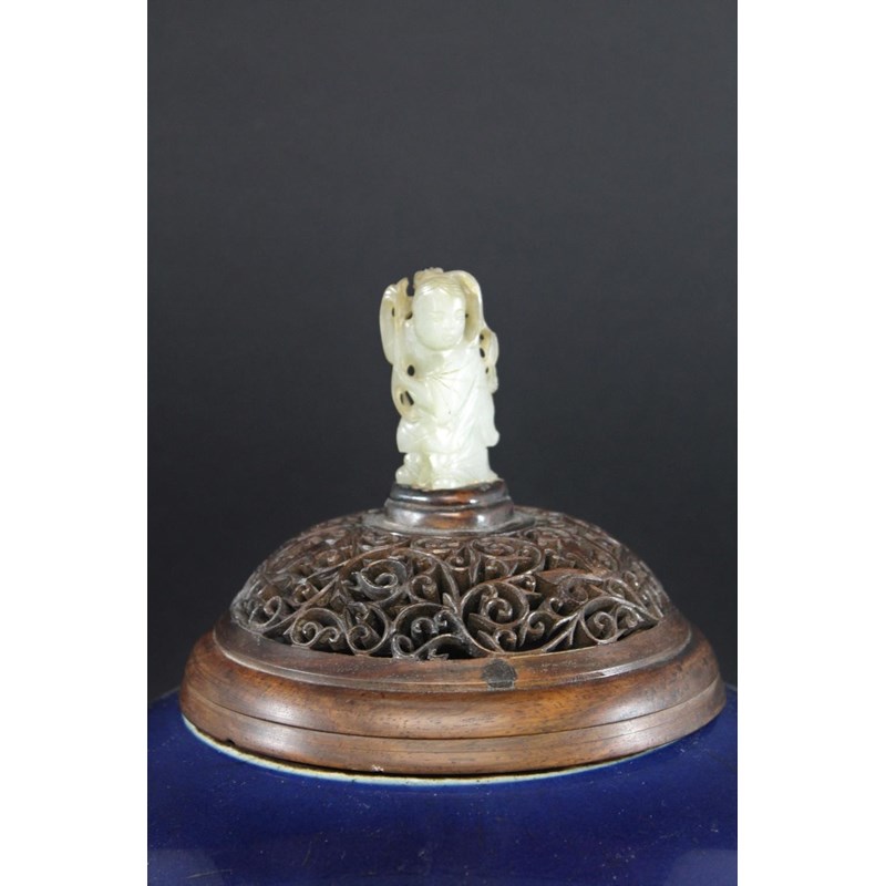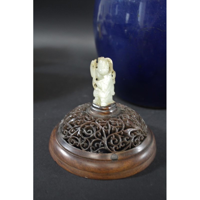 a large jar with a dark blue glaze and brown stained rim, with a pierced hard wood wooden cover mounted with a jade figure. With a wooden stand, star cracks to the base, 28.5cms high, 37cms high including cover and jade figure