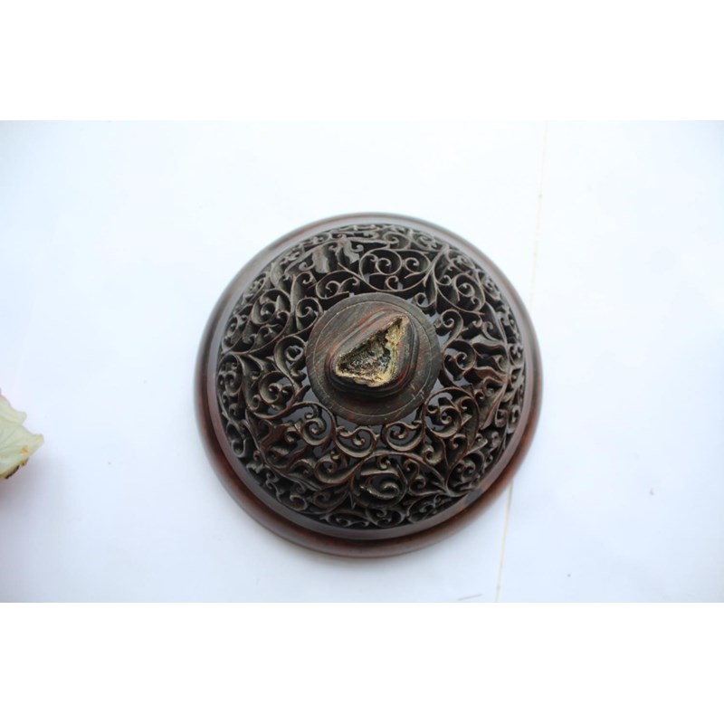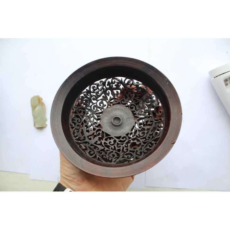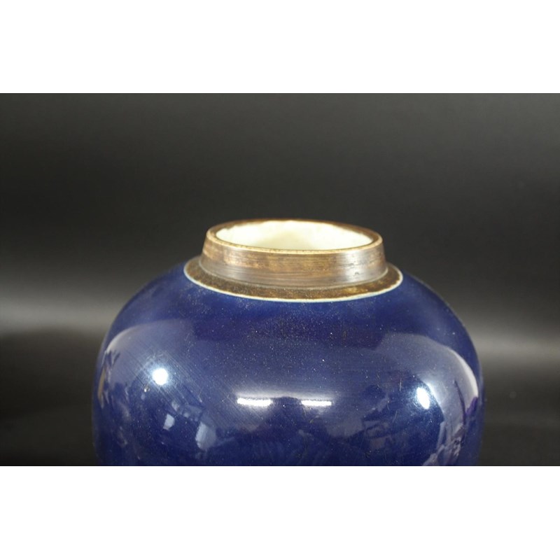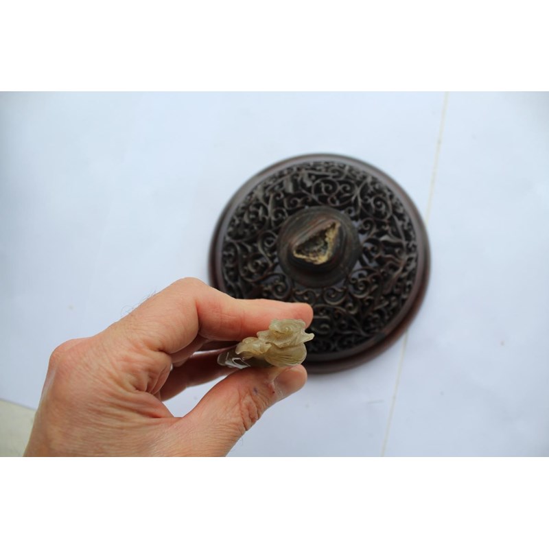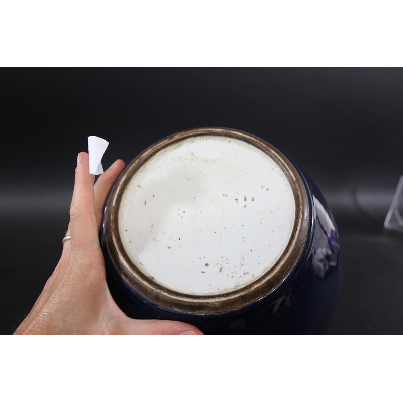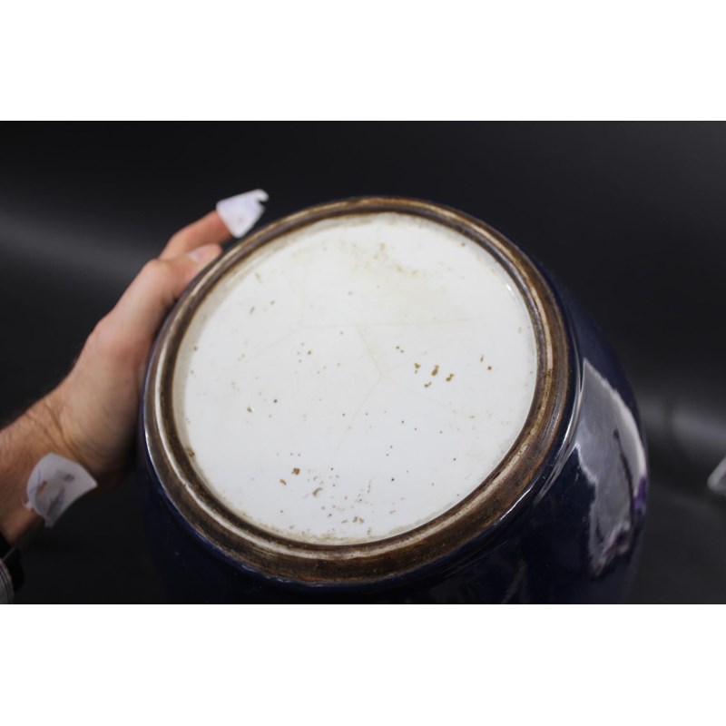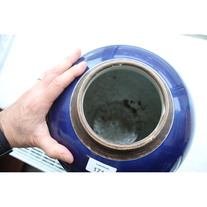 a large jar with a dark blue glaze and brown stained rim, with a pierced hard wood wooden cover mounted with a jade figure. With a wooden stand, star cracks to the base, 28.5cms high, 37cms high including cover and jade figure