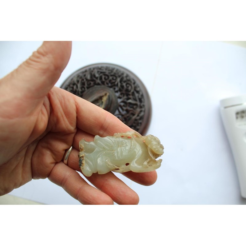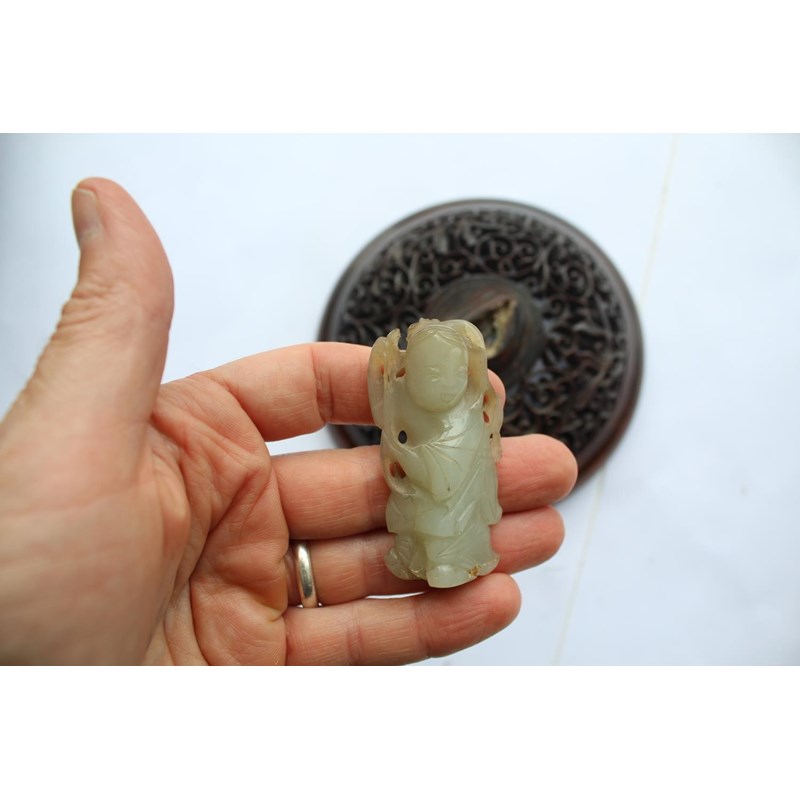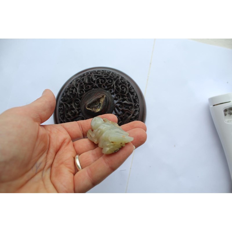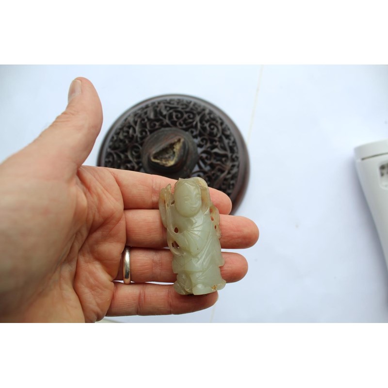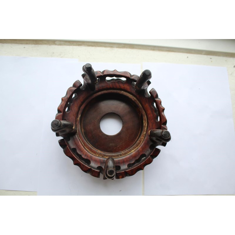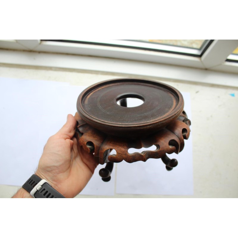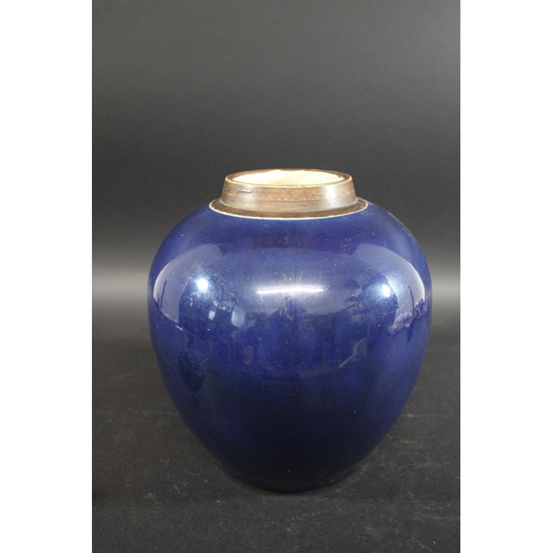 a large jar with a dark blue glaze and brown stained rim, with a pierced hard wood wooden cover mounted with a jade figure. With a wooden stand, star cracks to the base, 28.5cms high, 37cms high including cover and jade figure