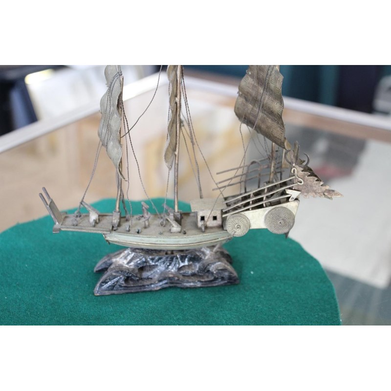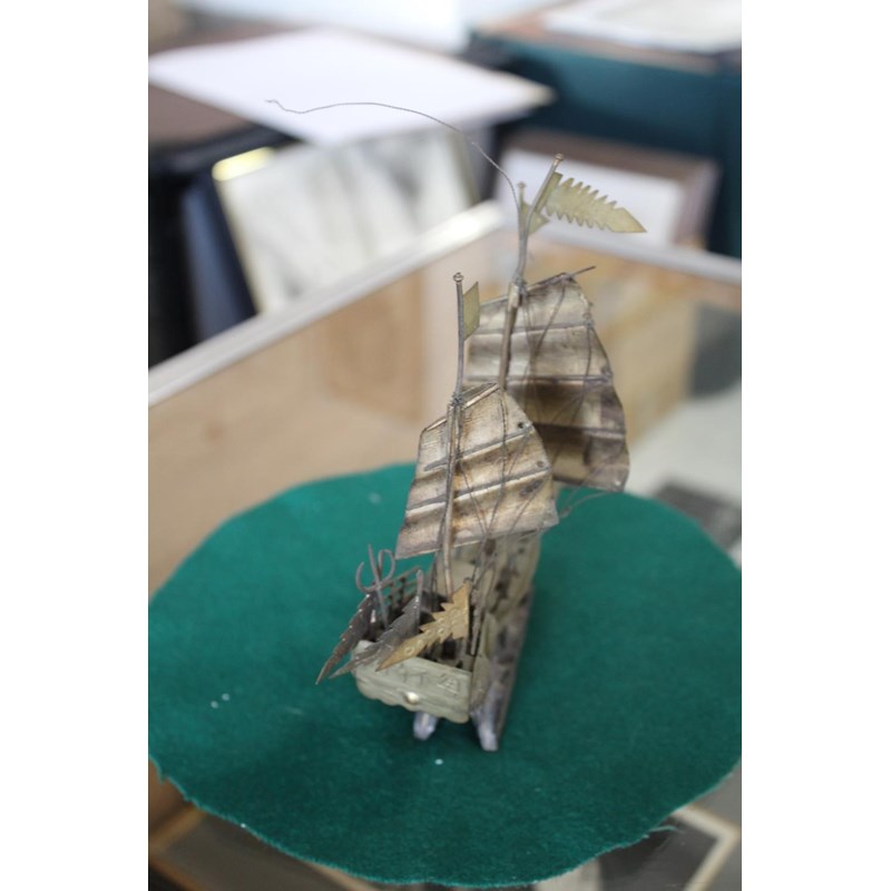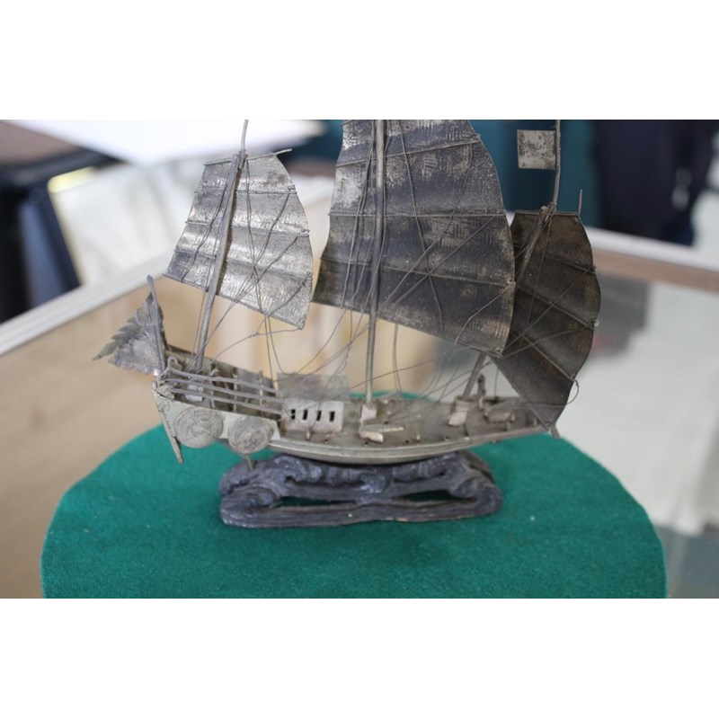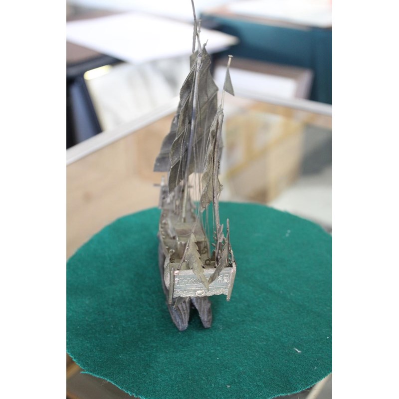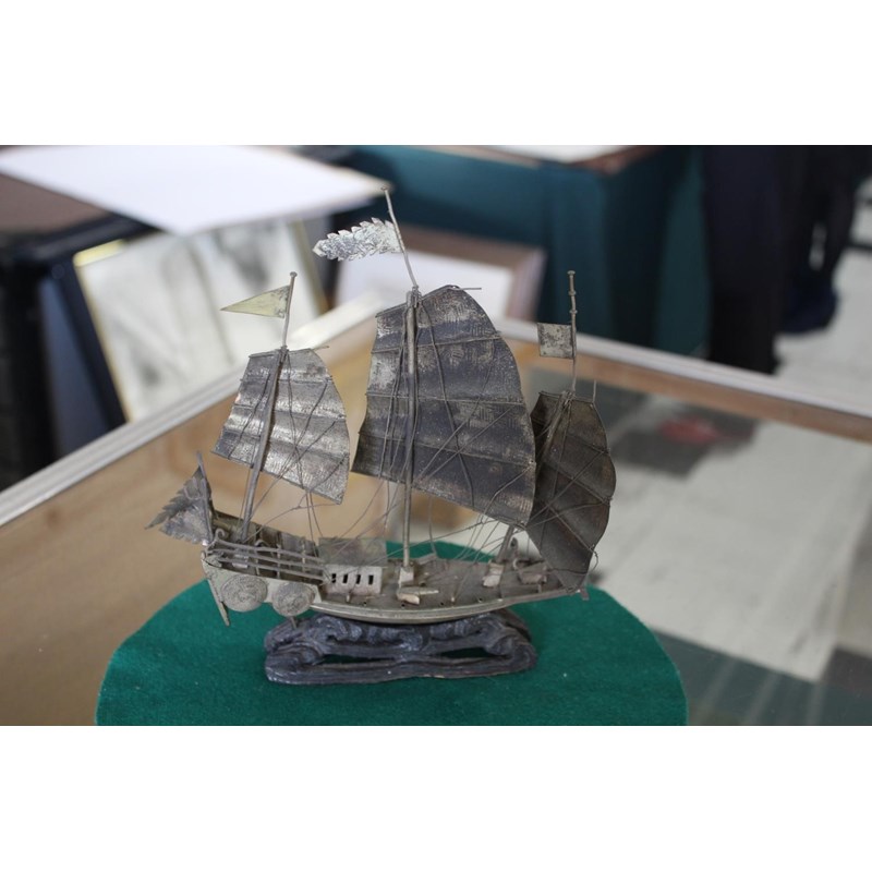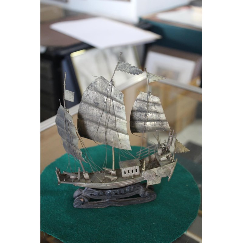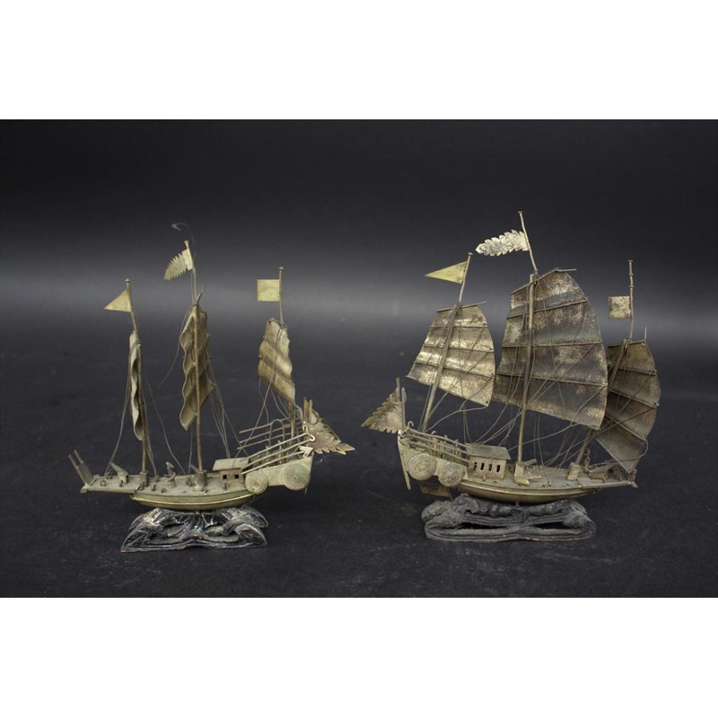 probably silver, the masted boats mounted on wooden stands. With Chinese character marks to the end of each boat, 22cms and 19cms high (including stands). (2)