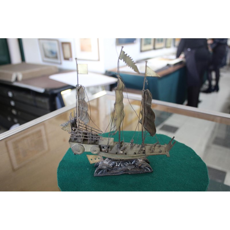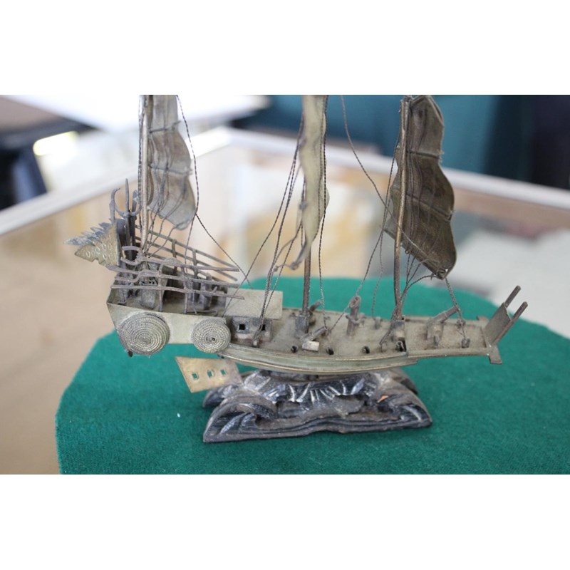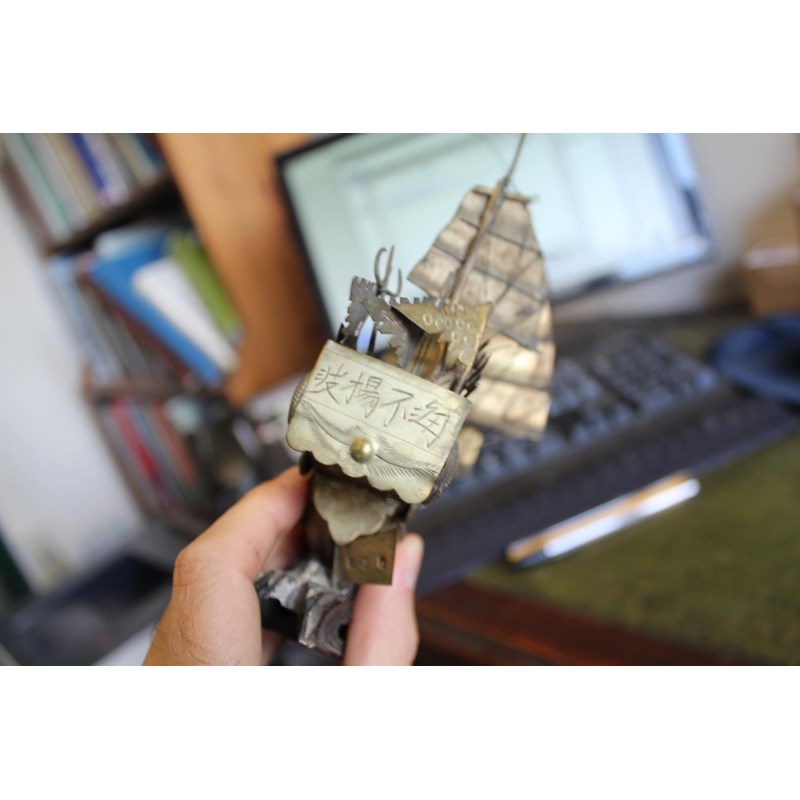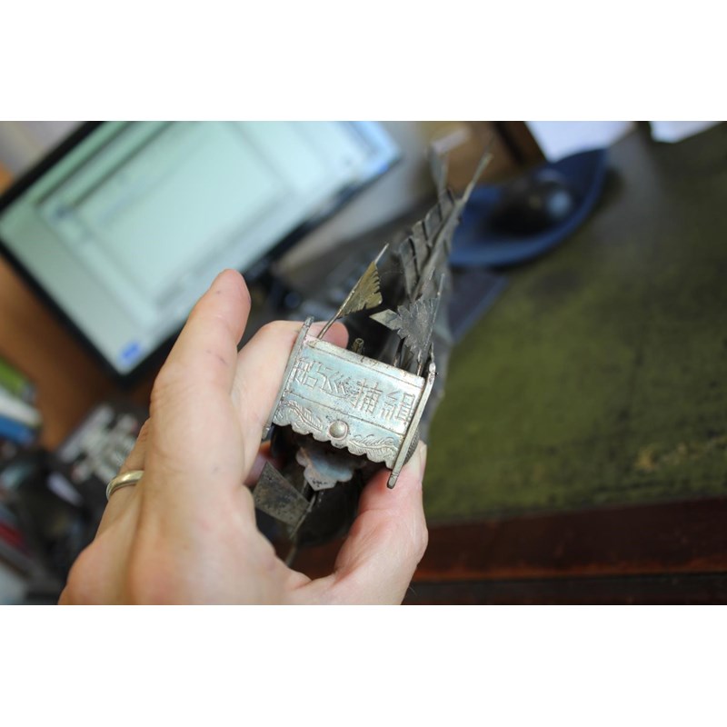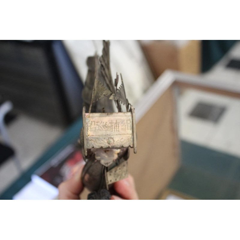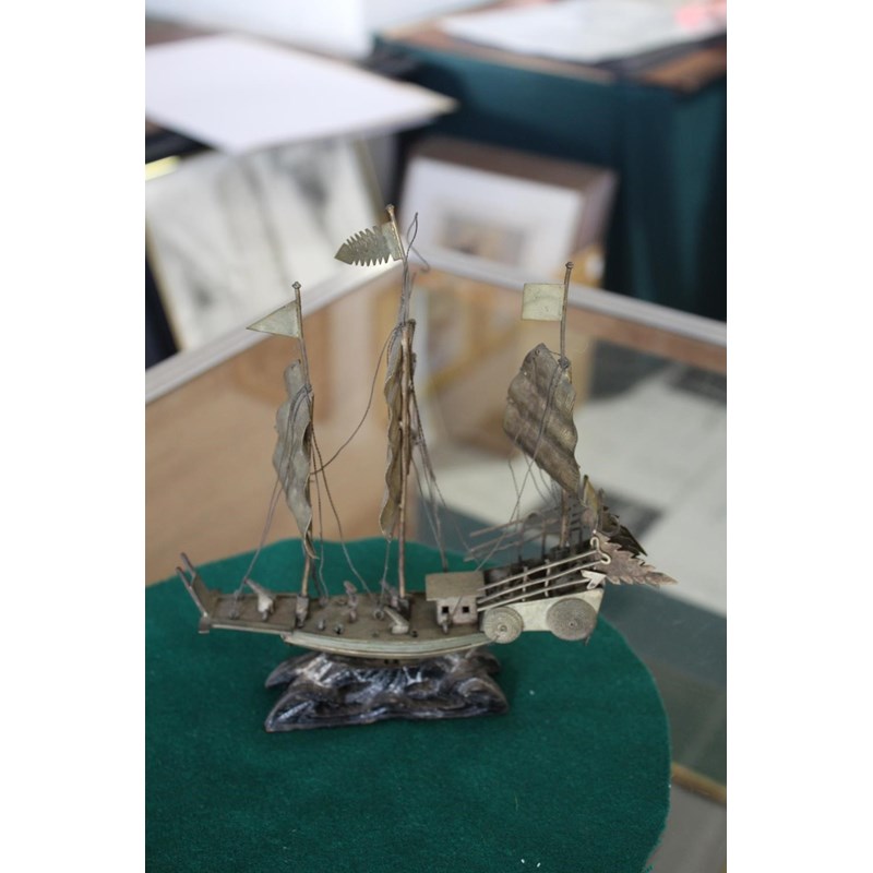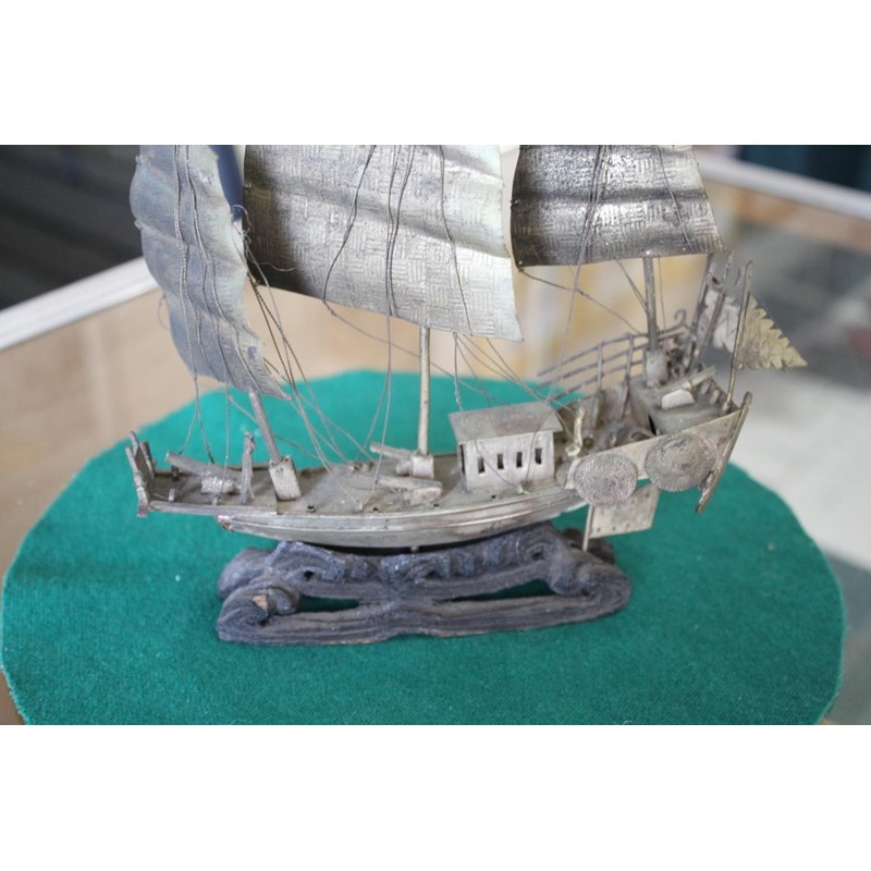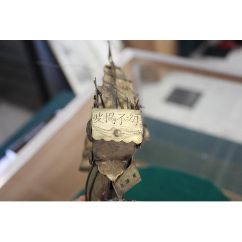 probably silver, the masted boats mounted on wooden stands. With Chinese character marks to the end of each boat, 22cms and 19cms high (including stands). (2)