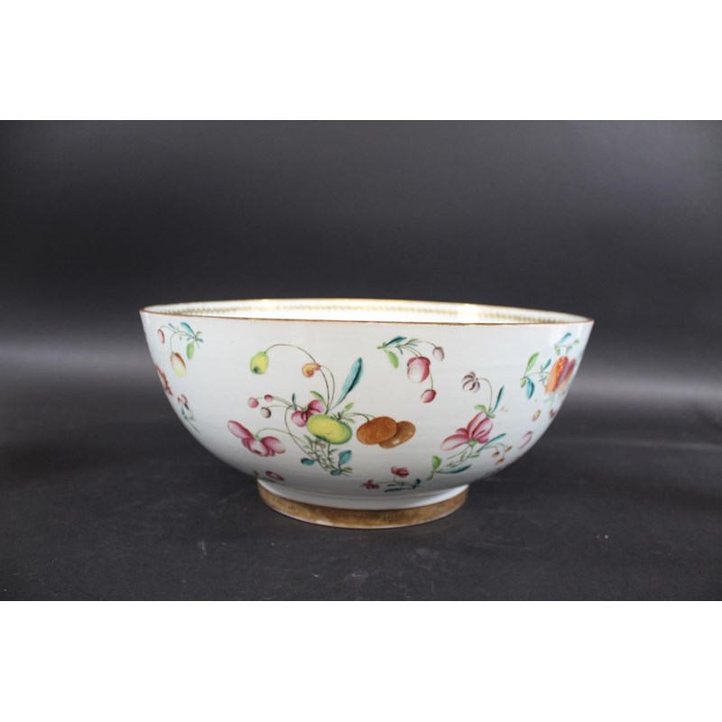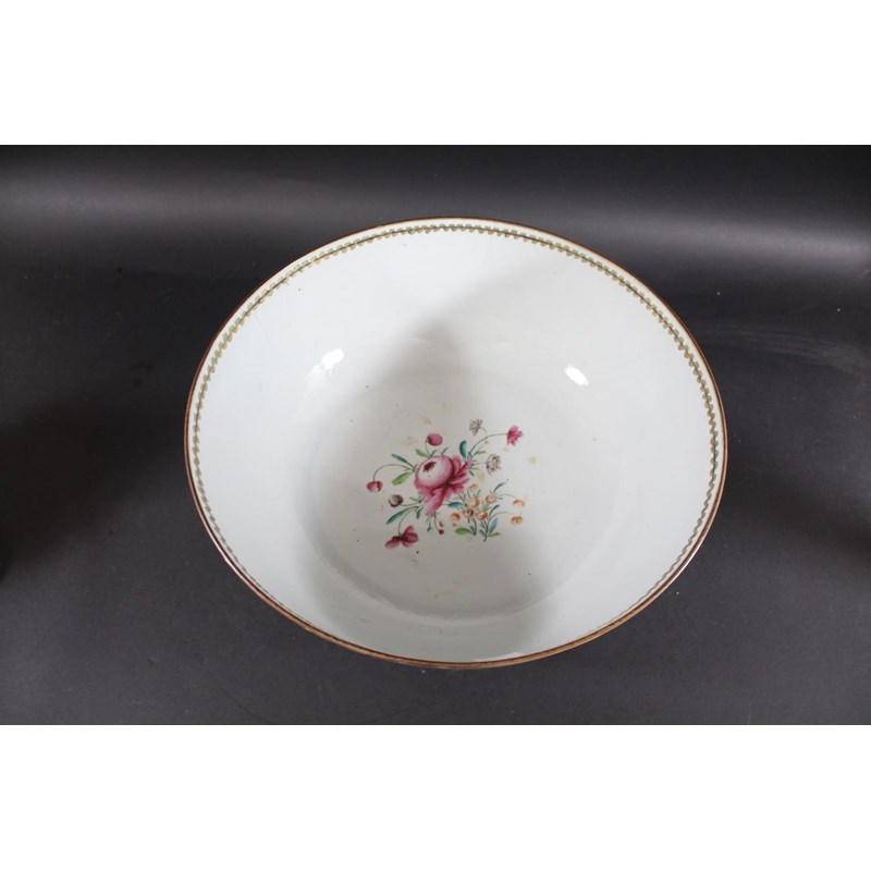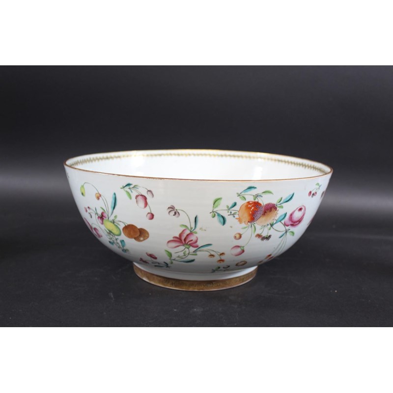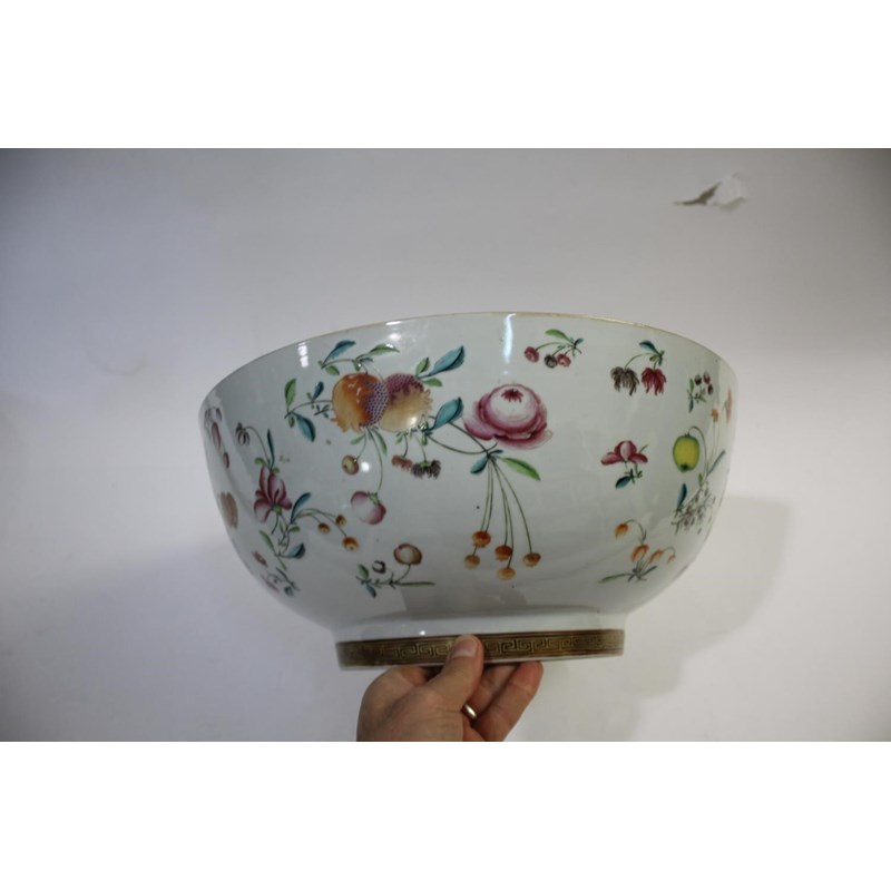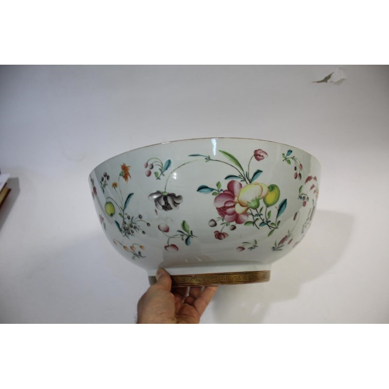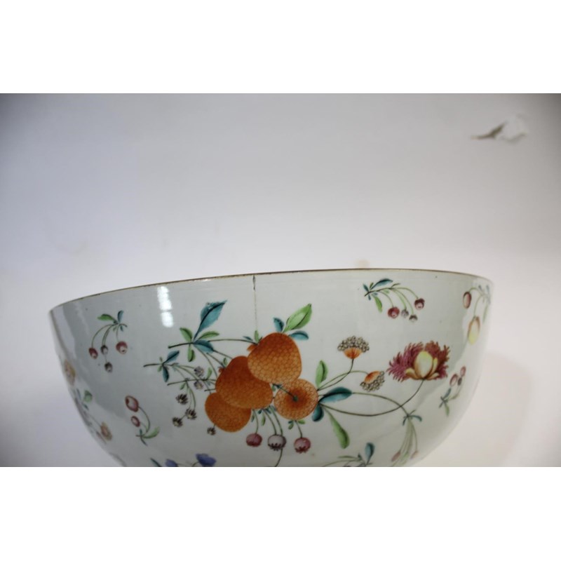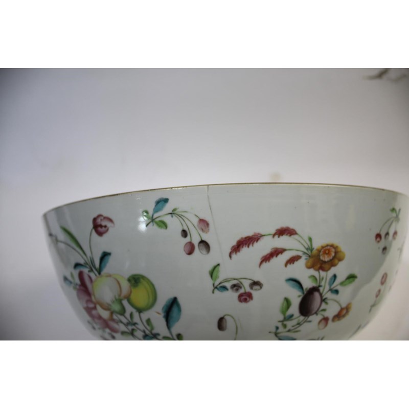 a large 18thc punch bowl, painted to the interior with a spray of flowers and rope twist border. The exterior painted with a variety of fruit and flowers, and with a key fret border around the base rim. Two hairline cracks to rim, 39cms diameter