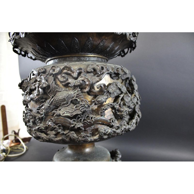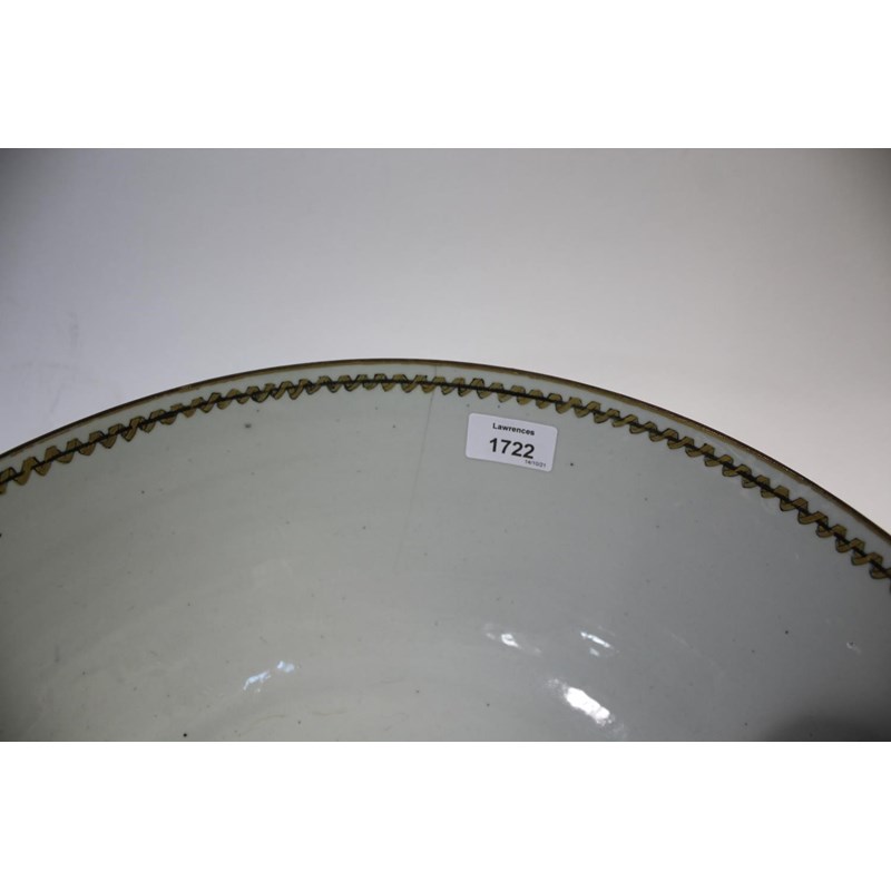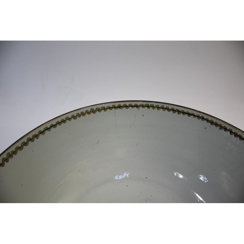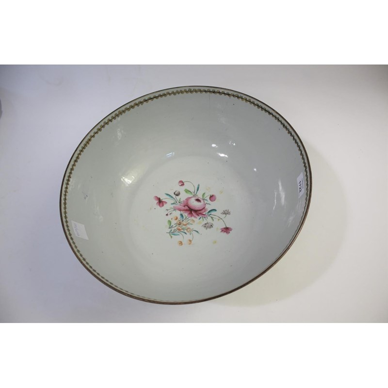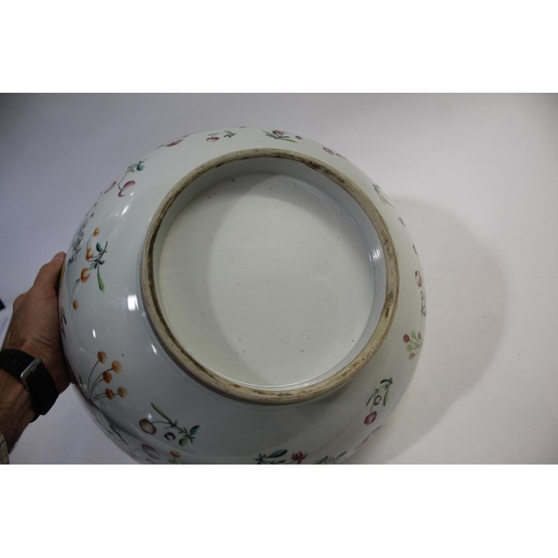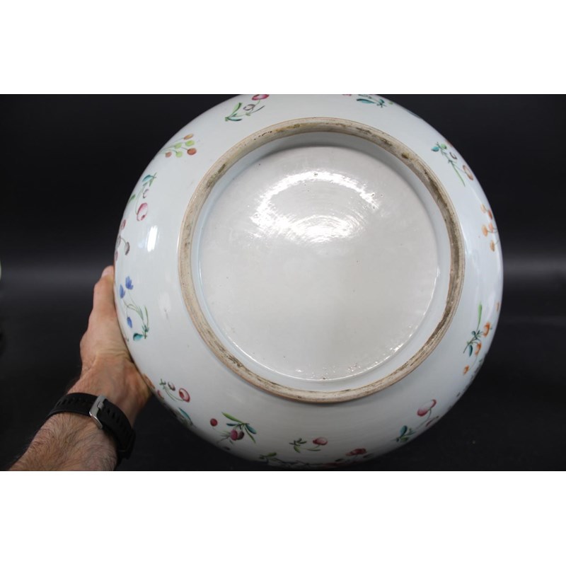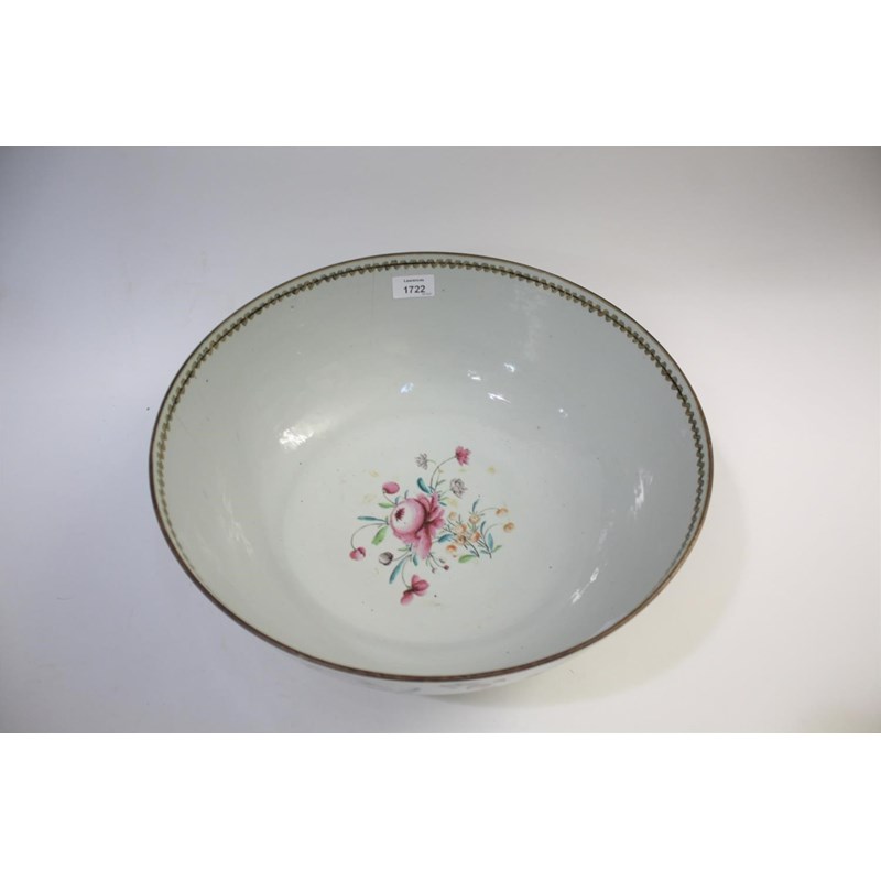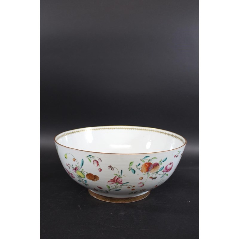 a large 18thc punch bowl, painted to the interior with a spray of flowers and rope twist border. The exterior painted with a variety of fruit and flowers, and with a key fret border around the base rim. Two hairline cracks to rim, 39cms diameter
