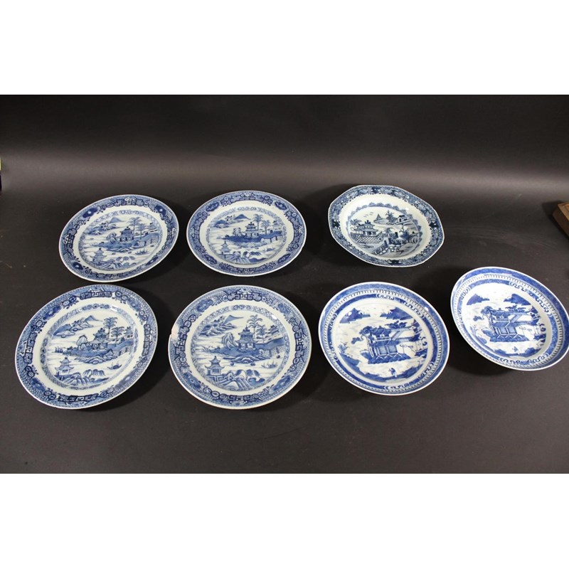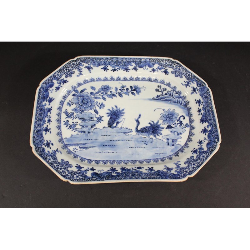 an 18thc platter, the centre painted with peacocks and a variety of flowers and foliage (35cms by 25cms), also with four similar blue & white plates, a pair of blue and white dishes with a pagoda at the centre, and one other dish. (8)