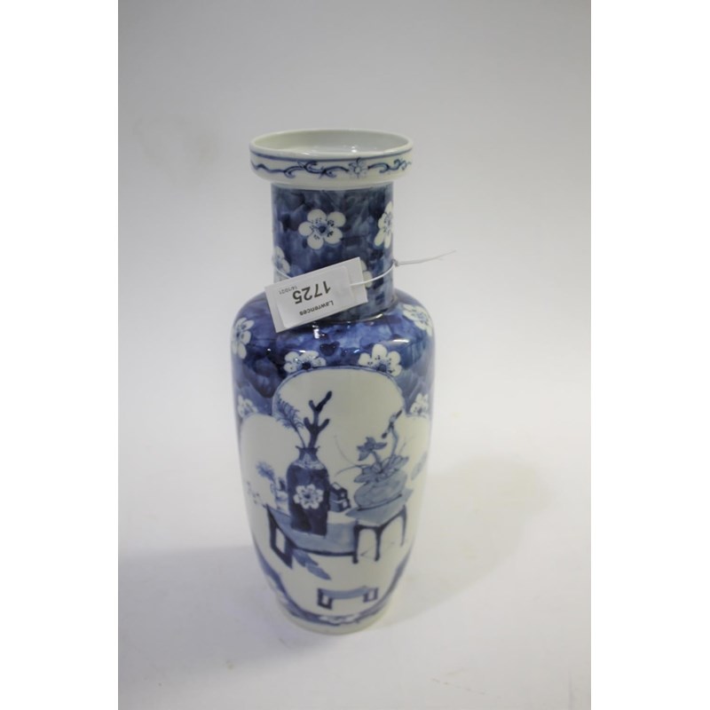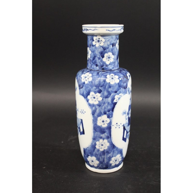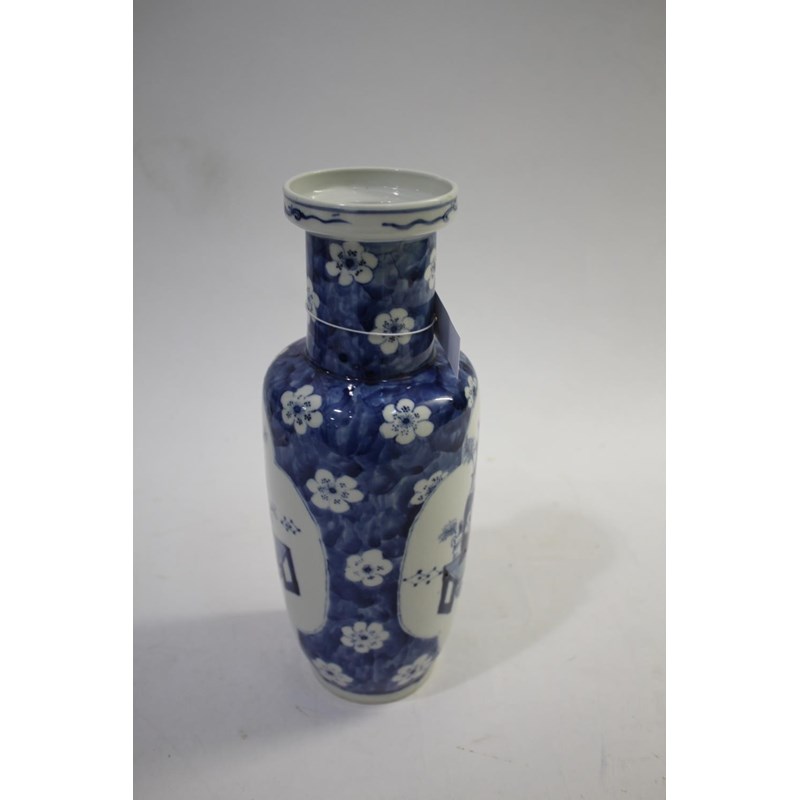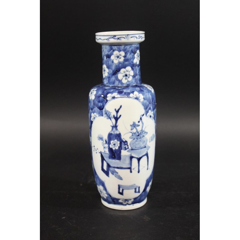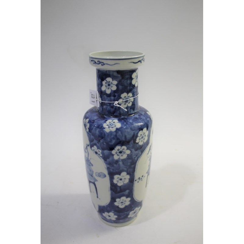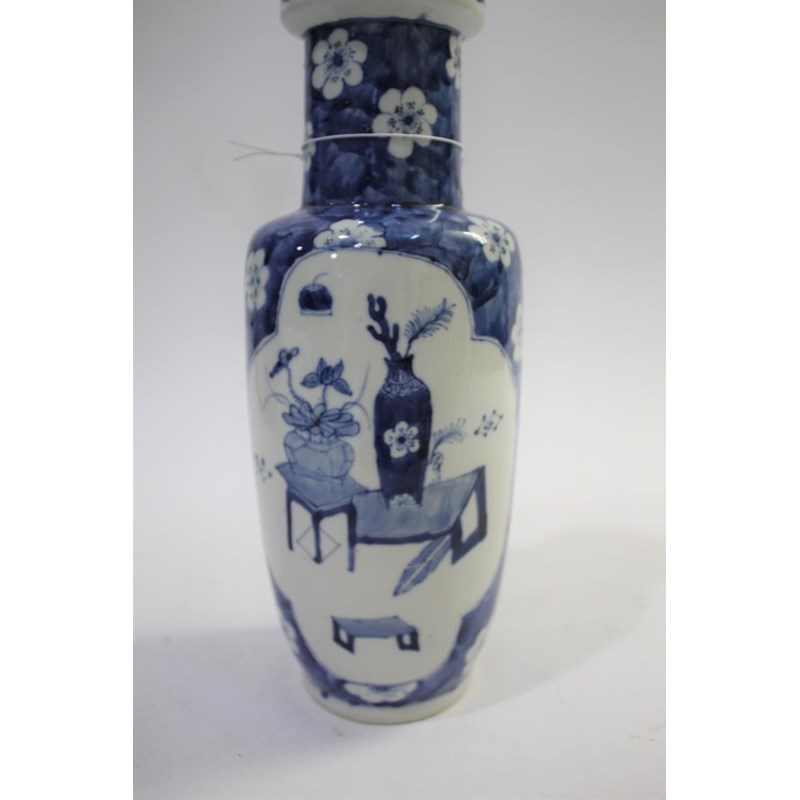 a late 19thc vase with shaped panels to each side painted with a vase and jardiniere on small tablesm with flowers and foliage, the panels surrounded with prunus blossom on a blue ground. Kangxi character marks to base but 19thc, 31cms high