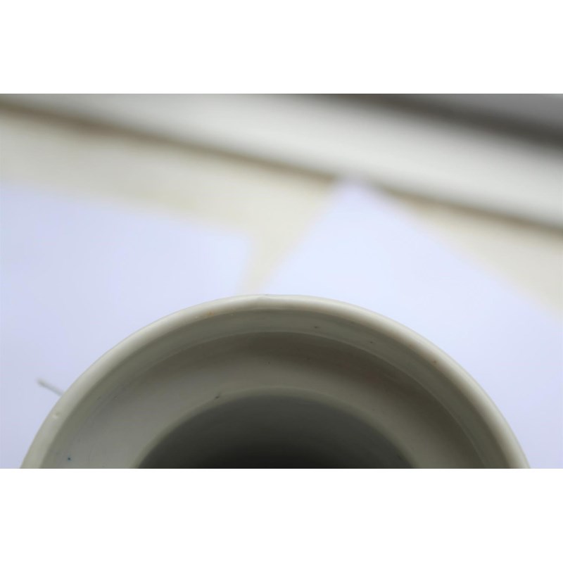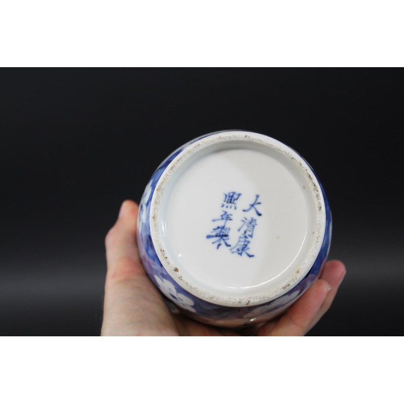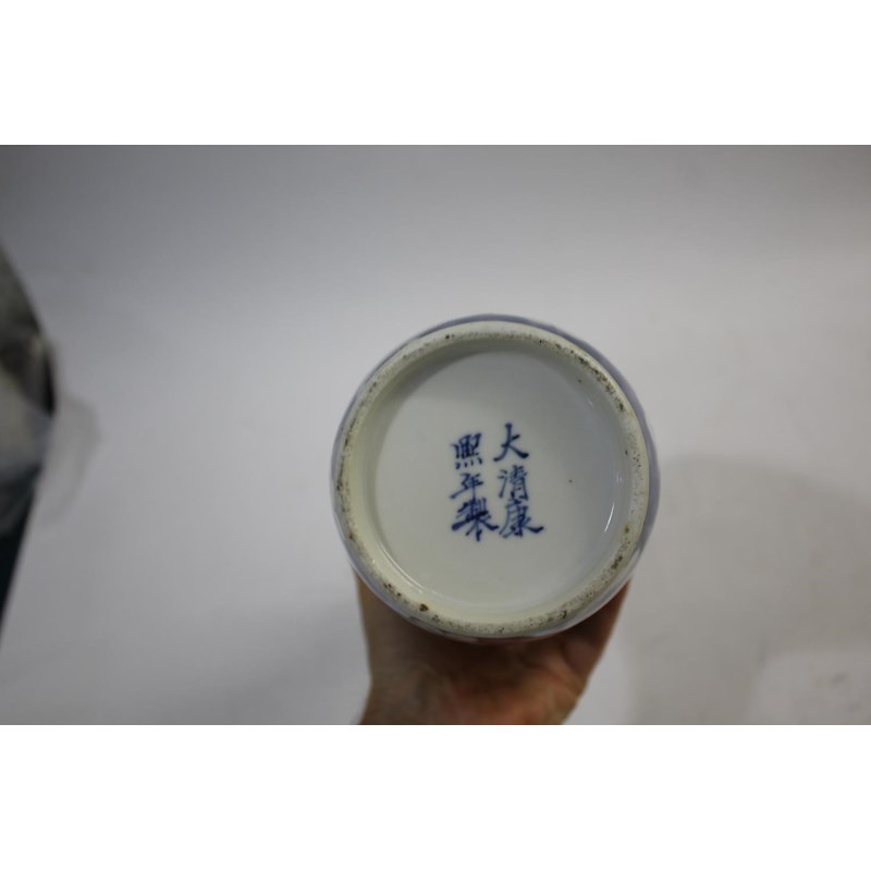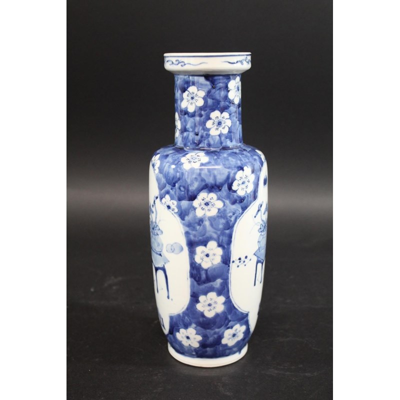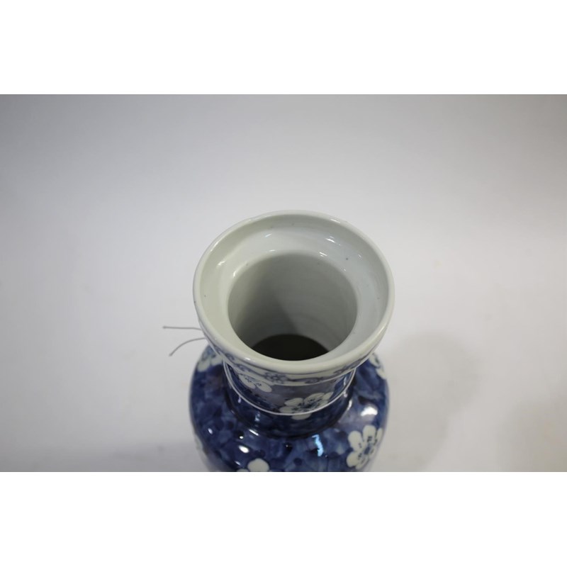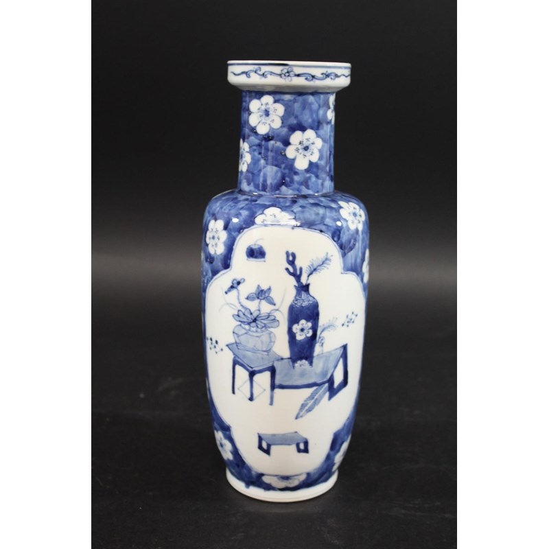 a late 19thc vase with shaped panels to each side painted with a vase and jardiniere on small tablesm with flowers and foliage, the panels surrounded with prunus blossom on a blue ground. Kangxi character marks to base but 19thc, 31cms high