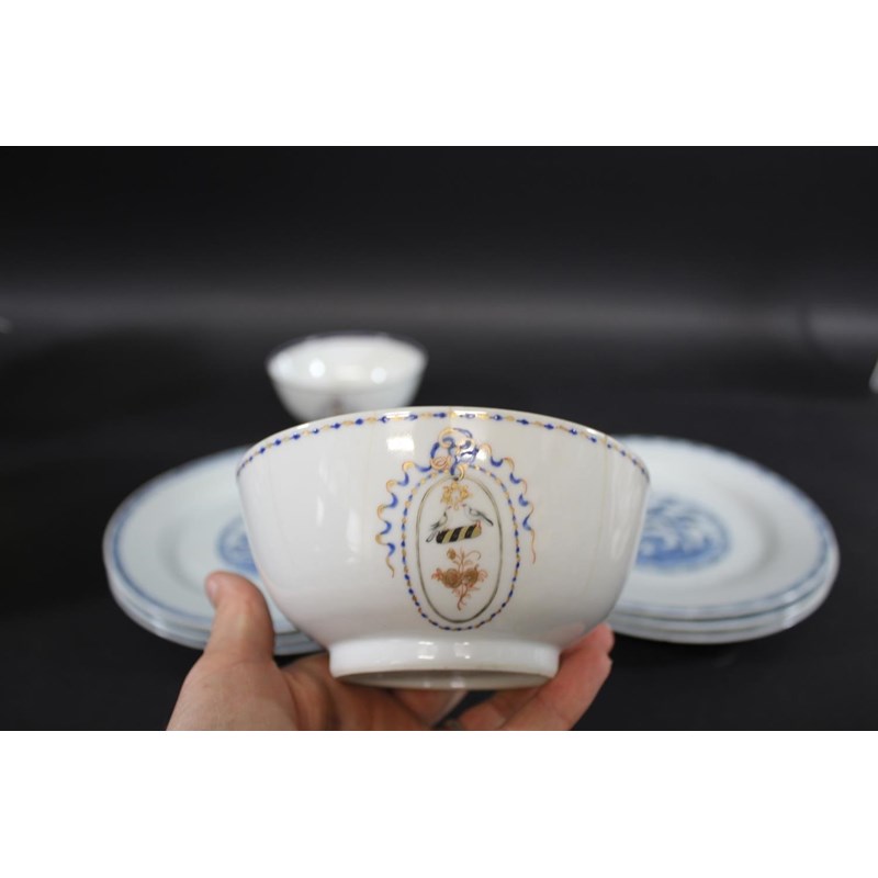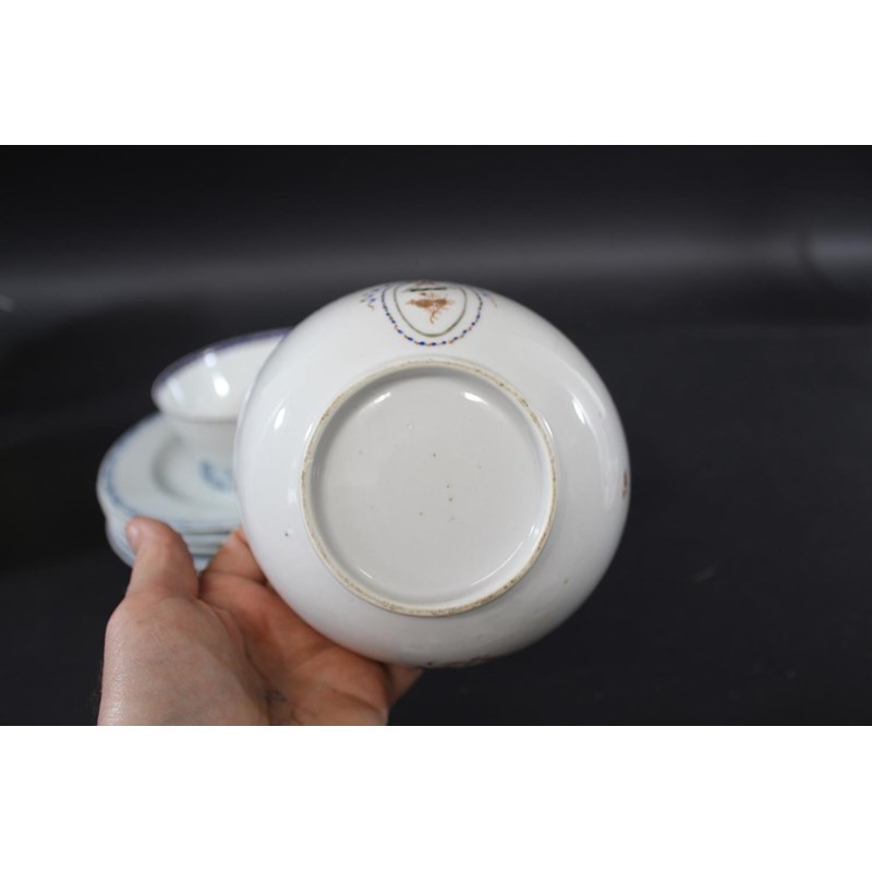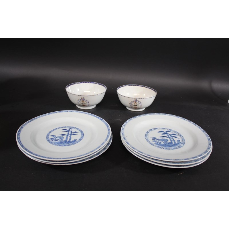 probably 18thc, with a central panel painted with trees and foliage and with a cross hatch to the centre and rim (some damages, 23cms dia). Also with two Chinese armorial bowls (damaged), 14cms diameter. (8)