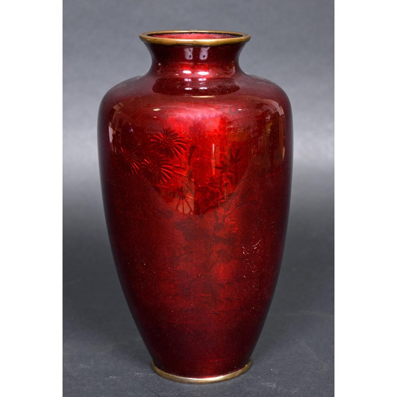 JAPANESE ENAMEL GINBARI CLOISONNE VASE a Meiji period red ground ginbari enamel vase, decorated with various flowers and foliage. Unmarked, 25cms high
