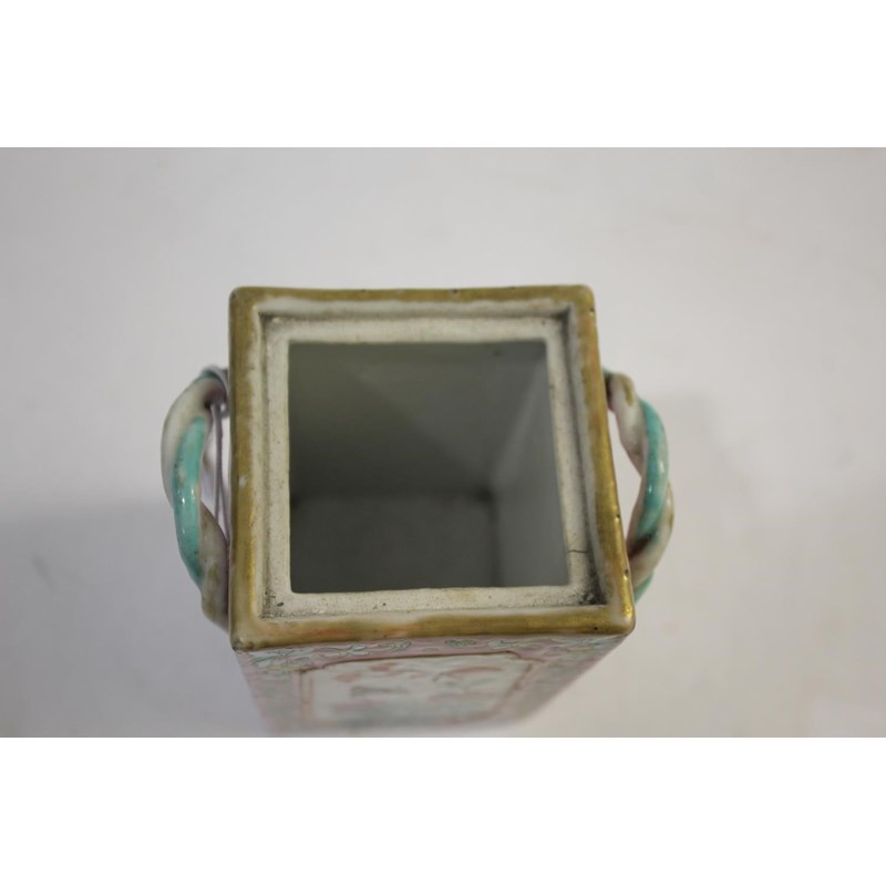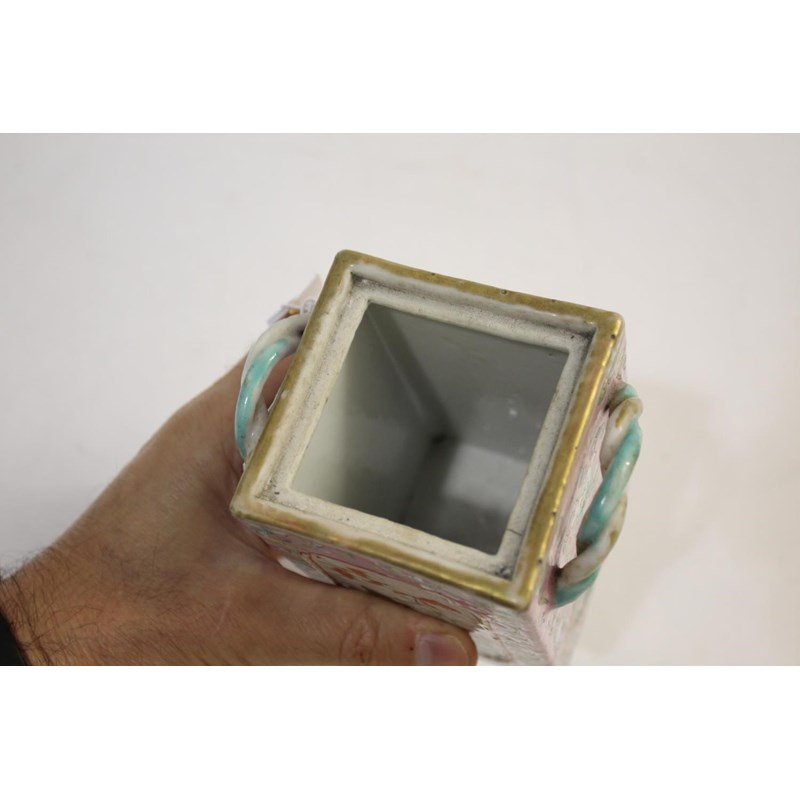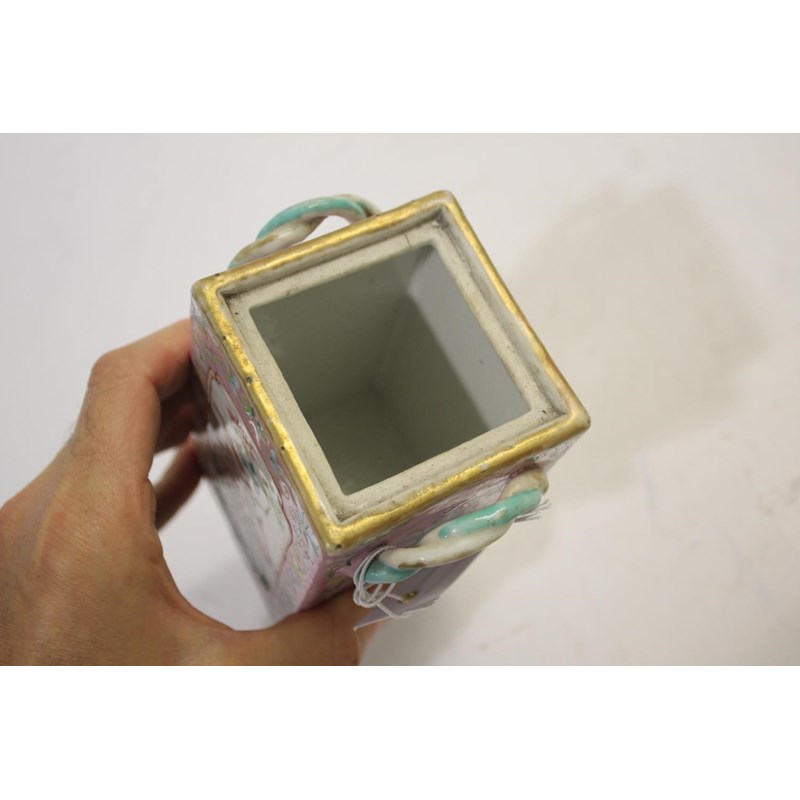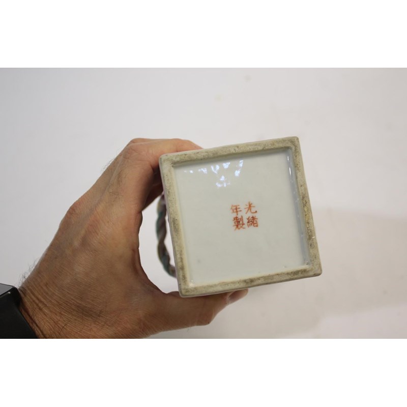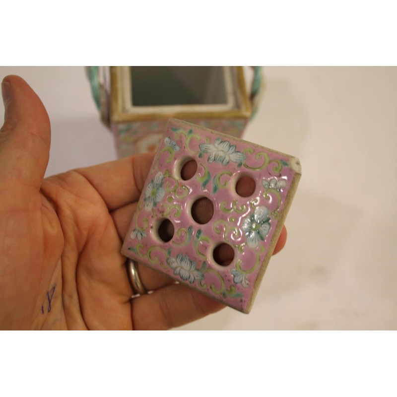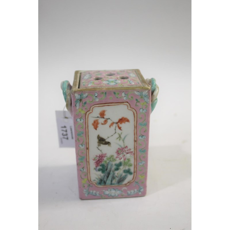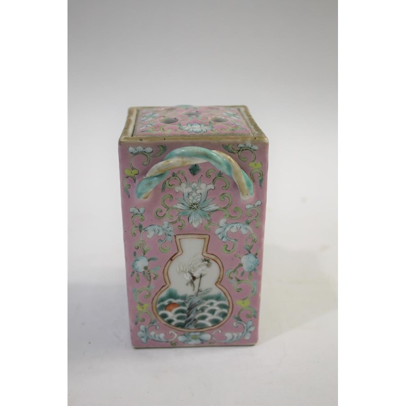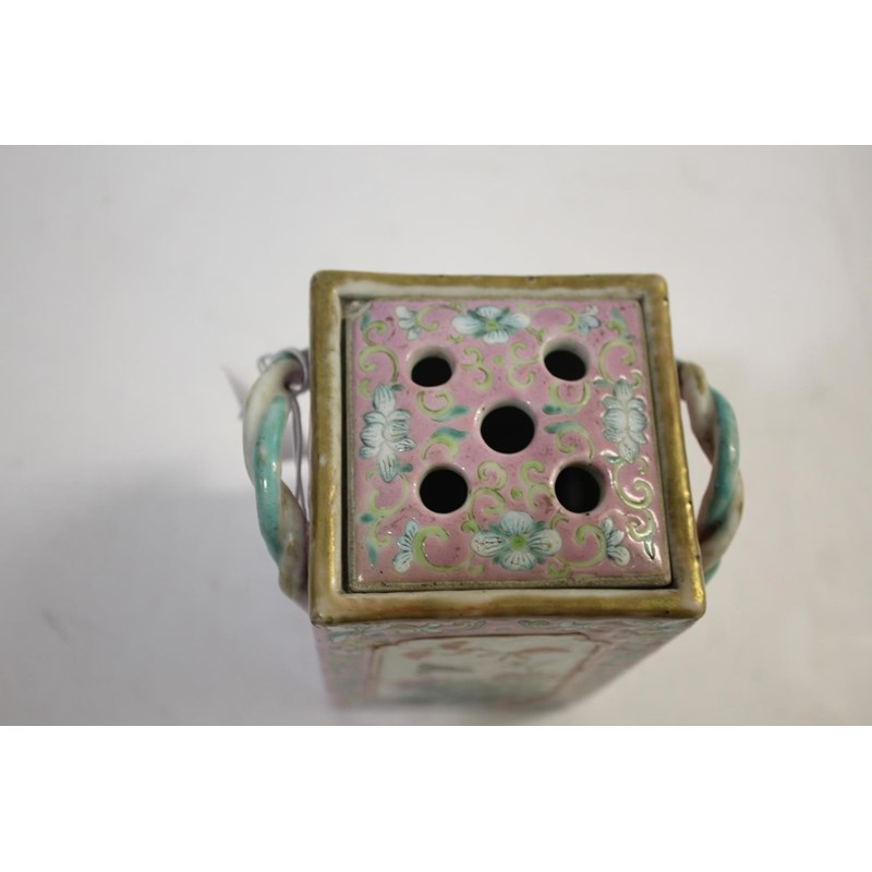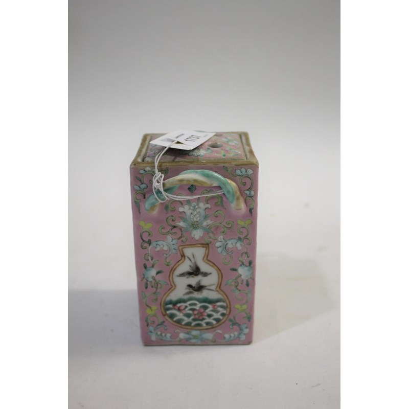 Guangxu mark and probably period (1875-1908), a two handled square shaped porcelain vase, painted with panels of birds and flowers on a pink floral ground. The lid with five pierced holes, Guangxu four red character marks to the base. 13cms high