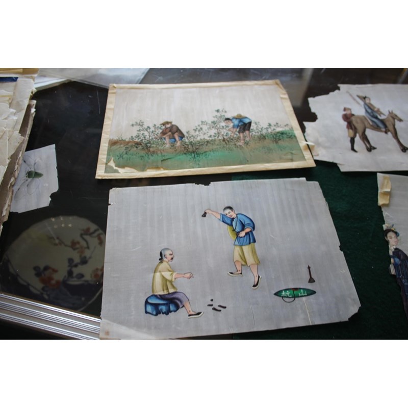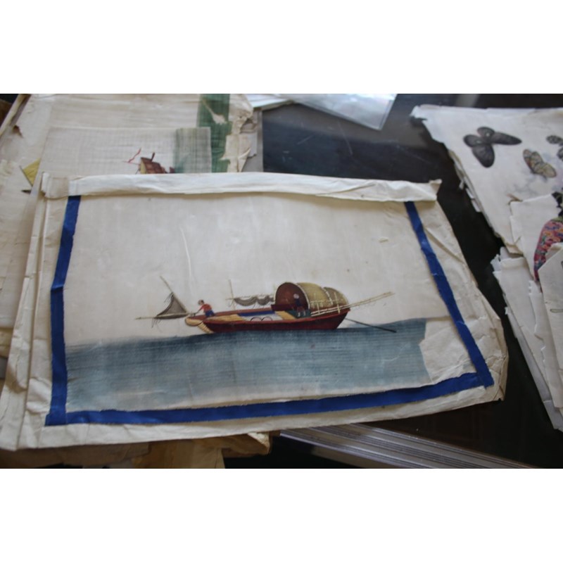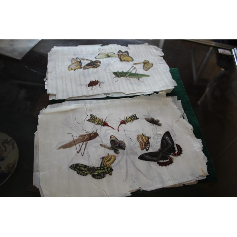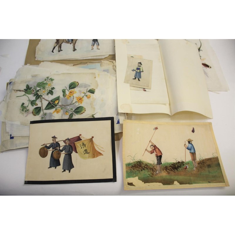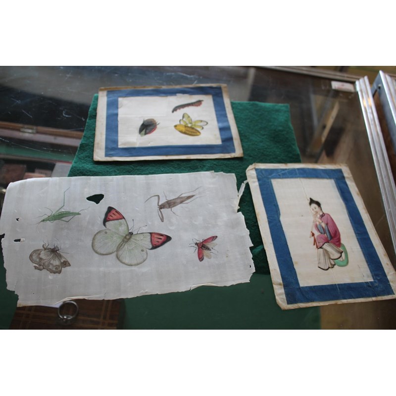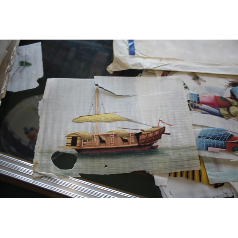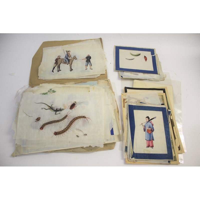 a collection of loose rice paintings, including various figures including a lady seated on a horse, various depictions of Chinese boats, butterflies and insects, flowers etc. In mixed condition.