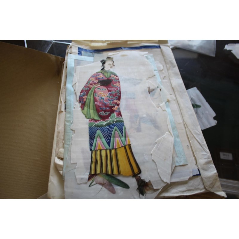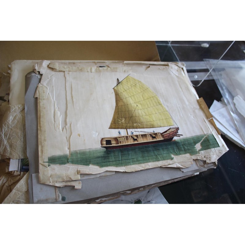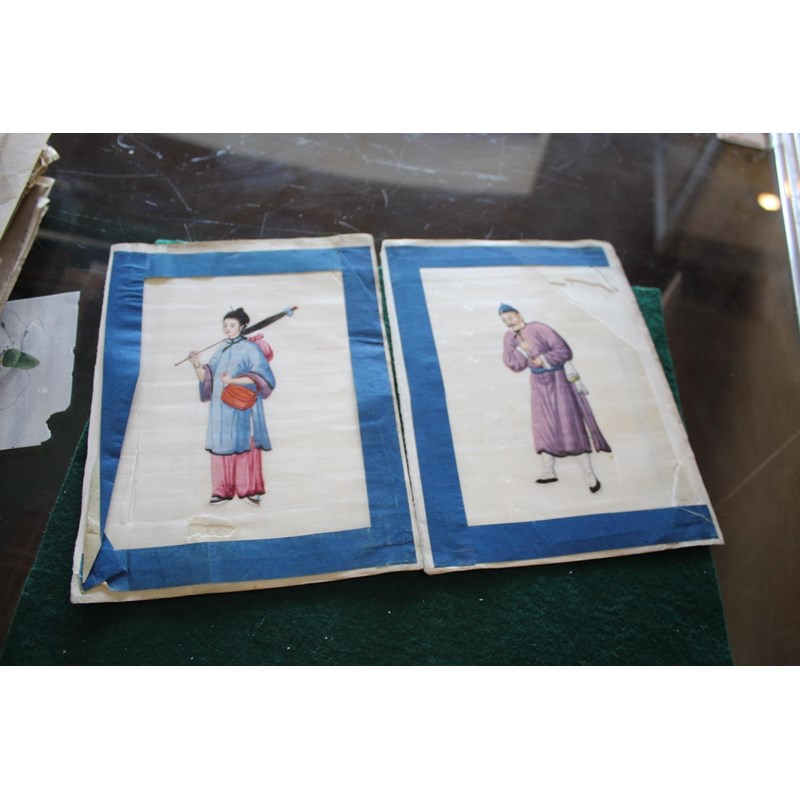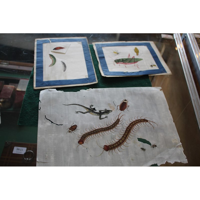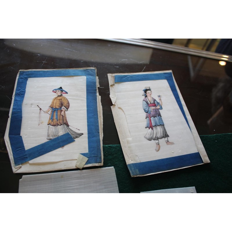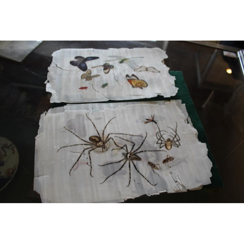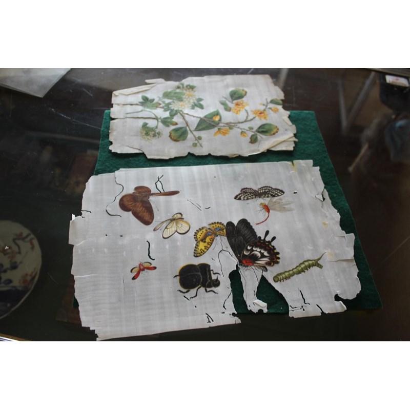 a collection of loose rice paintings, including various figures including a lady seated on a horse, various depictions of Chinese boats, butterflies and insects, flowers etc. In mixed condition.