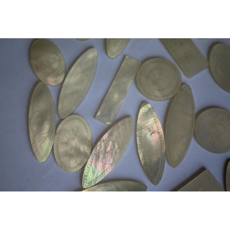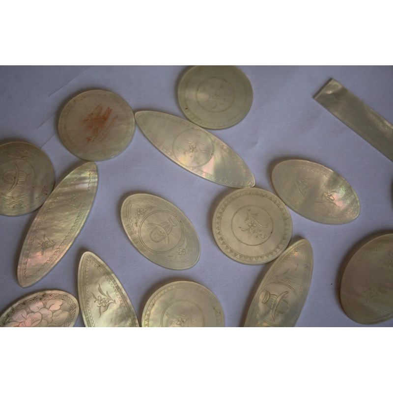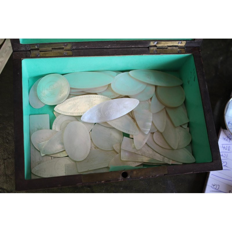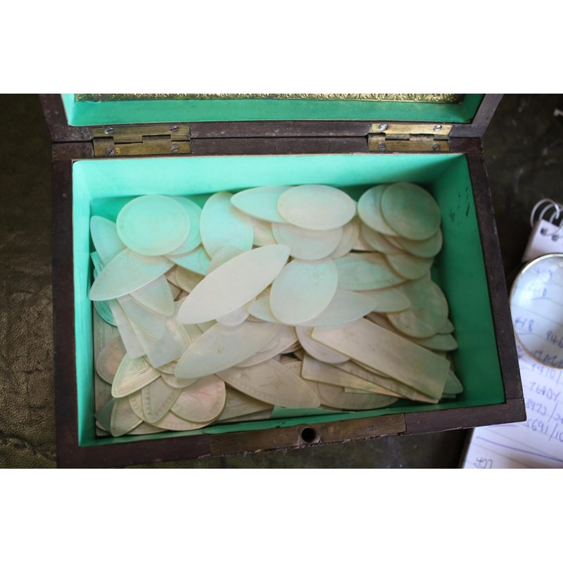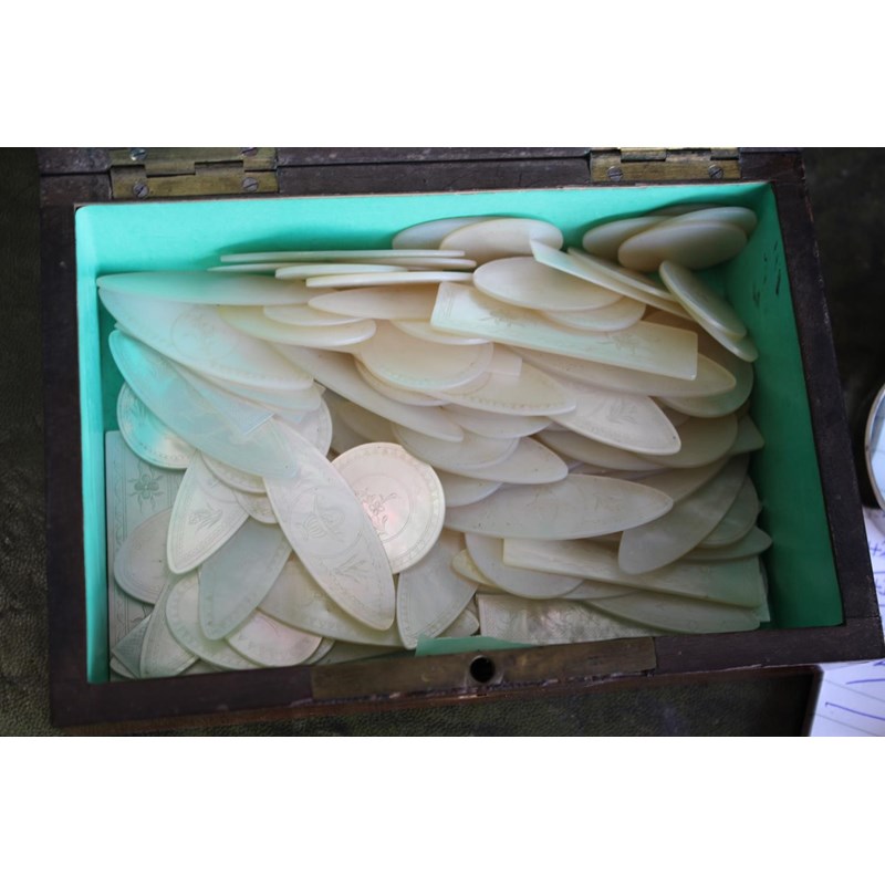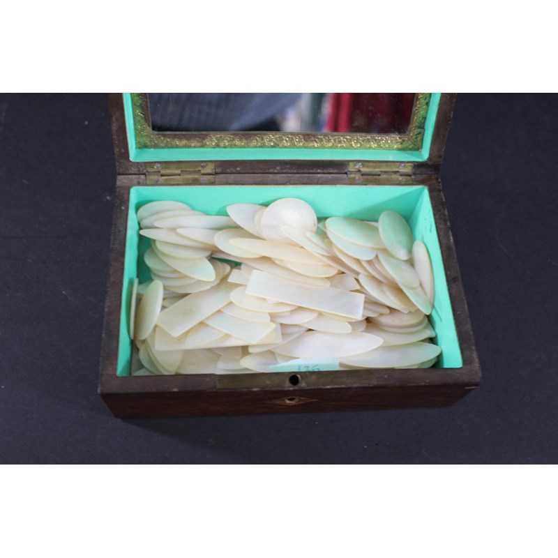 approx 135 mother of pearl counters in a variety of shapes, in a 19thc rosewood and crossbanded box with metal corners.