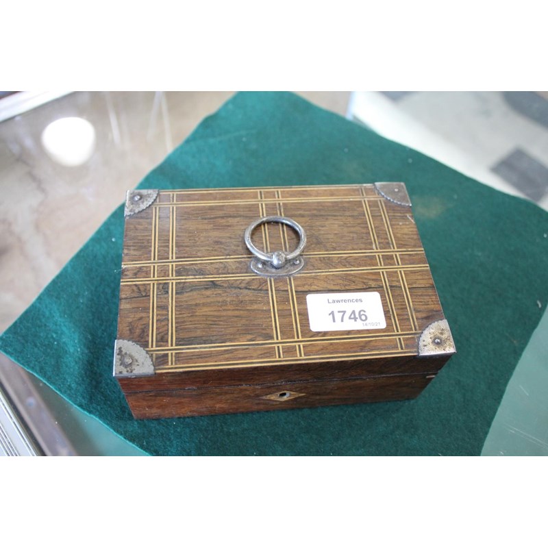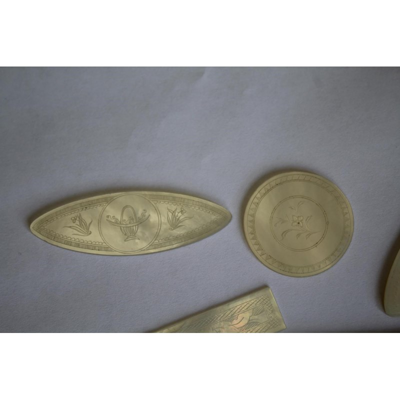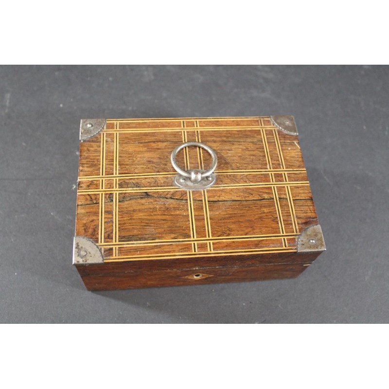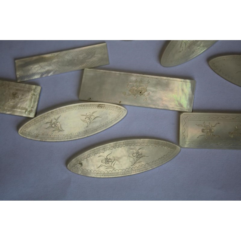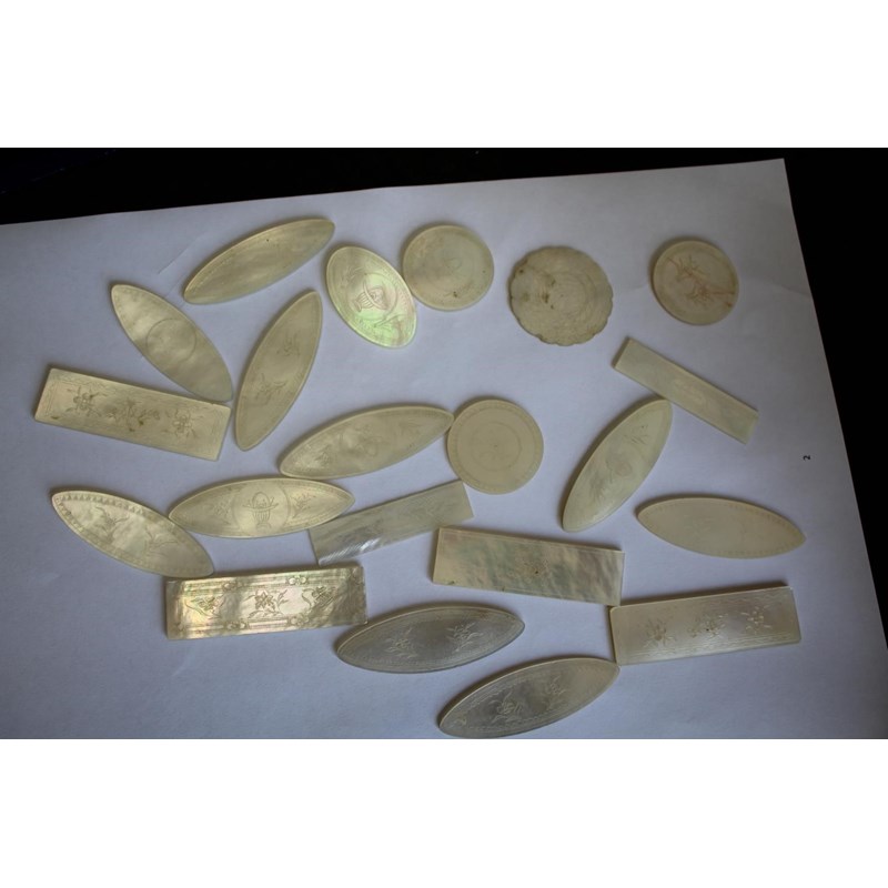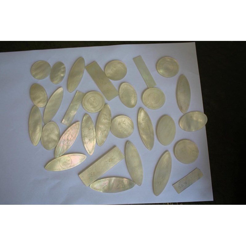 approx 135 mother of pearl counters in a variety of shapes, in a 19thc rosewood and crossbanded box with metal corners.