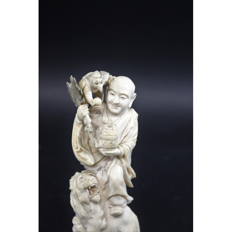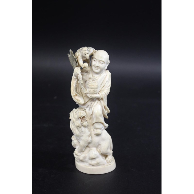 Meiji period, a carved figure of a gentleman standing on the back of a lion, holding a box in one hand and a fan in the other (fan chipped), with a tengu standing on his shoulder and holding a peach. Signed to the base, possibly Shingyoku (possibly Hashimoto Shingyoku). 20cms high