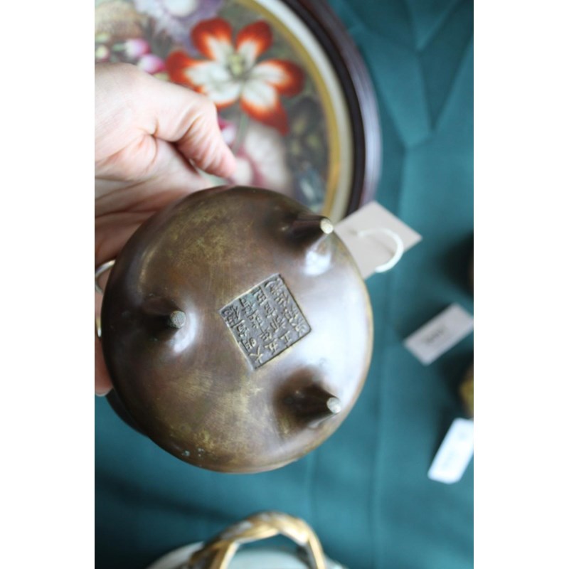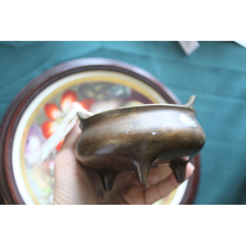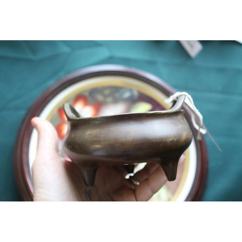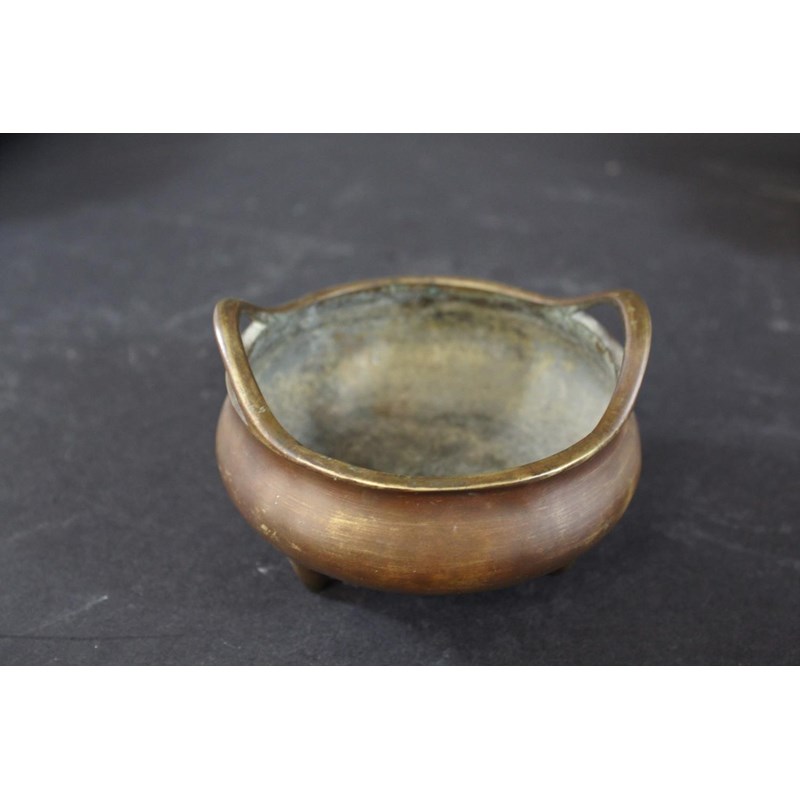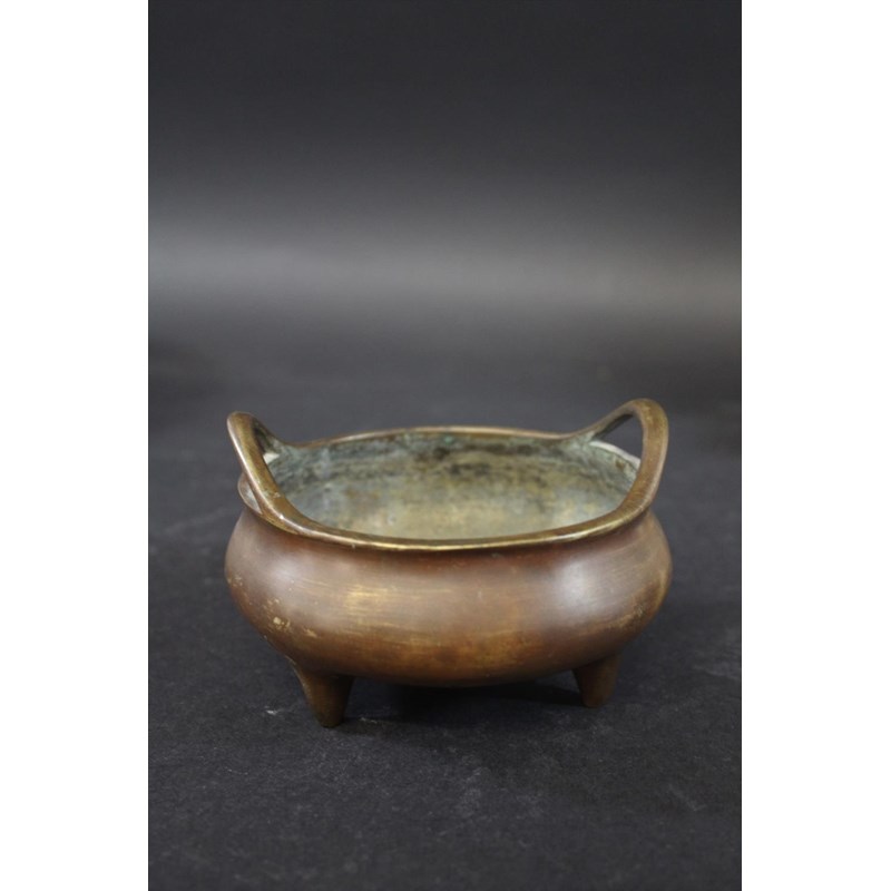 a small bronze censer with curved handles and supported on three tapering feet. Ming Xuande mark, but probably 18th/19thc. 11.5cms across, 8cms high