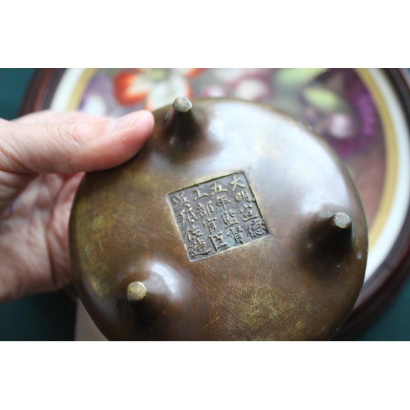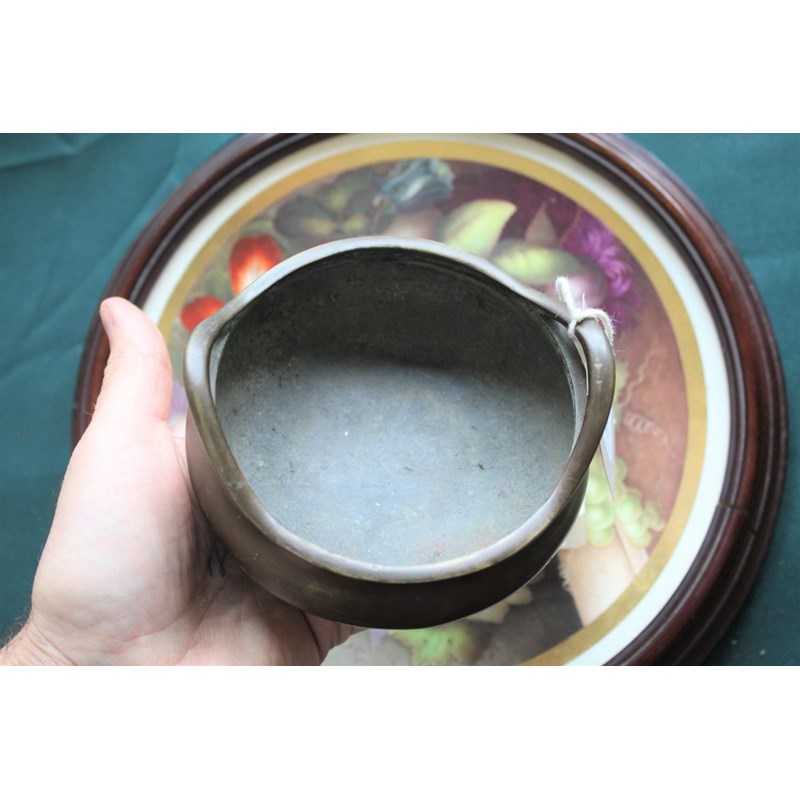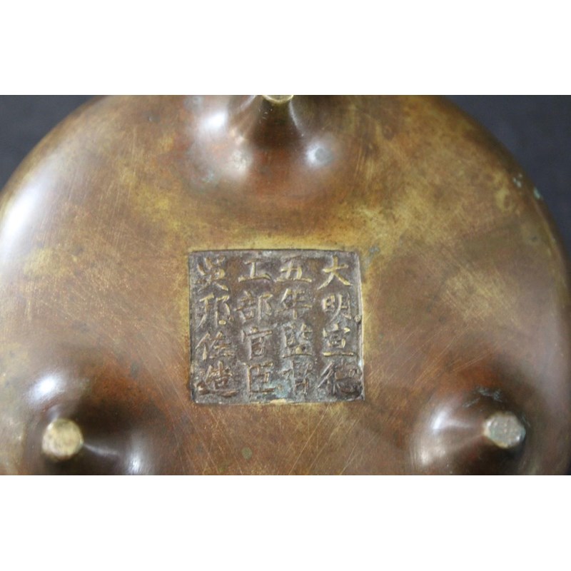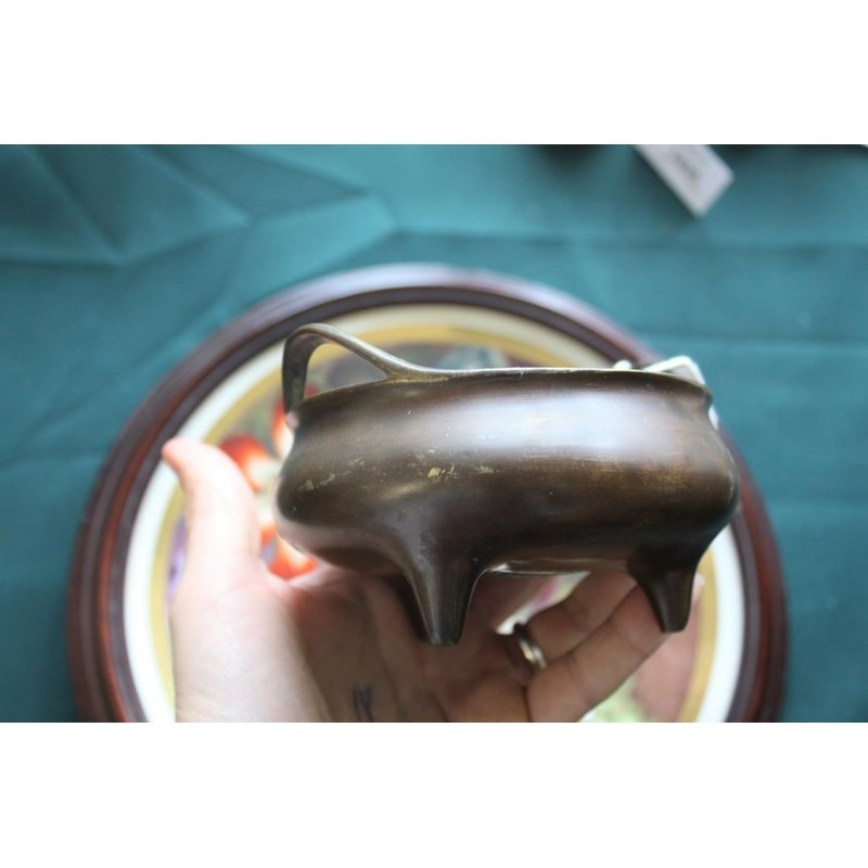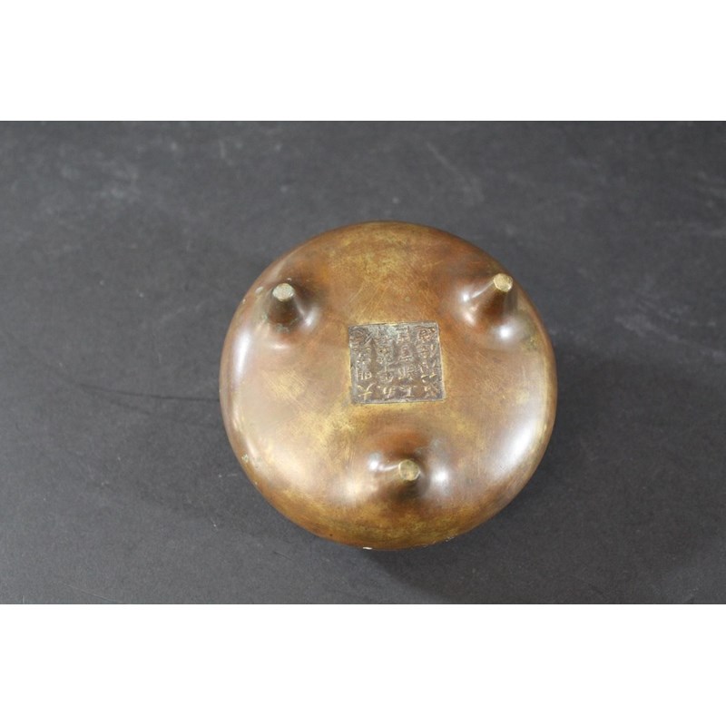 a small bronze censer with curved handles and supported on three tapering feet. Ming Xuande mark, but probably 18th/19thc. 11.5cms across, 8cms high