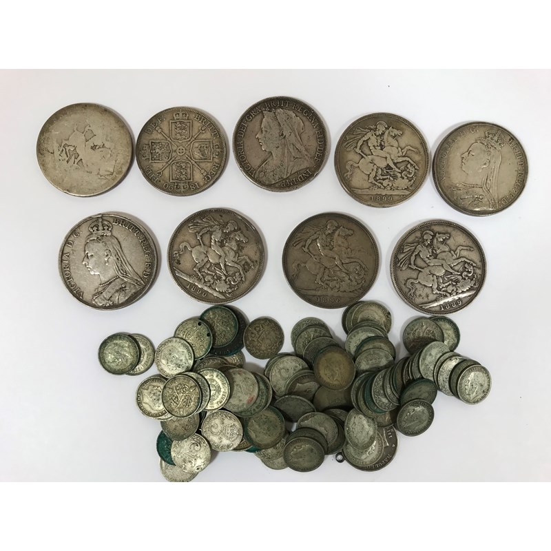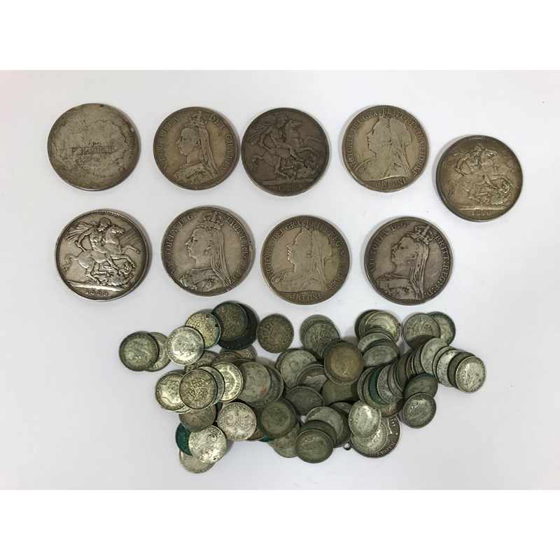 A COLLECTION OF VICTORIAN CROWNS AND SIMILAR. Victorian Crowns: 1889 (2), 1890 (2), 1895 LVIII, 1896 LX edge, 1899 (edge rubbed), another very rubbed an 1890 Double Florin and a collection of 3d pieces. a lot.