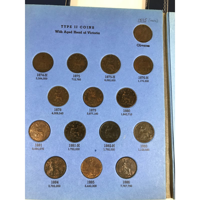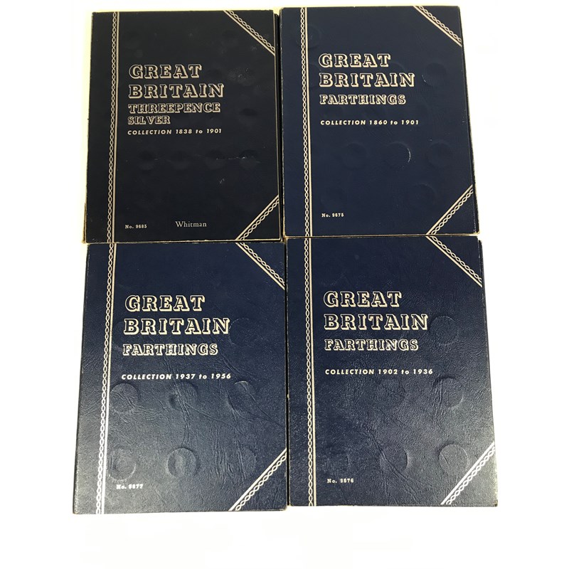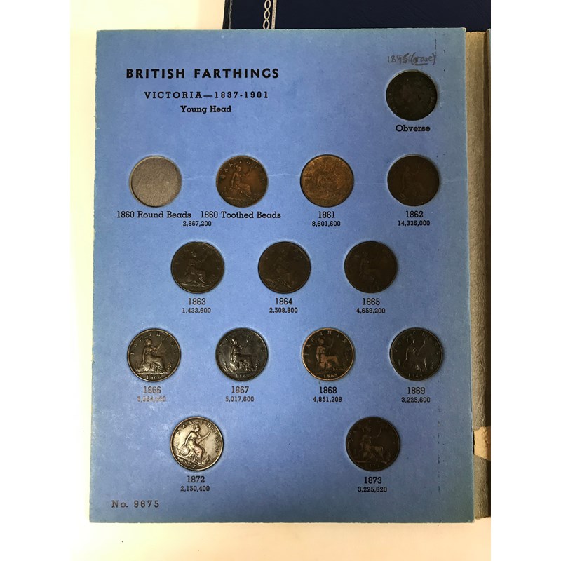 Victorian and later farthings, 1860 - 1869, 1872 - 1888, 1890 - 1956. Some duplicates, contained in 3 Whitman folders and an empty Threepence folder. 105 coins.