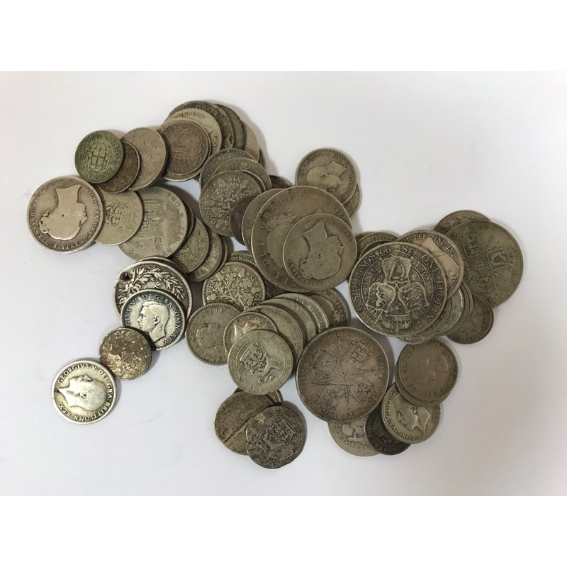 A Victorian Halfcrown dated 1874, Florins 1888 and 1889, 1921. Shillings 1846, 1874, 1881, 1875, 1899, 1922, 1928, and various other sixpence and threepence coins, all poor state. 69 coins.