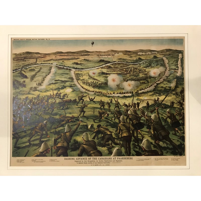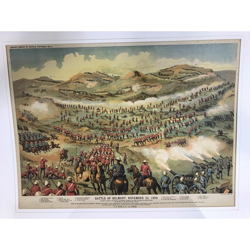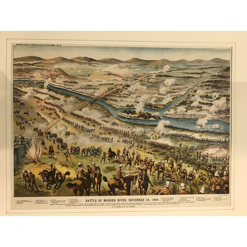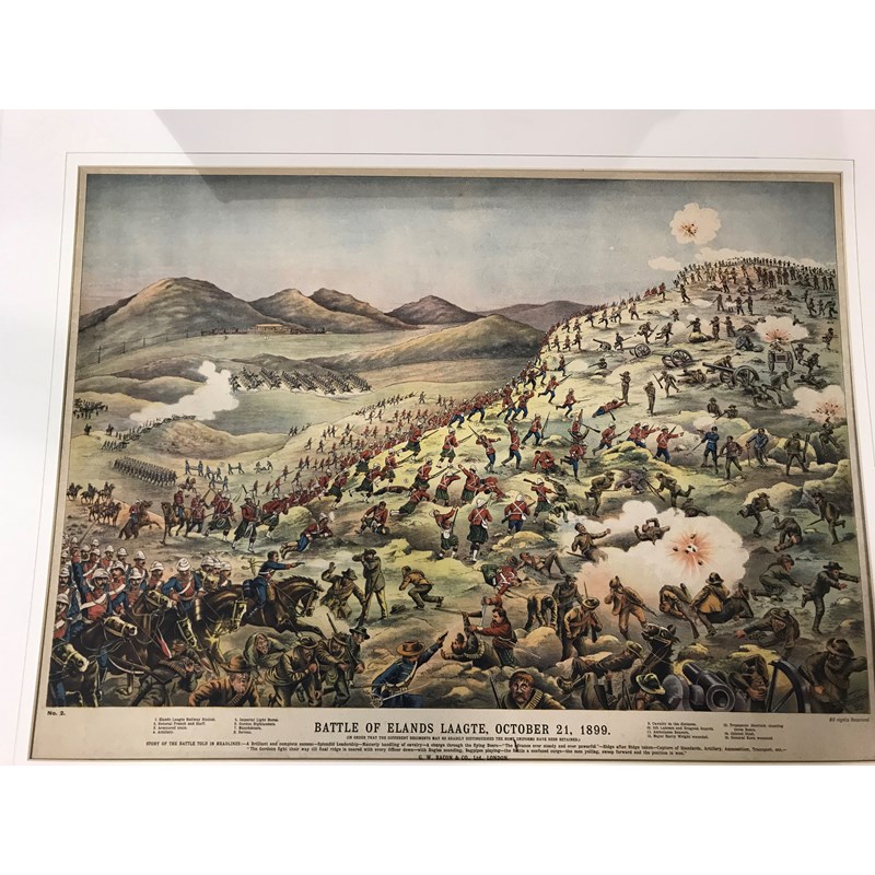 A part set of G.W. Bacon's South African Battle Pictures, colour prints after A. Sutherland. No1. Battle of Dundee (Glencoe, October 20, 1899 with instructive descriptions and details telling the story of the battle. Mounted on board with surround but unframed, image 56 x 76 cm. Including Nos 1, 2, 3, 4, 5, 6, 7, 8, 10, 11,