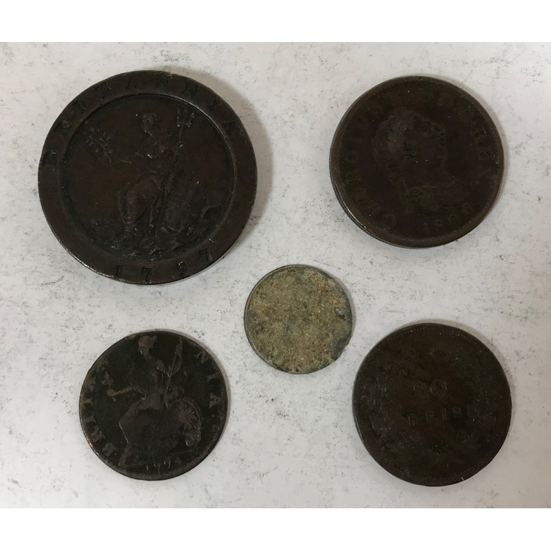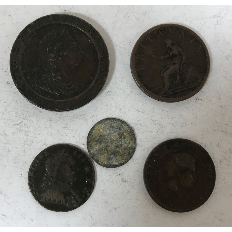 A George III 'Cartwheel' twopence dated 1797, a fourth issue penny dated 1806, a 1774 halfpenny and two further coins. 5 coins.