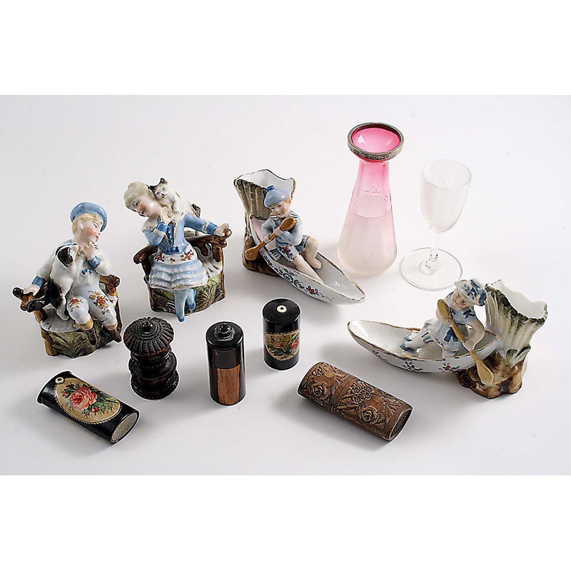 in the form of a vase by Hilliard & Thomason, Birmingham 1900, a clear glass example in the form of a goblet, two pairs of Continental porcelain examples, two papiermache "go to bed" vestas and three wooden examples; the vase 4.5" (11.5 cms) high (11)